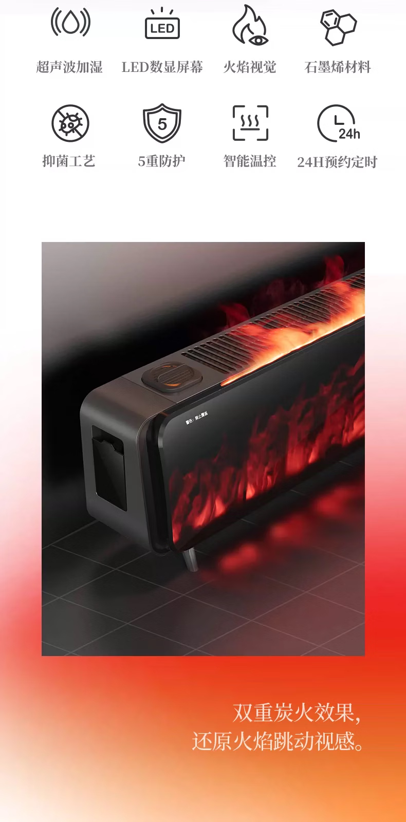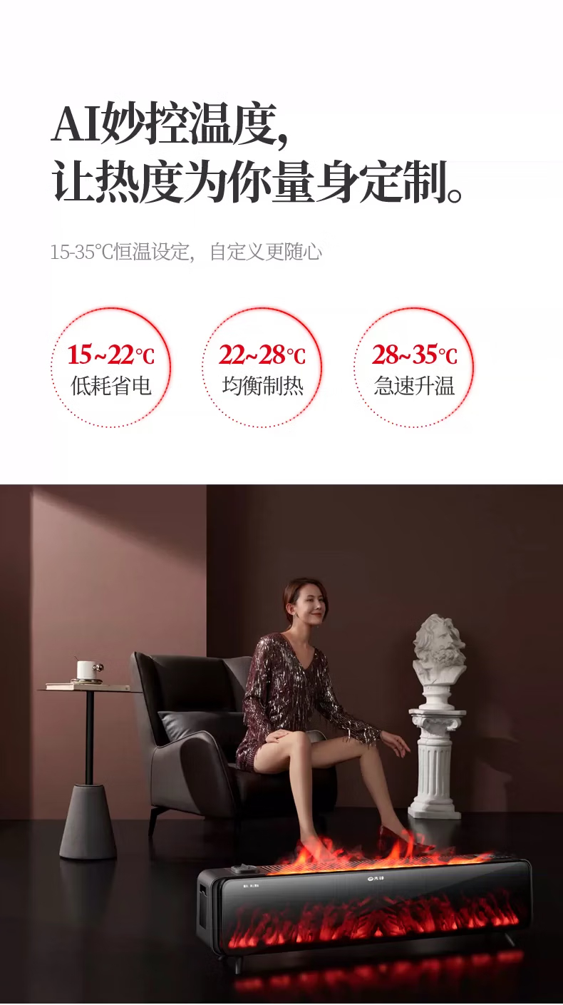 先锋石墨烯踢脚线取暖器家用智能控温防水电暖器仿真火焰电暖气大面积 先锋+DTJ- YT1R-IOT+取暖器+黑色