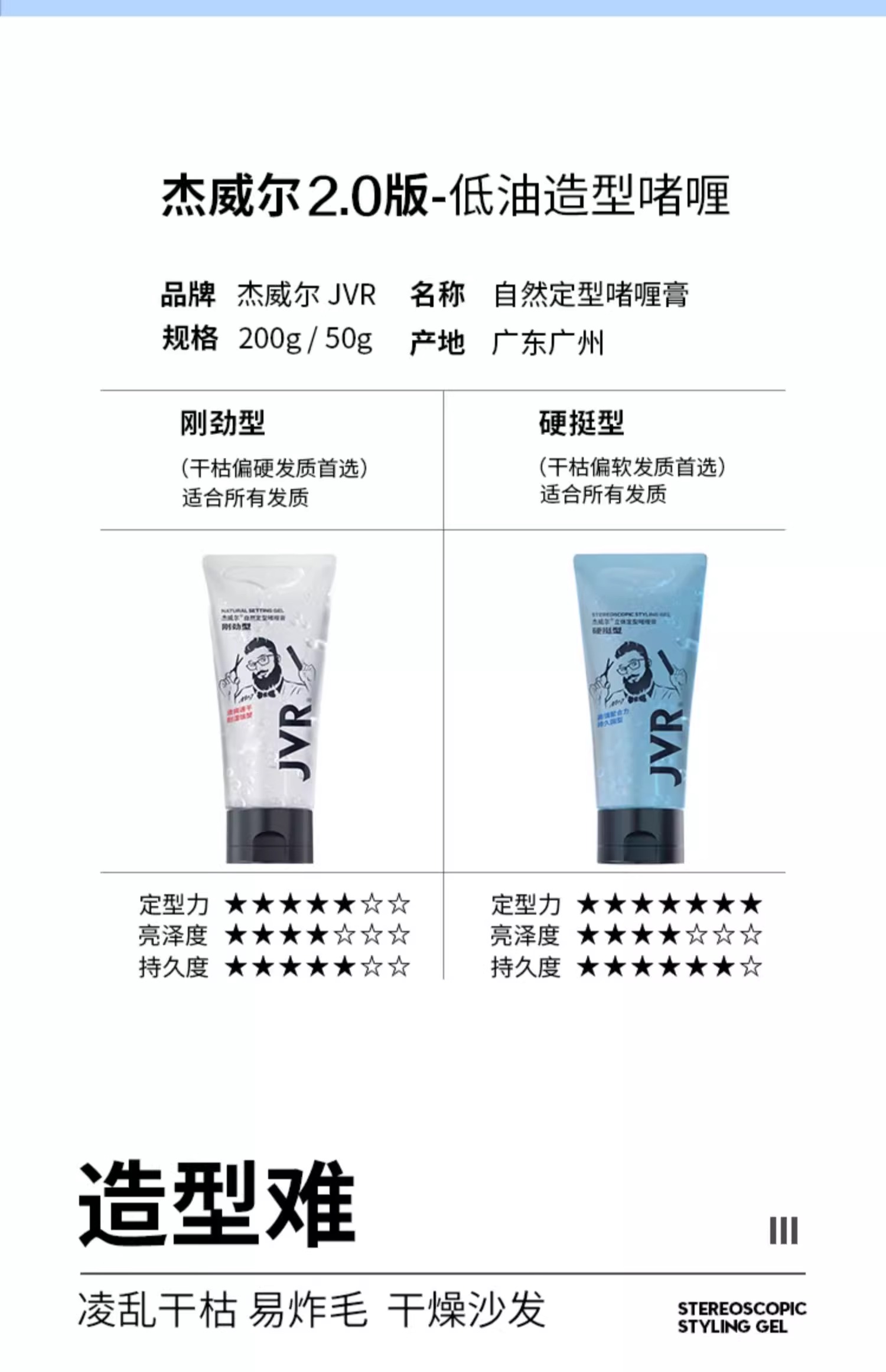 JVR杰威尔便携装啫喱膏男士持久定型保湿水咖喱水油头大背头清香