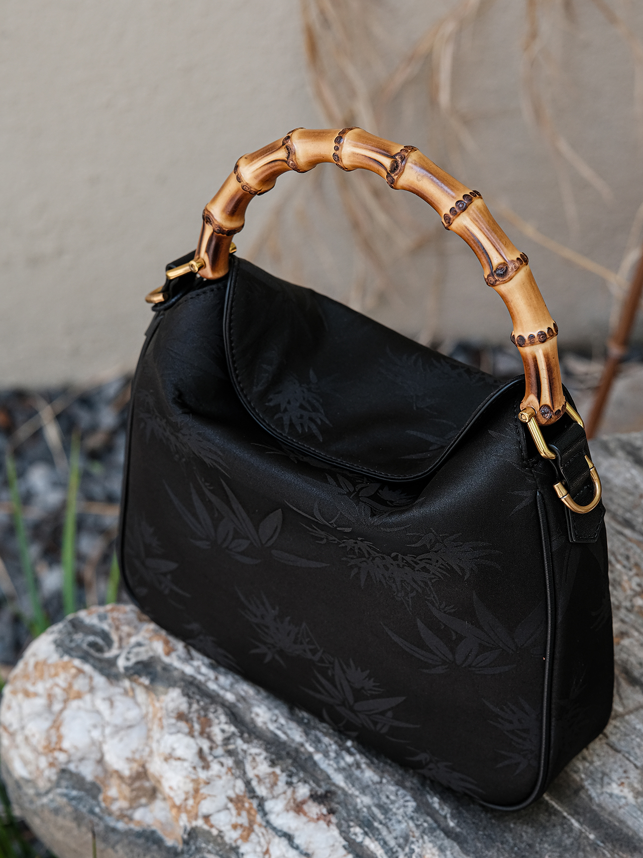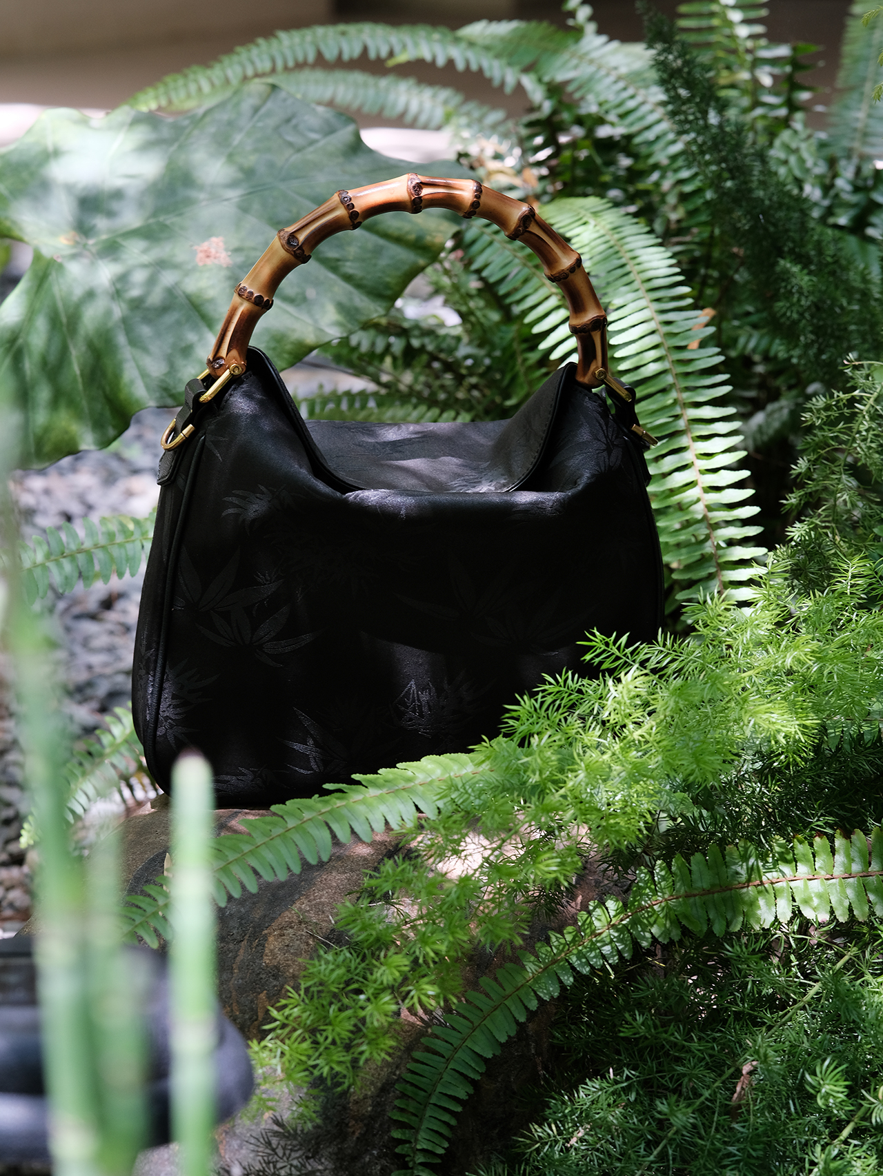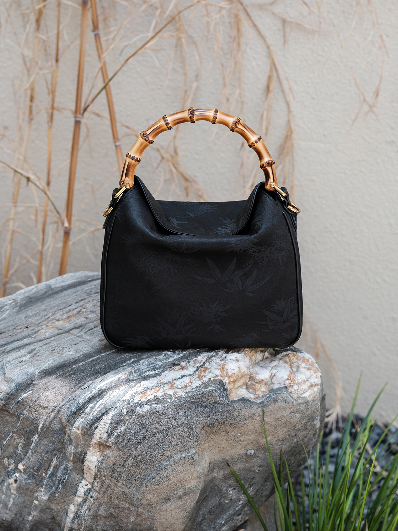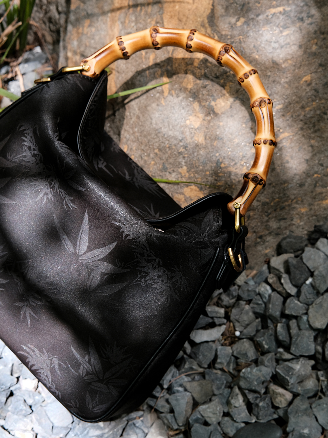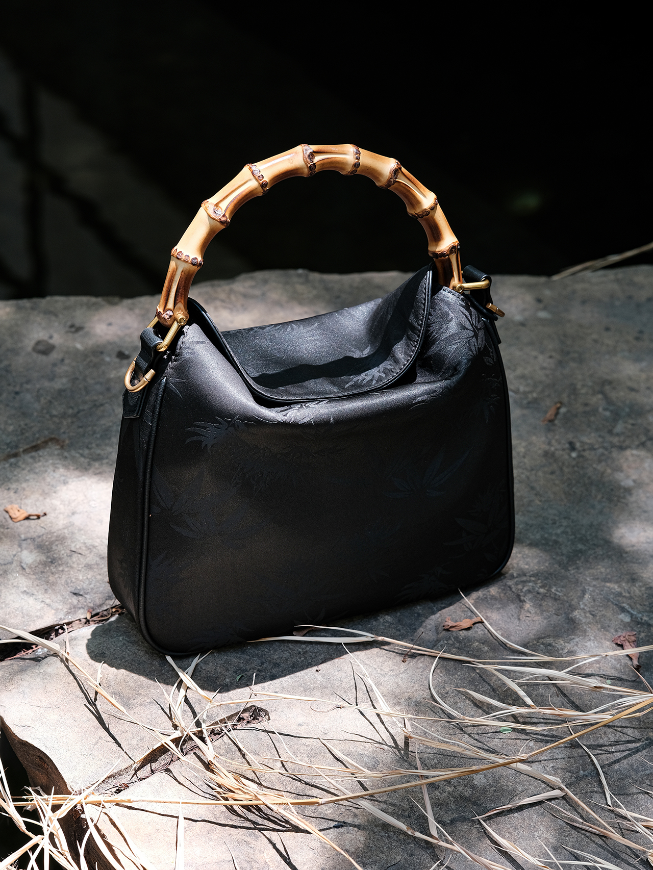 盛唐婧 |真丝香云纱竹叶纹竹节手提包(特价品.特殊商品不退不换)