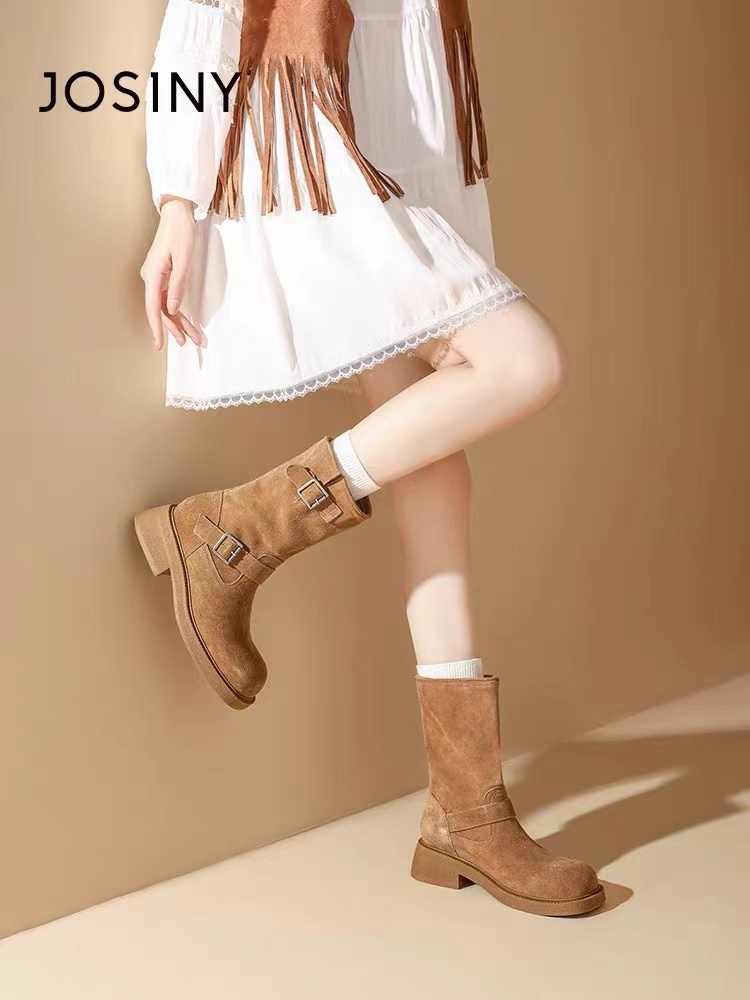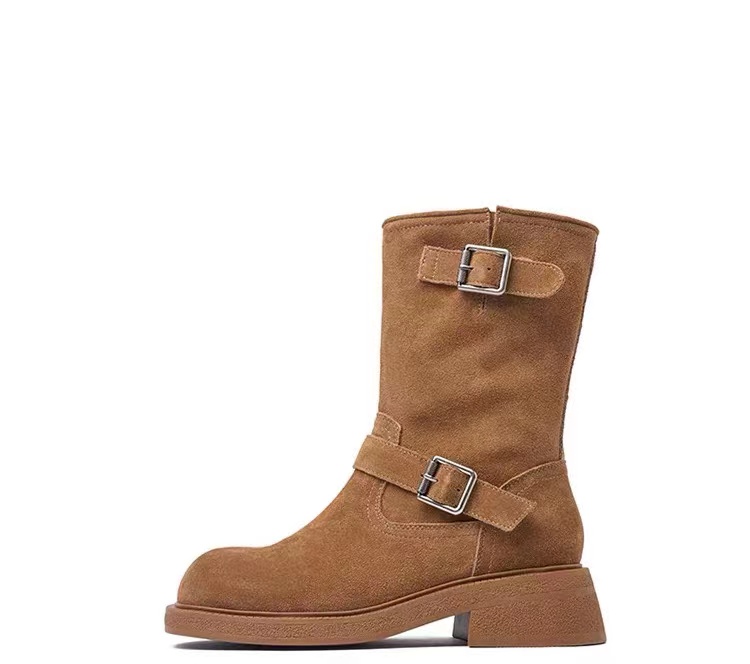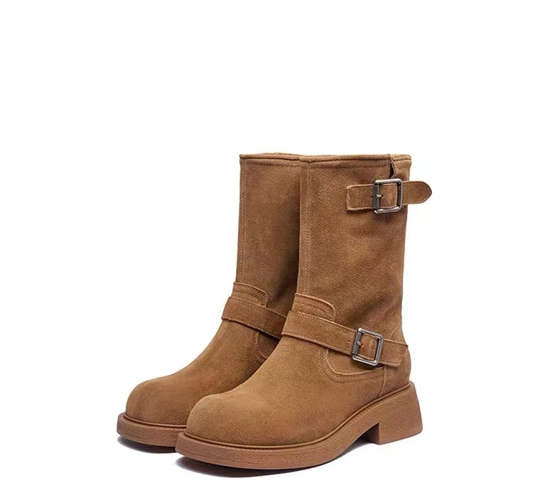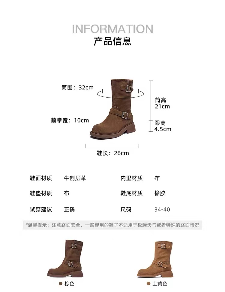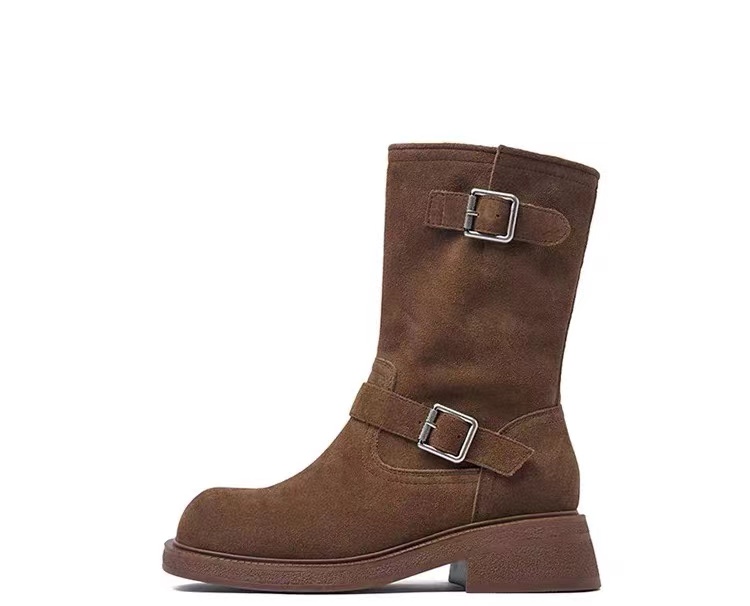 D110761复古堆堆靴女2025新款秋冬中筒西部牛仔靴复古皮带扣马丁靴