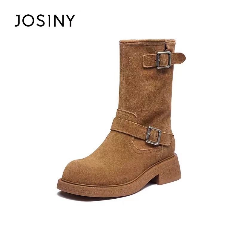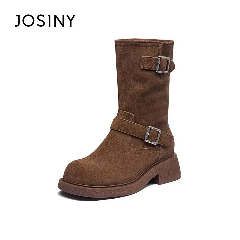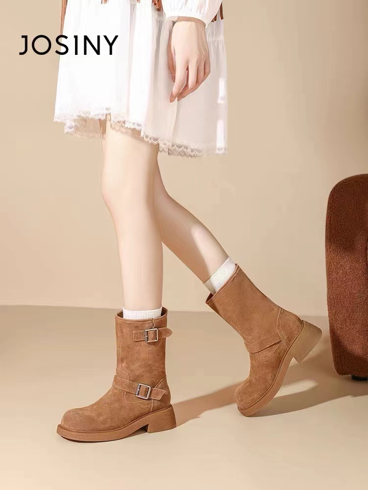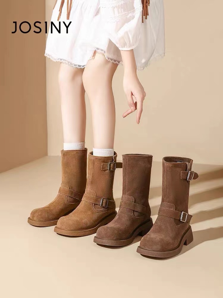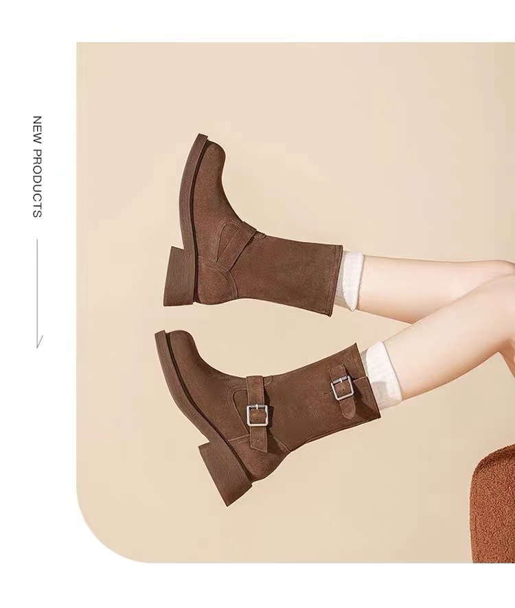 D110761复古堆堆靴女2025新款秋冬中筒西部牛仔靴复古皮带扣马丁靴