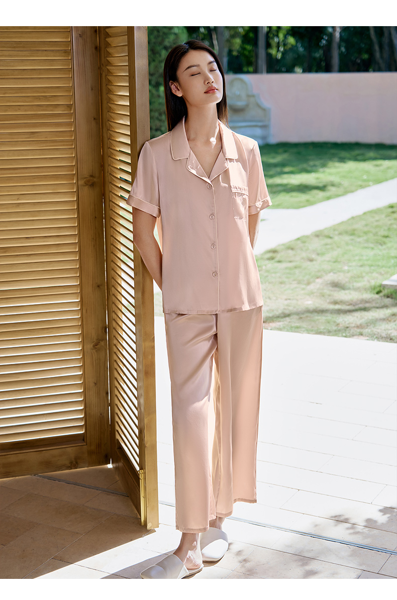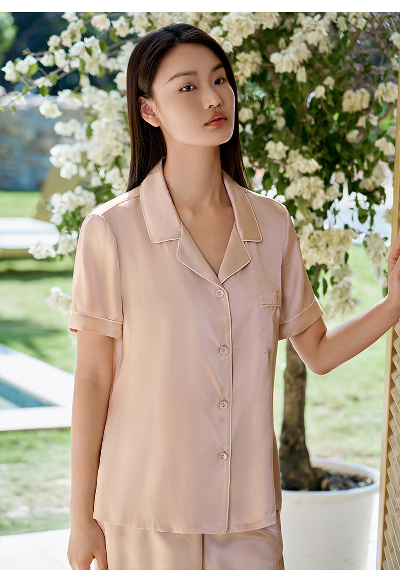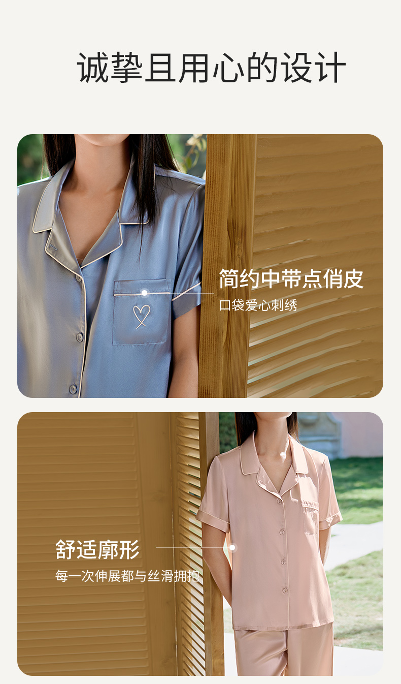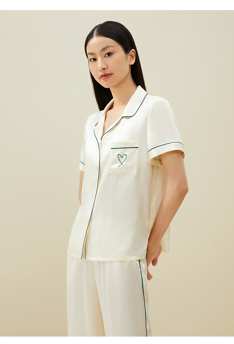 小爱心刺绣】真丝睡衣女100%桑蚕丝简约短袖衣裤套家居服金三塔 YSFAA405-22