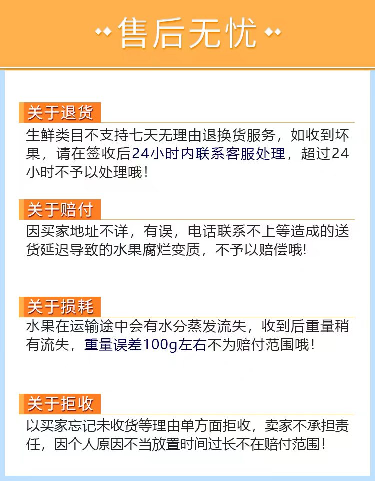 收到快递后请及时检收,如遇果品问题请在收件后24小时内联系客服,提供照片和单号📷,拒接无图索赔,如若超出收件时间太长,因储存不当造成水果变质则不在售后范围。