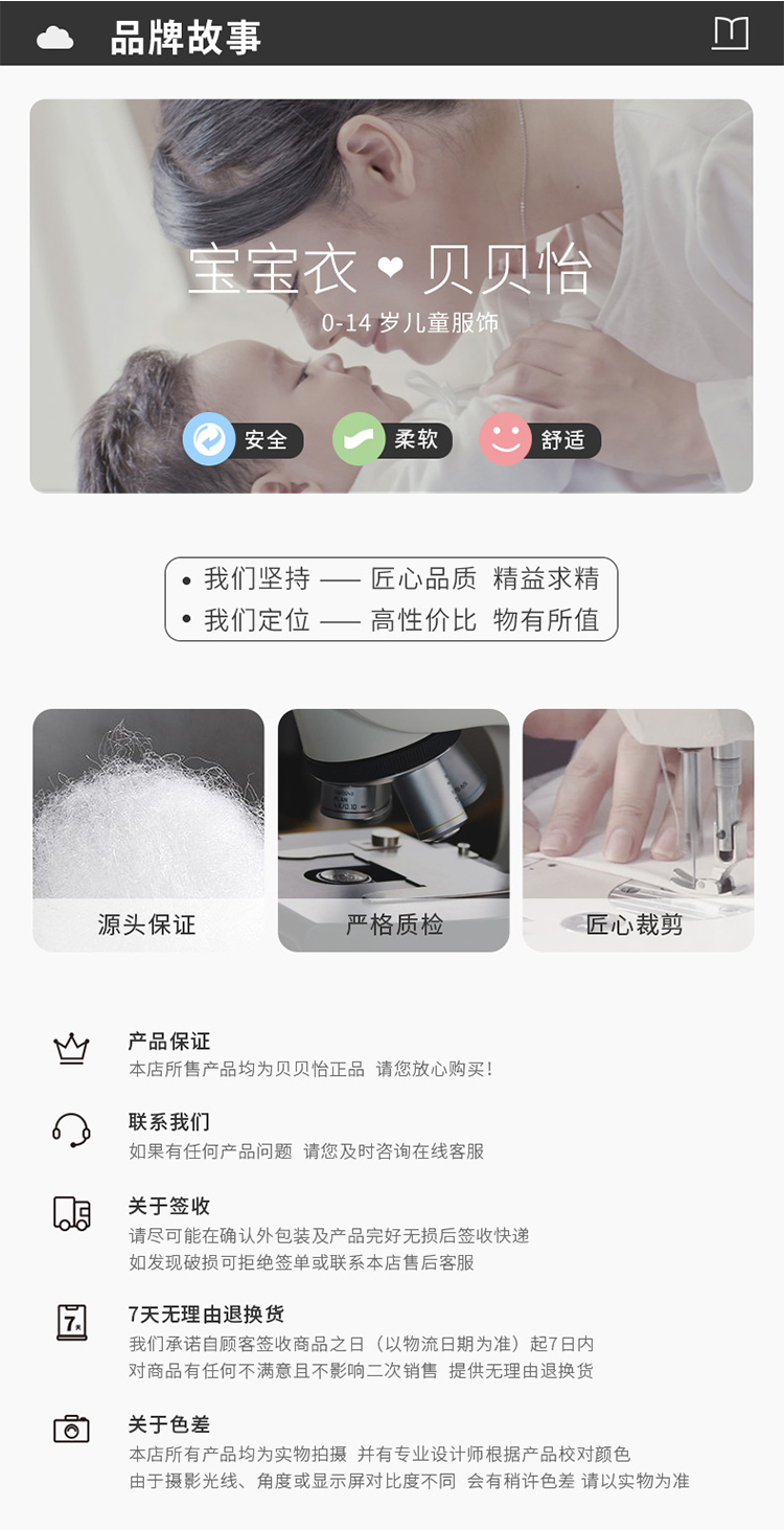- 贝贝怡专注0-6岁婴幼儿服饰,坚持安全、柔软、舒适的产品理念,为千万中国家庭提供超高品质、安全可靠的婴幼儿服饰产品,妈妈放心,宝宝开心!