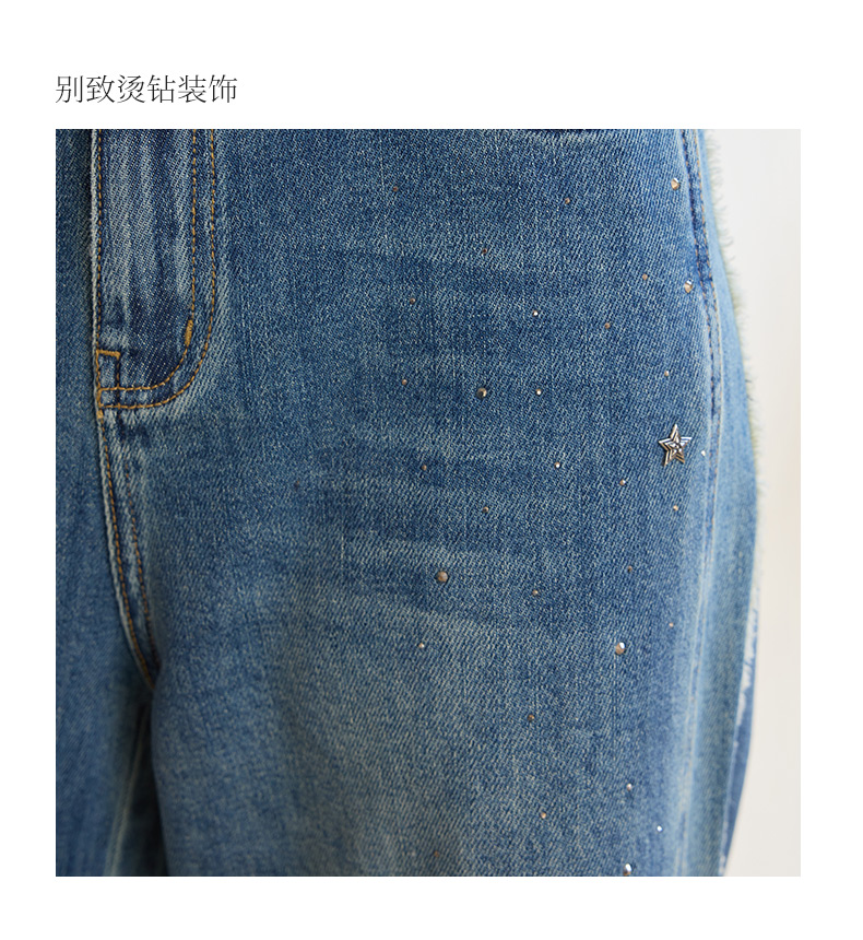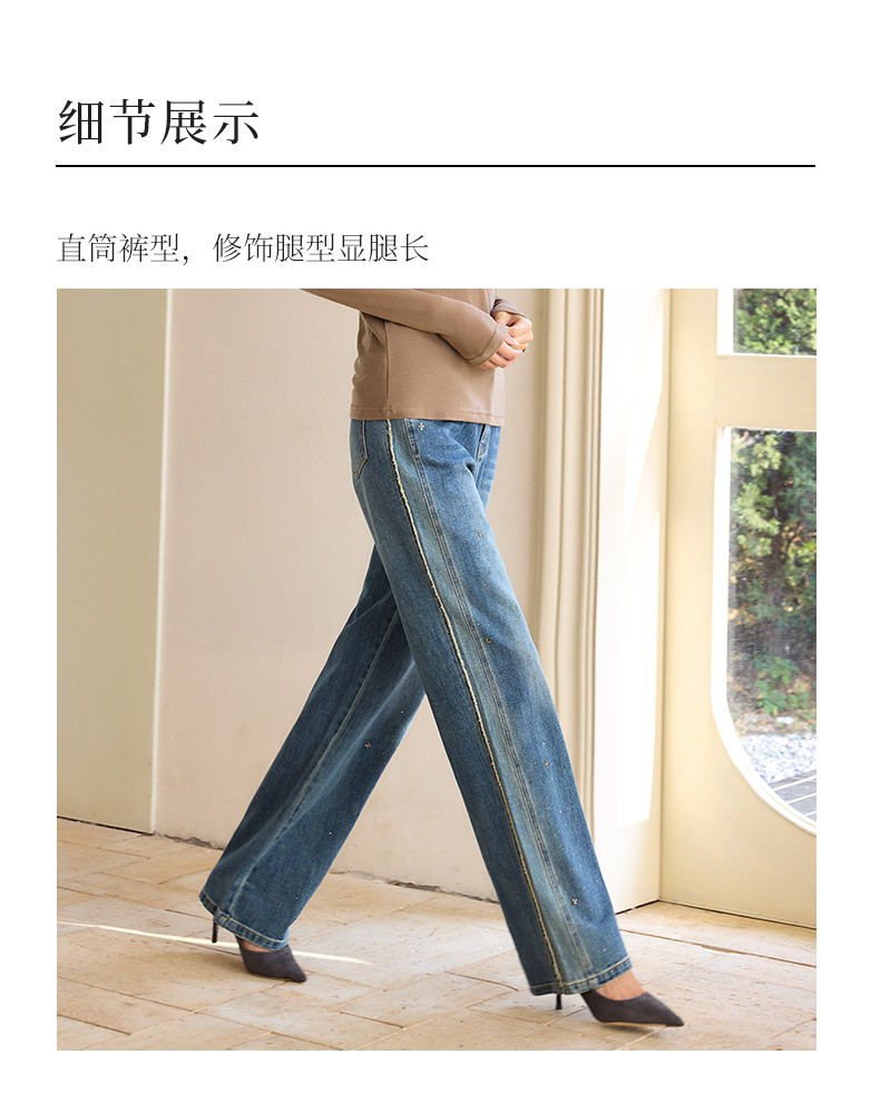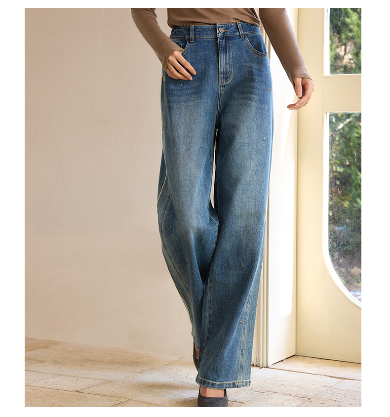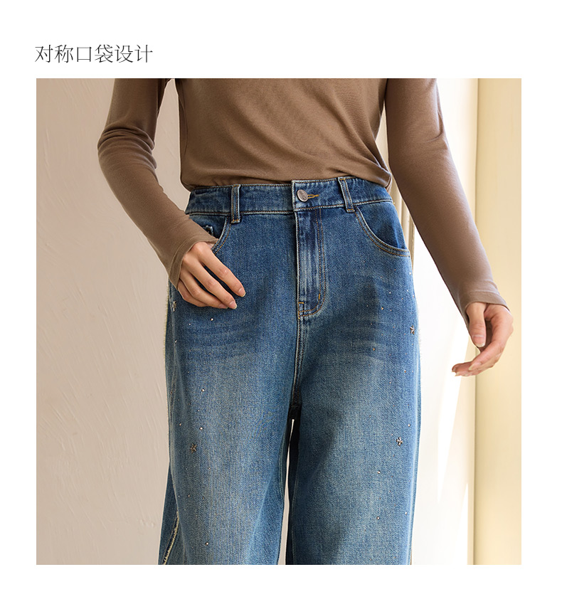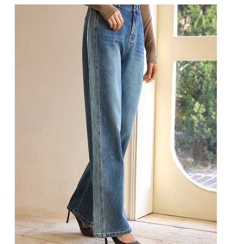 玳莎烫钻宽松牛仔裤女2025年春季新款侧缝毛边时尚百搭显瘦直筒裤 FA36301