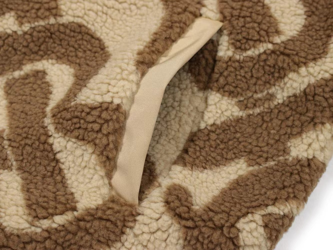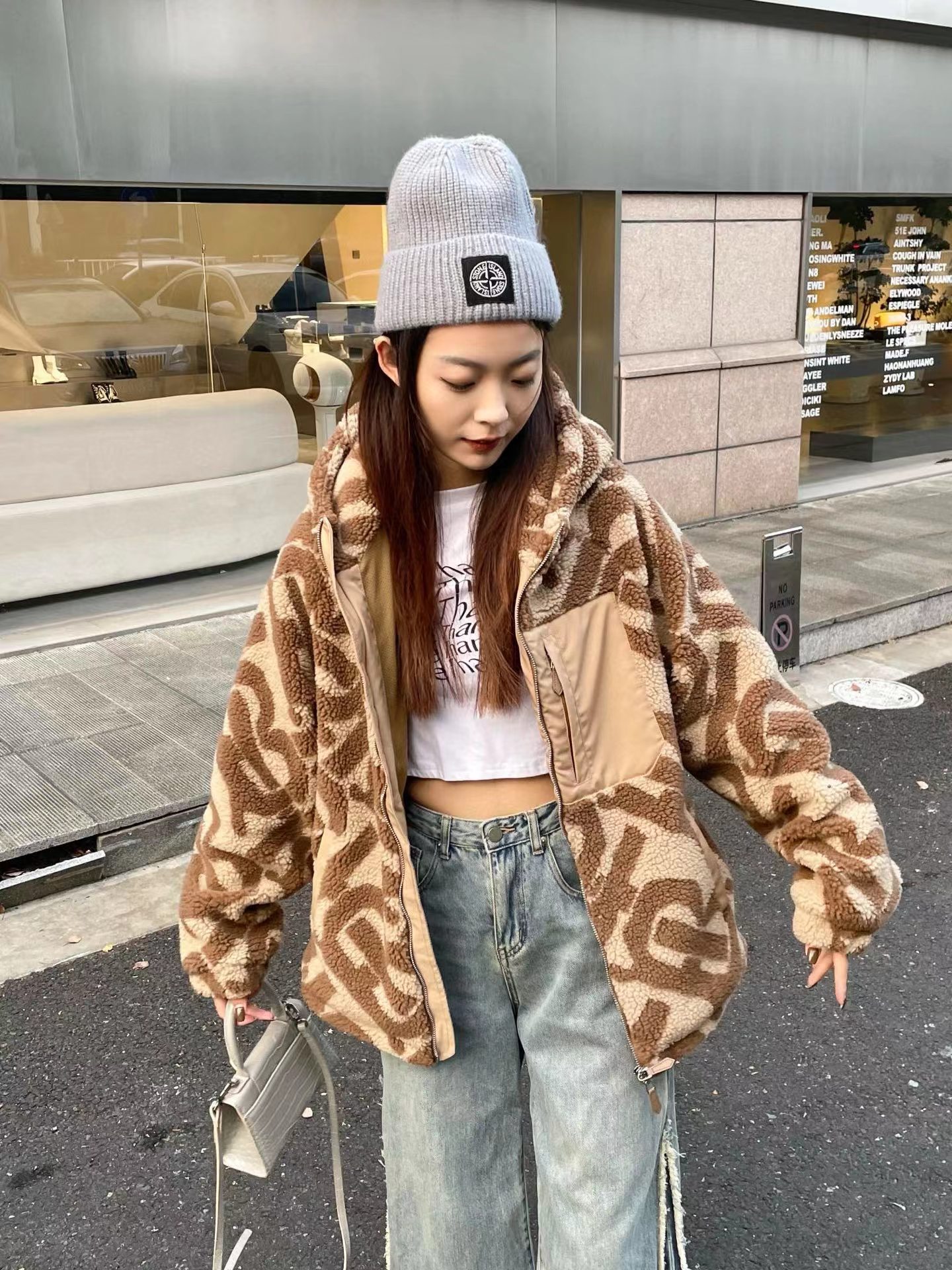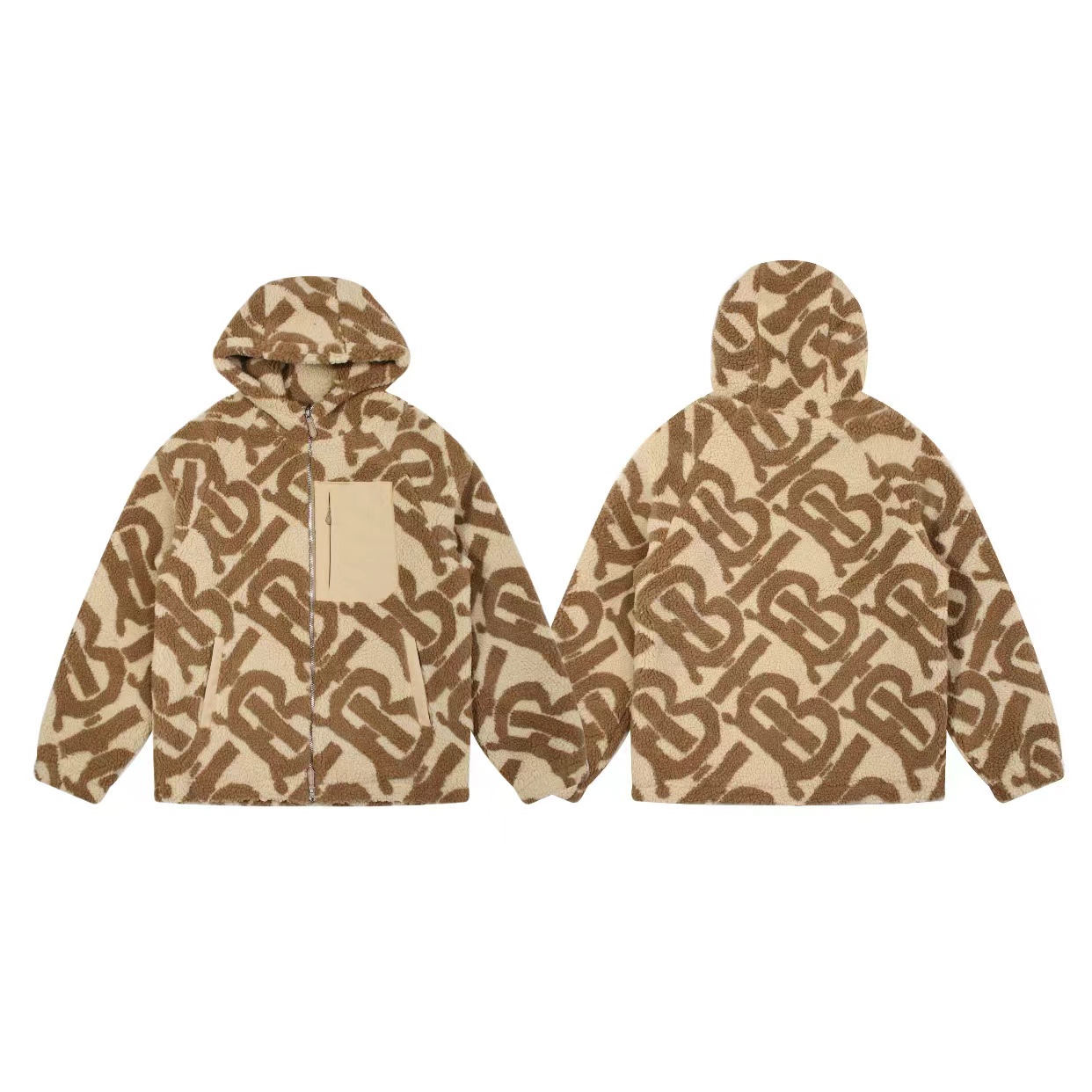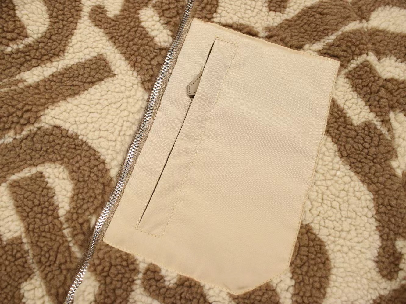 老花满印情侣连帽羊羔毛夹克加棉外套 面料采用定制羊羔毛面料 舒适 柔软 保暖性好 通过特殊缩水处理 不易变形 胸口口袋贴布