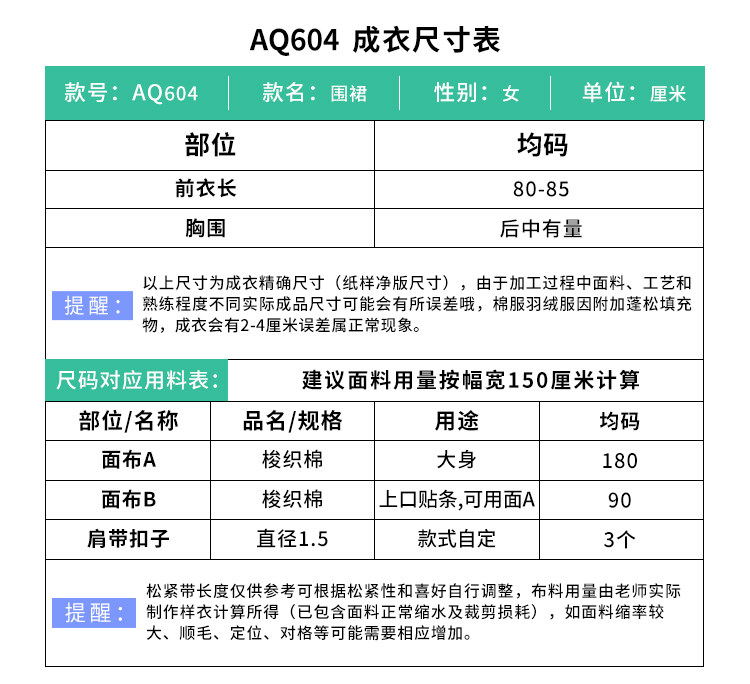 裁缝学苑AQ604加宽加大围裙纸样女装厨房家用新款大码防泼水工作服样板