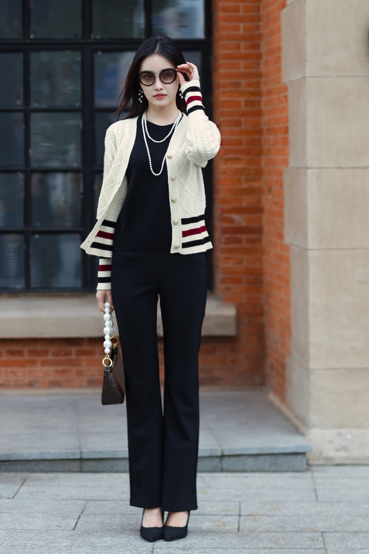 这套组合同时拿捏老钱风和时髦知识分子风,给人一种简约有学识性又不失时髦的感觉,麻花毛衣作为经久不衰的时尚单品,可精致优雅也可休闲利落!