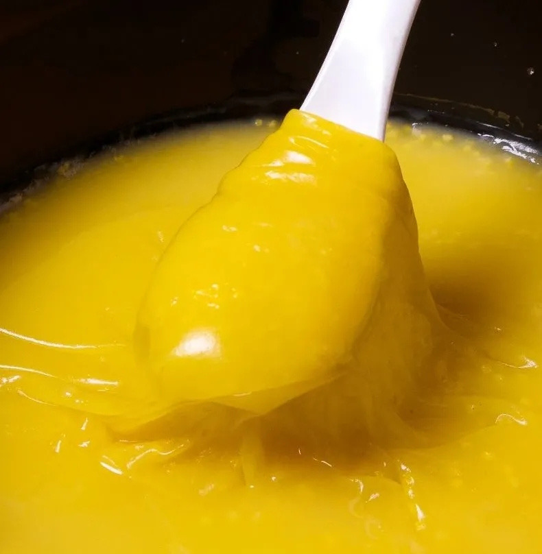 *米脂小米熬成粥,表面有一层特别浓稠、厚重的米油。待米油冷却后,会形成金黄色的米皮,用勺子或筷子可以轻轻就起来