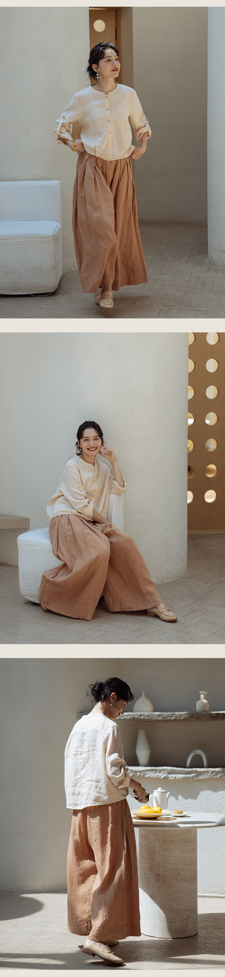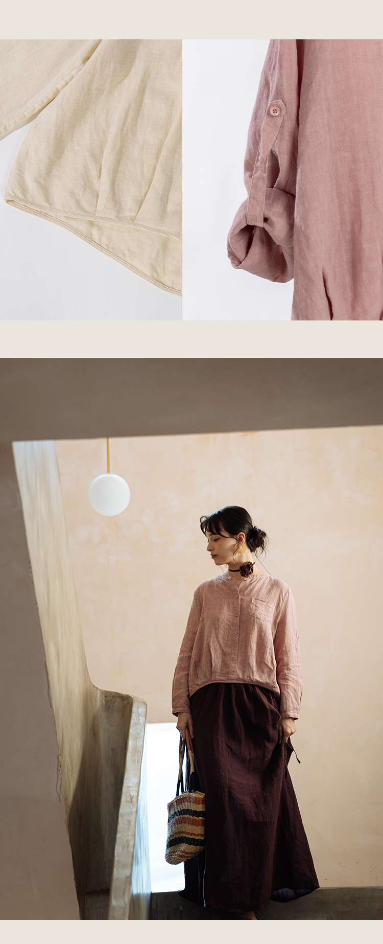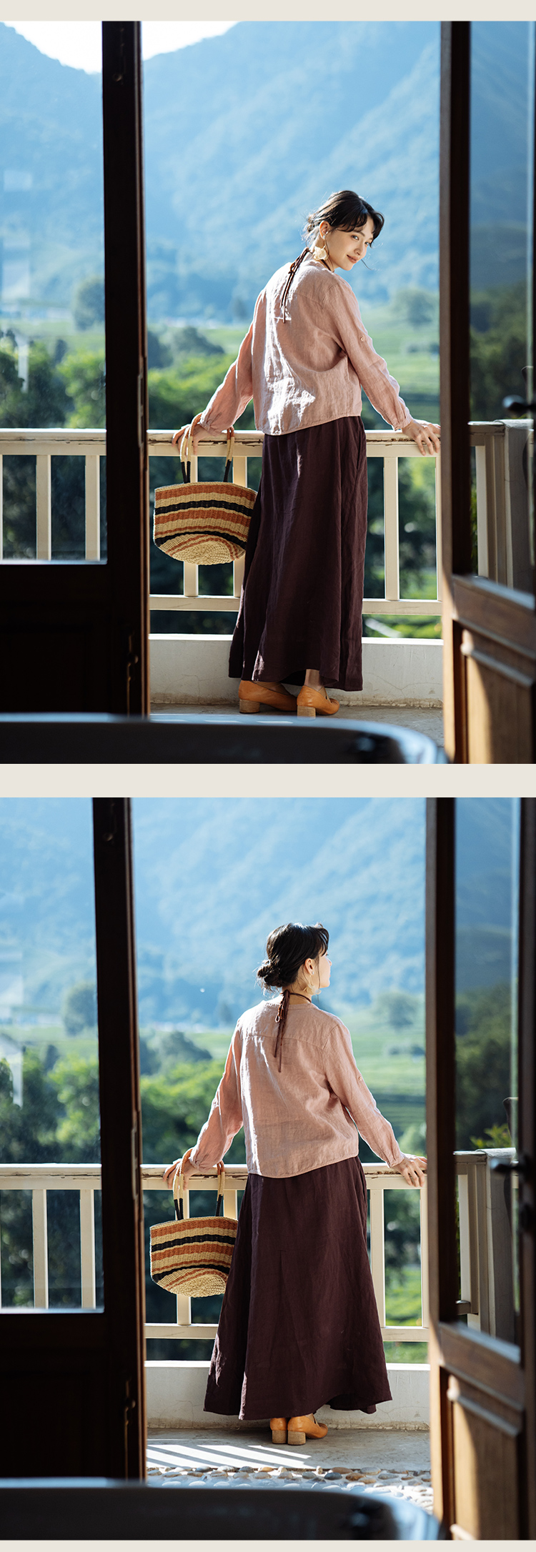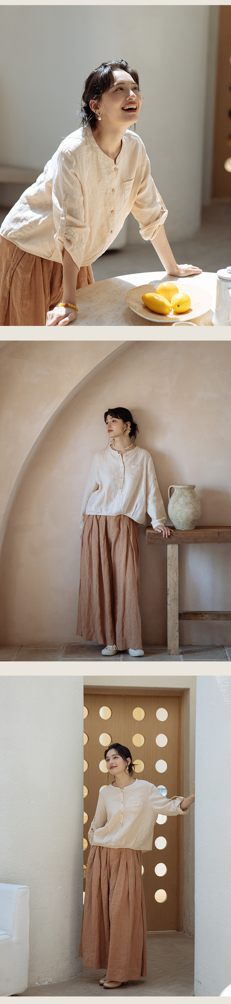 绽放632朵【甜茶系列】肉桂色干洗亚麻夏季长袖衬衣小衫