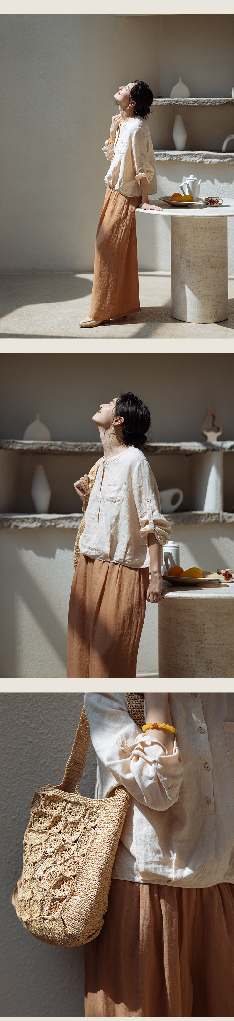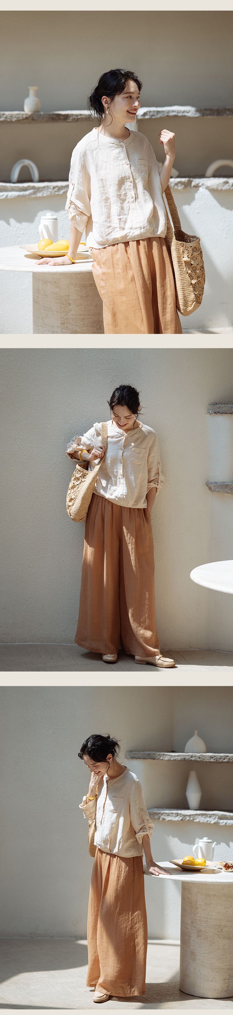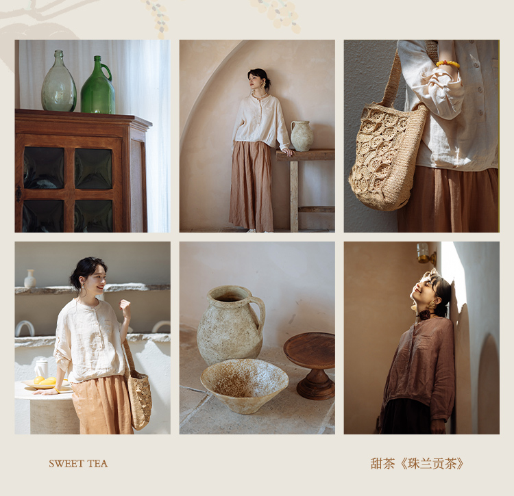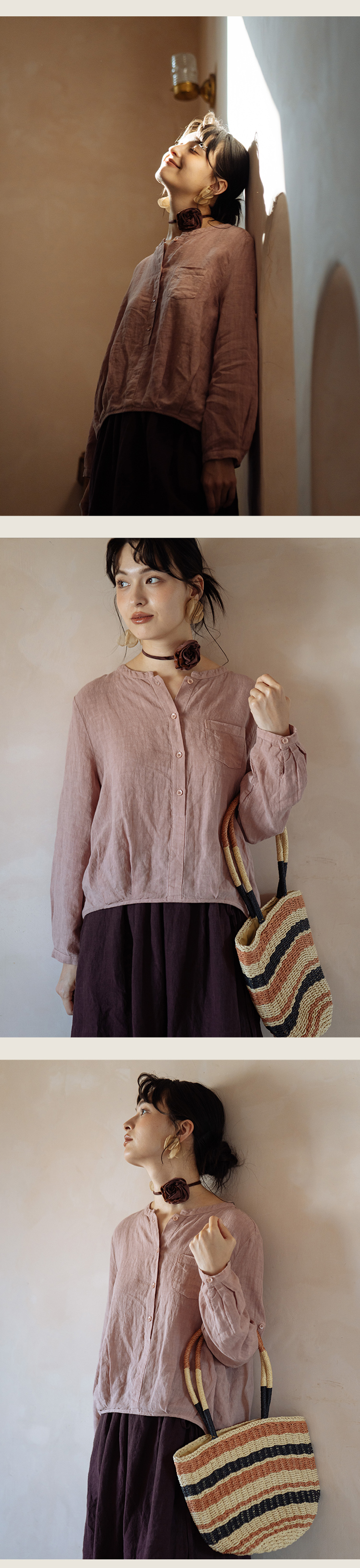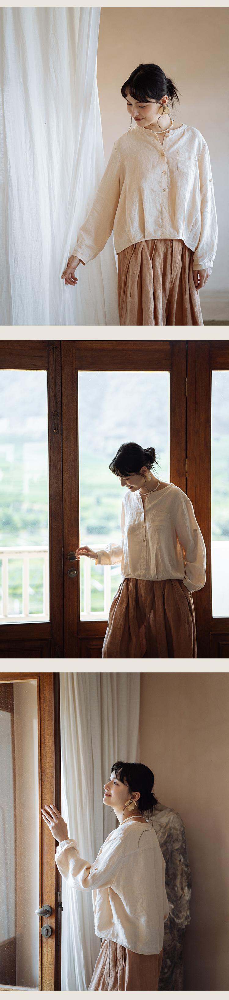 绽放632朵【甜茶系列】肉桂色干洗亚麻夏季长袖衬衣小衫