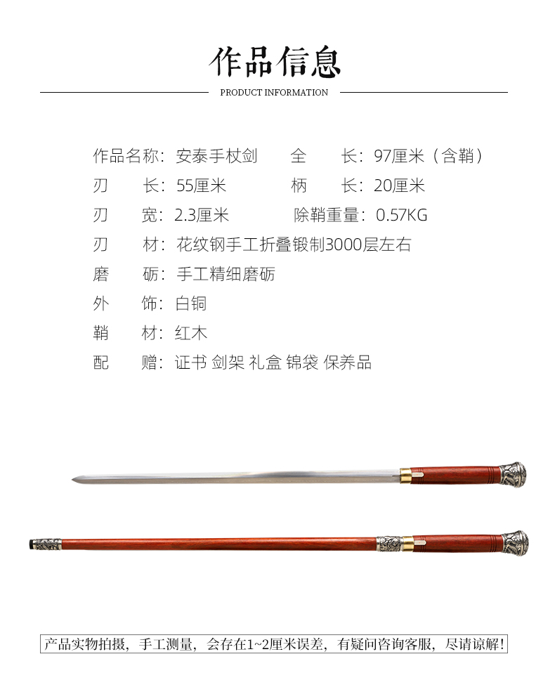 安泰手杖剑 拐杖剑 花纹钢 龙泉沈广隆宝剑 传统收藏剑 未开刃