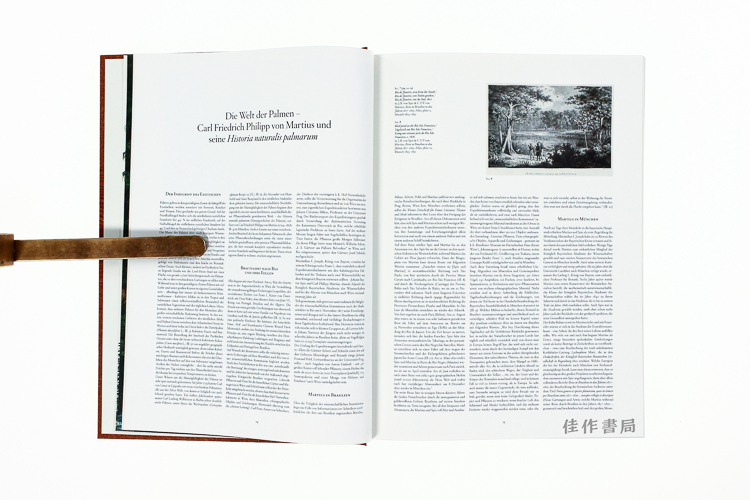 在这部史诗般的著作中,冯·马蒂乌斯概述了棕榈的现代分类方法,绘制了首批棕榈植物地理学地图,描述了巴西所有的棕榈种类,并整理了已知的所有棕榈科属。除了自己收集的标本和笔记外,冯·马蒂乌斯还记述了其他人的研究发现。冯·马蒂乌斯的对开本著作的独特之处在于其包含的横截面图,这些图展示了这些高大树木的结构,而中欧人很难准确想象出这些结构。同样引人注目的是彩色风景画,画中各种棕榈树(通常是孤植的)呈现出一种简约而优雅的美。这部著名的著作是植物插画和分类学领域一座无与伦比的里程碑。