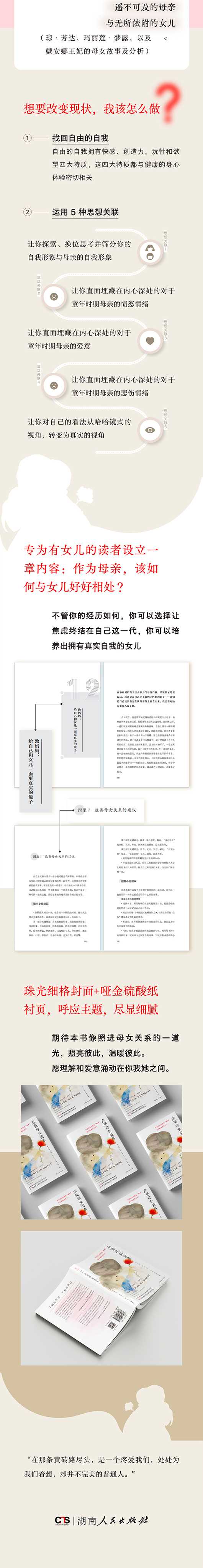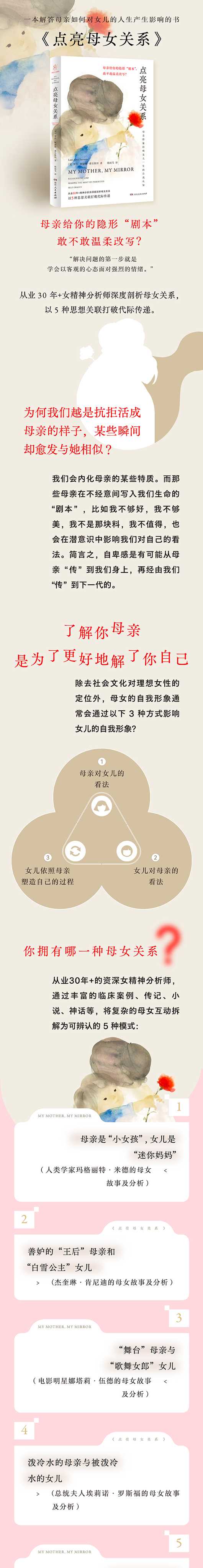 1.为何我们越是抗拒活成母亲的样子,某些瞬间却愈发与她相似?为何母女之间的爱如此深沉,彼此却又如此容易受伤?本书揭示了那些母亲在不经意间写入我们生命的;剧本。我不够好,我不够美,我不是那块料,我不值得,并告诉我们:我们不必责备过去,觉察并理解当下才是改变的开始 。母女不是只能做彼此的镜子,还可以是两棵并肩成长的树,我们彼此都有变得geng好的可能。