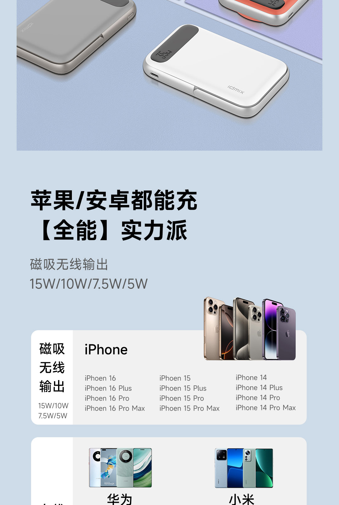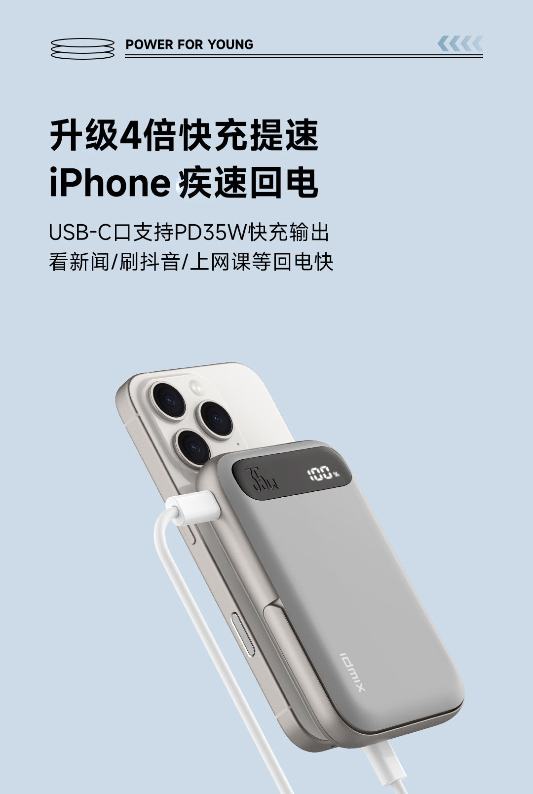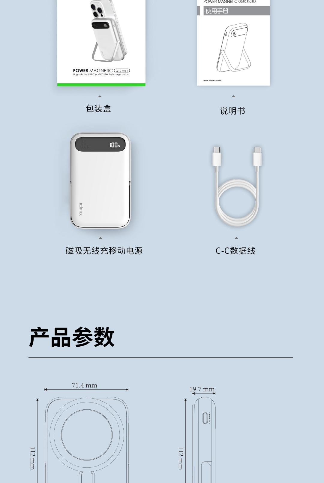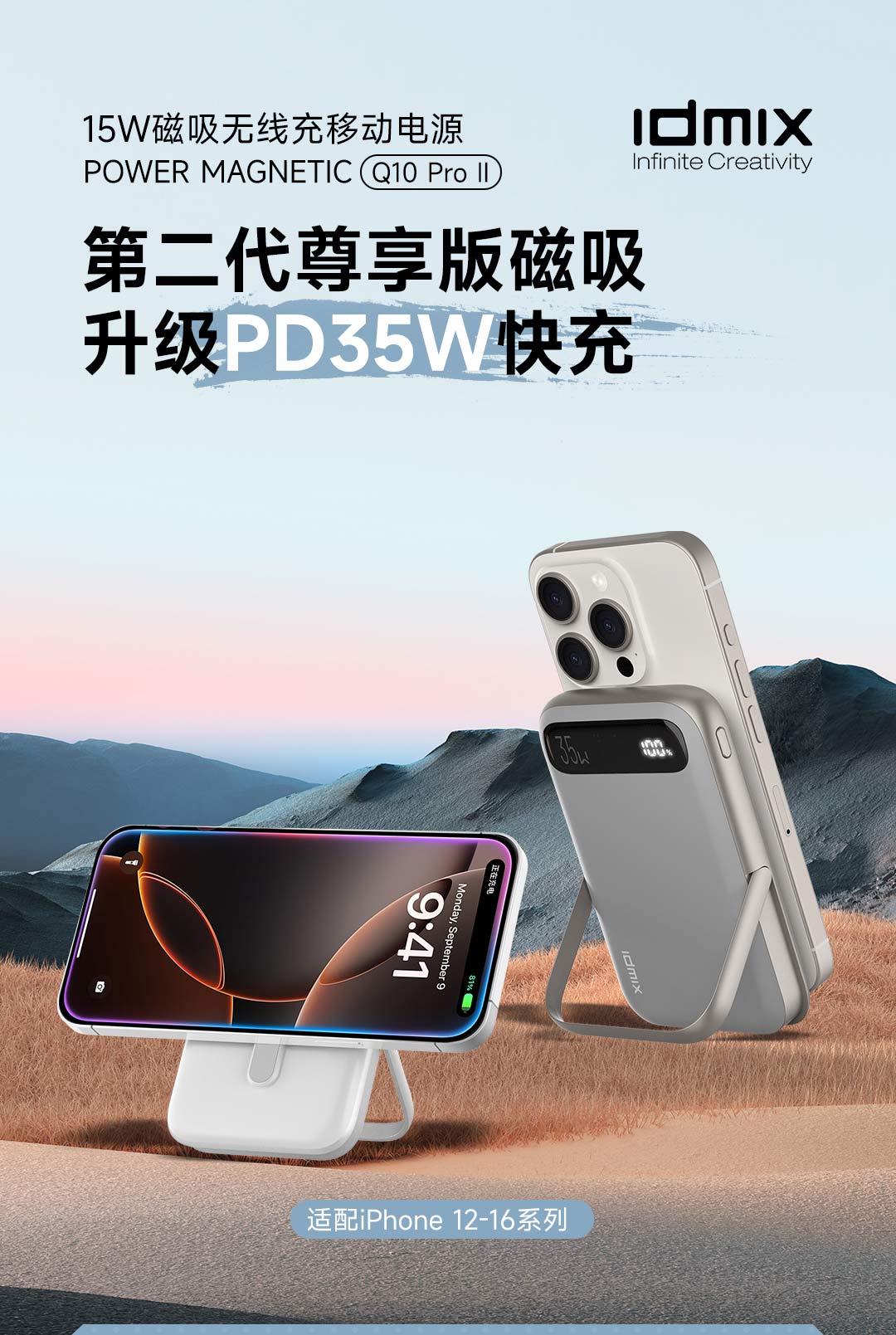 本详情页已于2025年5月28日起更新为“idmix Q10 PRO2 磁吸充电宝”第二代产品的详情介绍内容。idmix Q10 一代产品仅剩下银白色可以购买。下单时情注意选择正确规格。