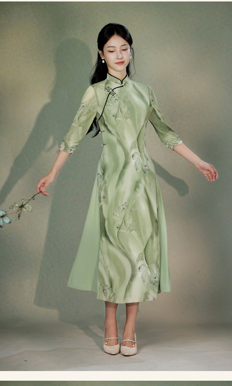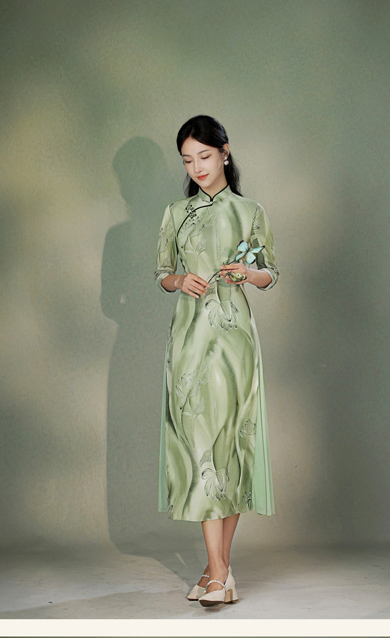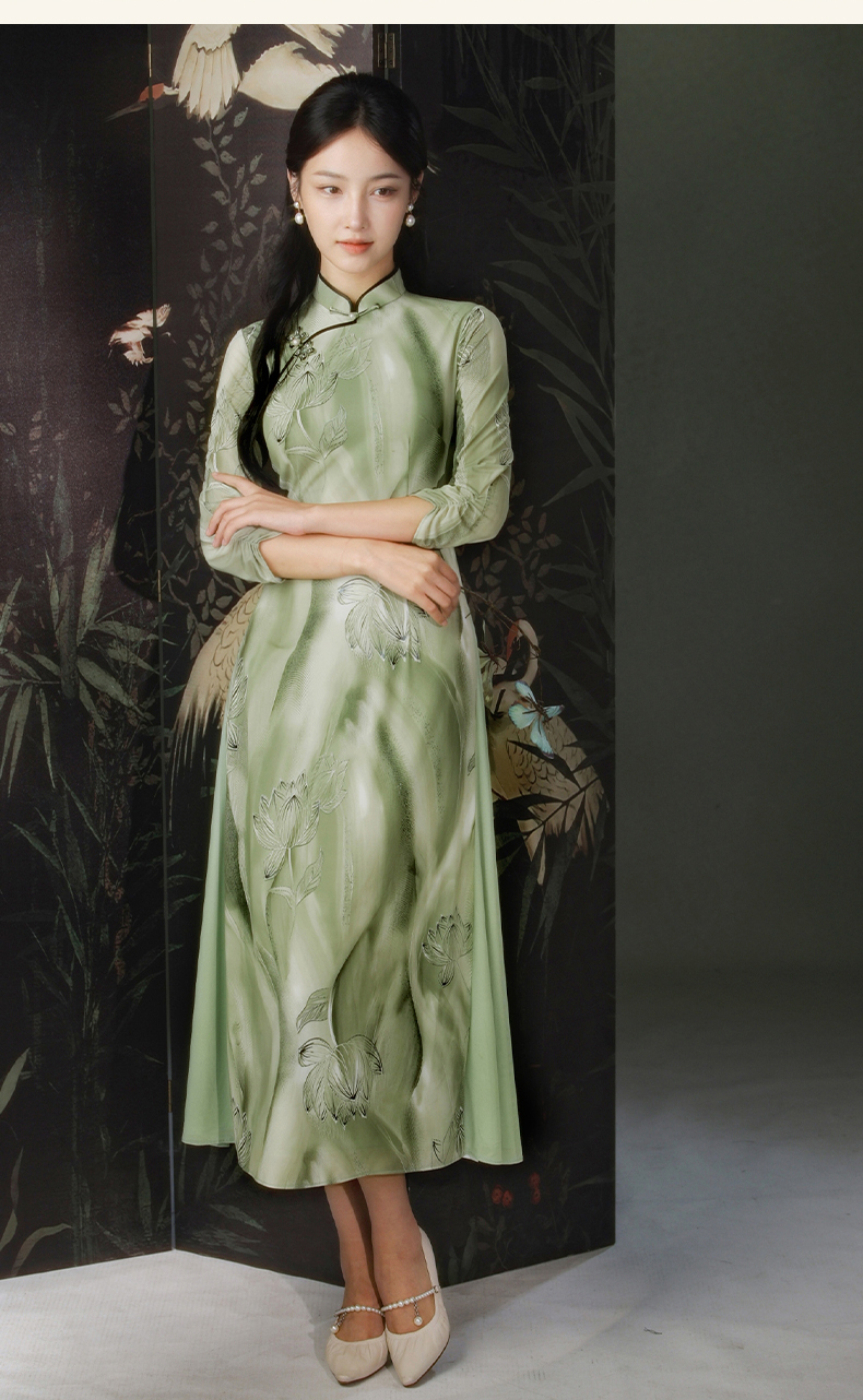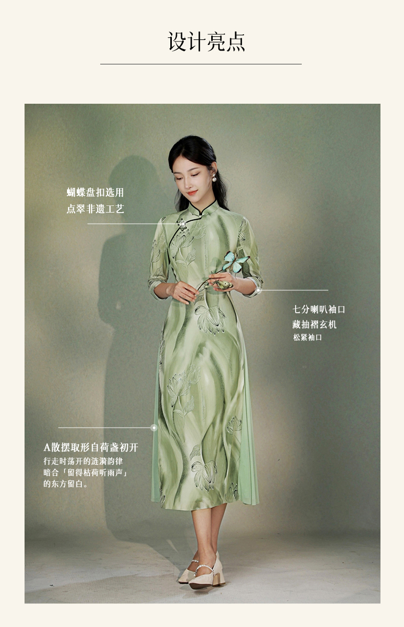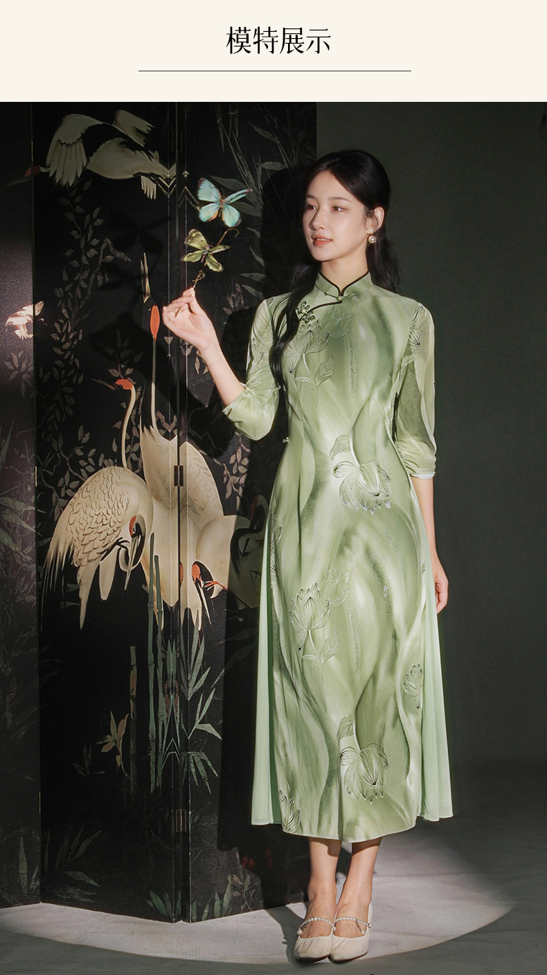 逸红颜秋荷2025秋新款高弹新中式奥黛改良中袖不开叉旗袍连衣裙女