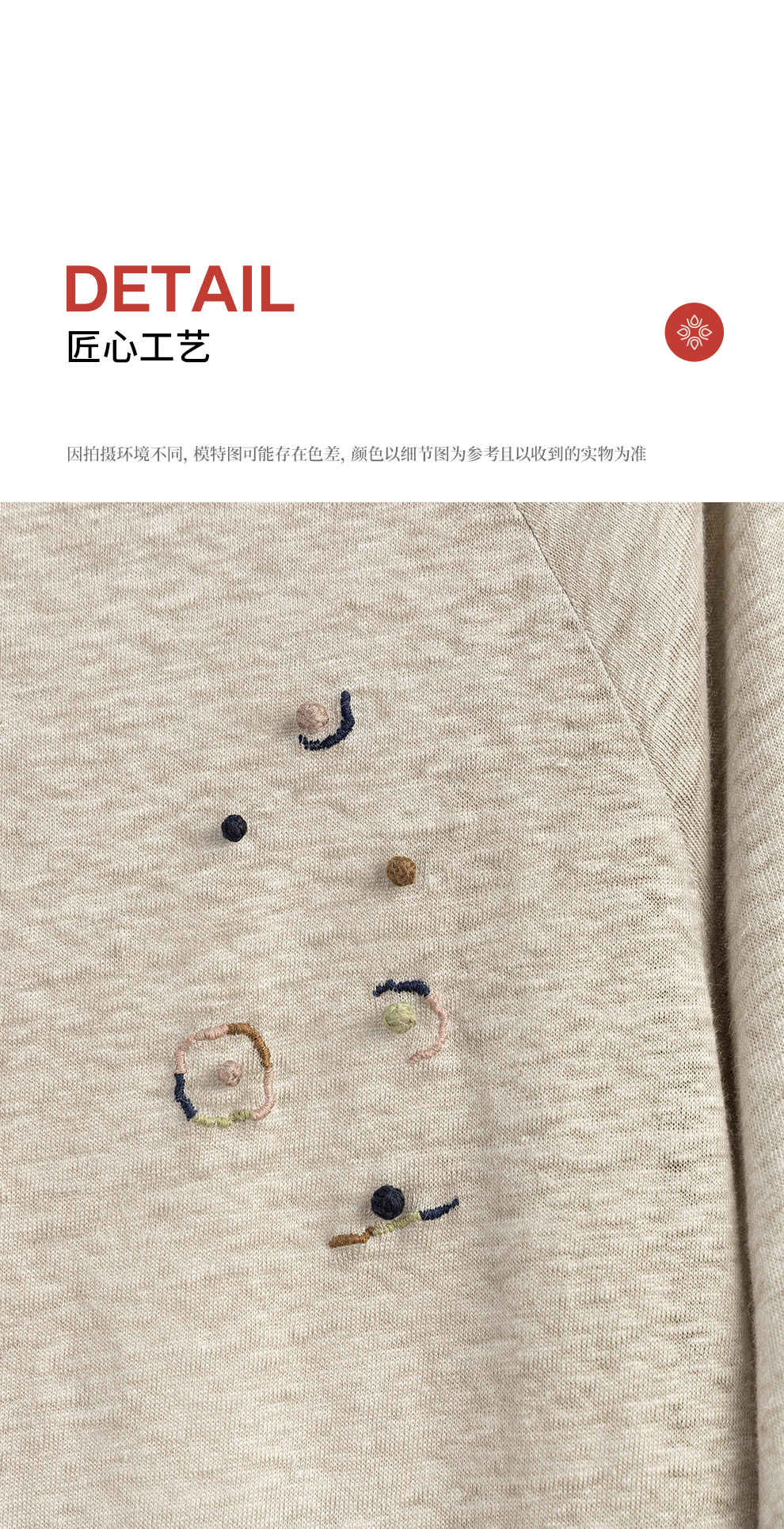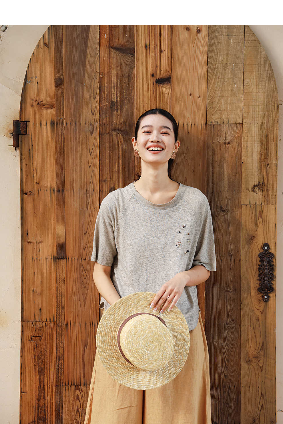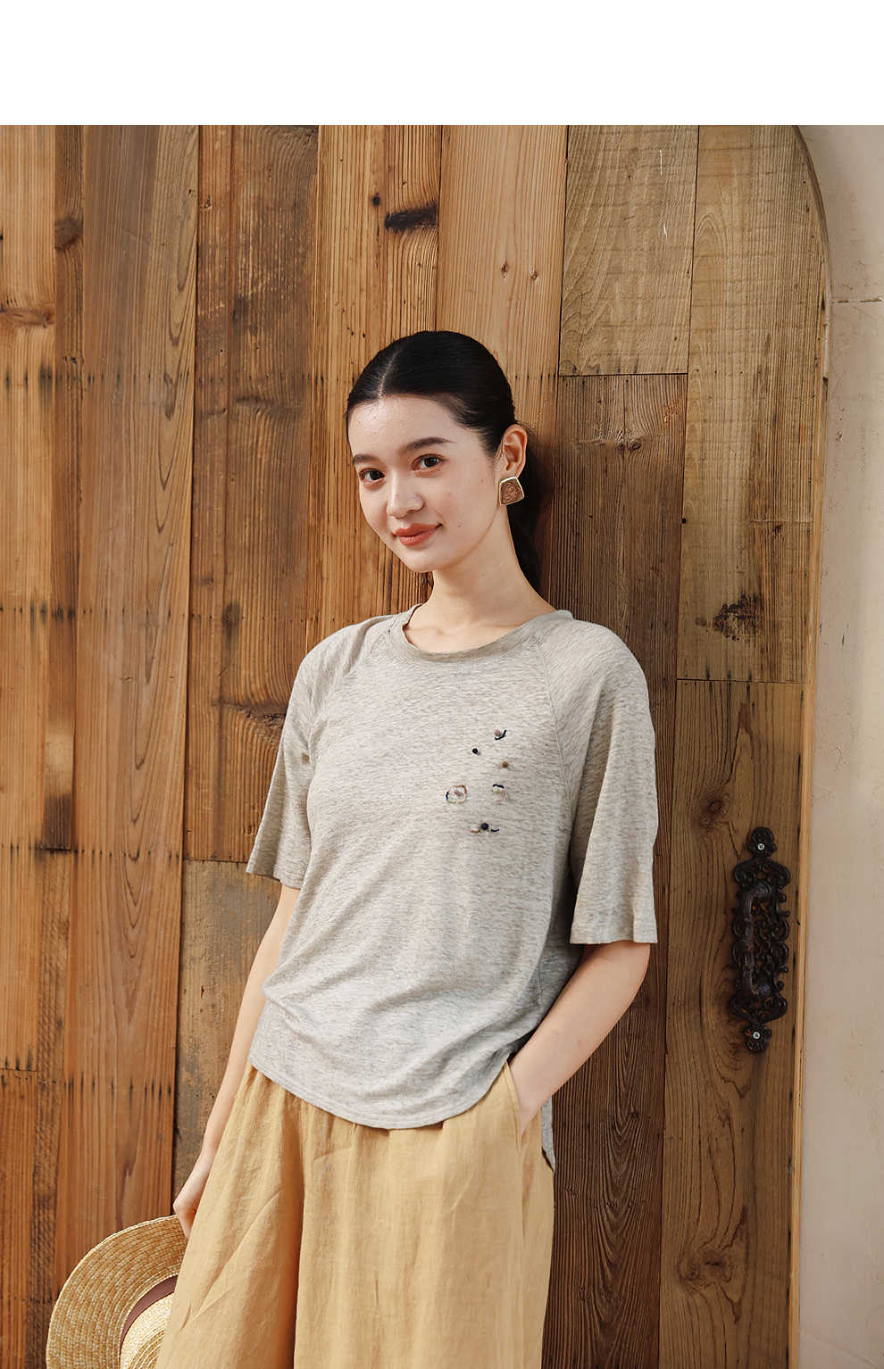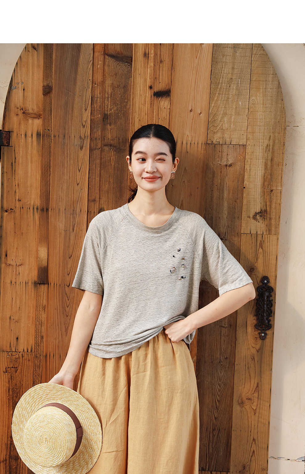 绽放449朵/【多巴胺系列】亚麻花纱刺绣圆领插肩袖针织中袖T恤夏