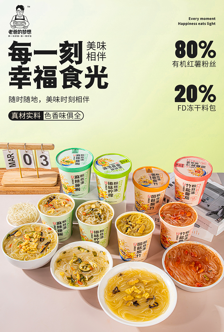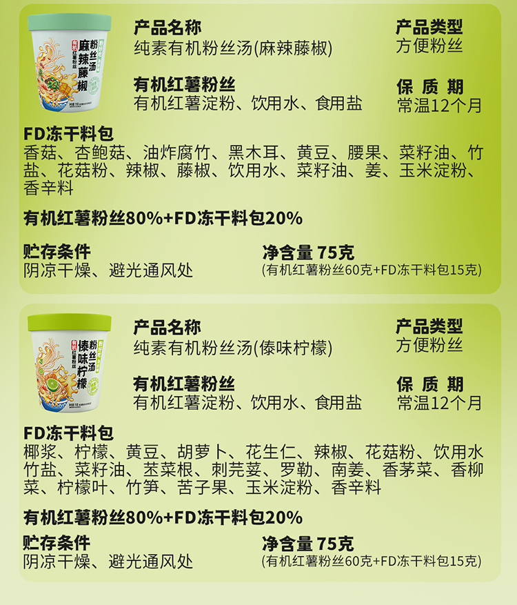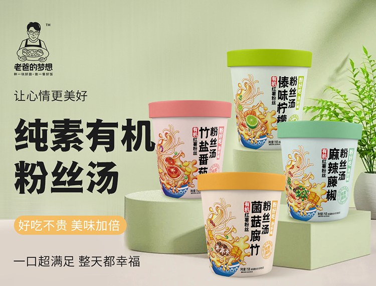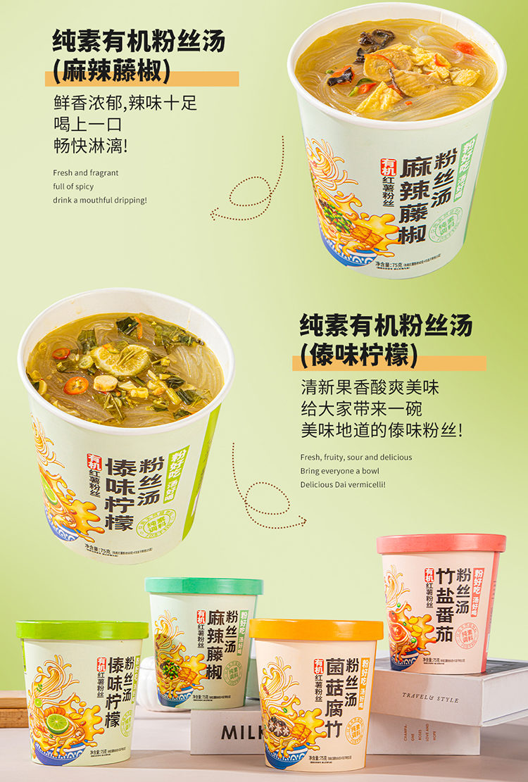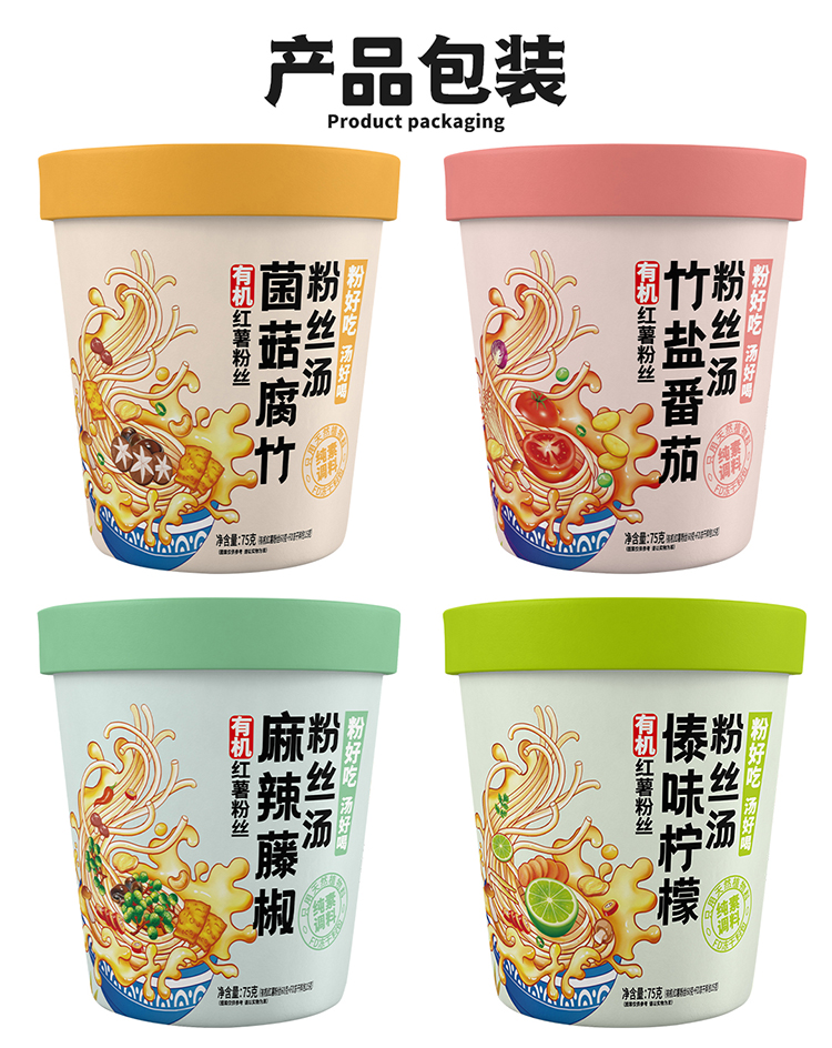 【厂商直发】纯素有机红薯粉丝汤75g*4桶装竹盐番茄菌菇腐竹傣味酸汤麻辣藤椒包邮