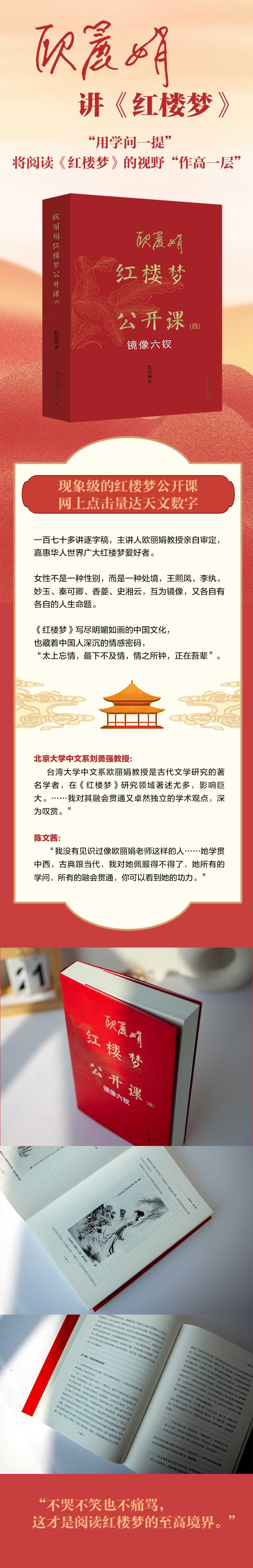 现象级的红楼梦公开课,网上点击量达天文数字,一百七十多讲逐字稿,一字一句,精雕细琢,主讲人欧丽娟教授亲自审定,嘉惠华人世界广大红楼梦爱好者。;学问中便是正事。此刻于小事上用学问一提,那小事越发作高一层了。不拿学问提着,便都流入市俗去了。欧丽娟讲《红楼梦》,;用学问一提,让《红楼梦》的视野;作高一层。