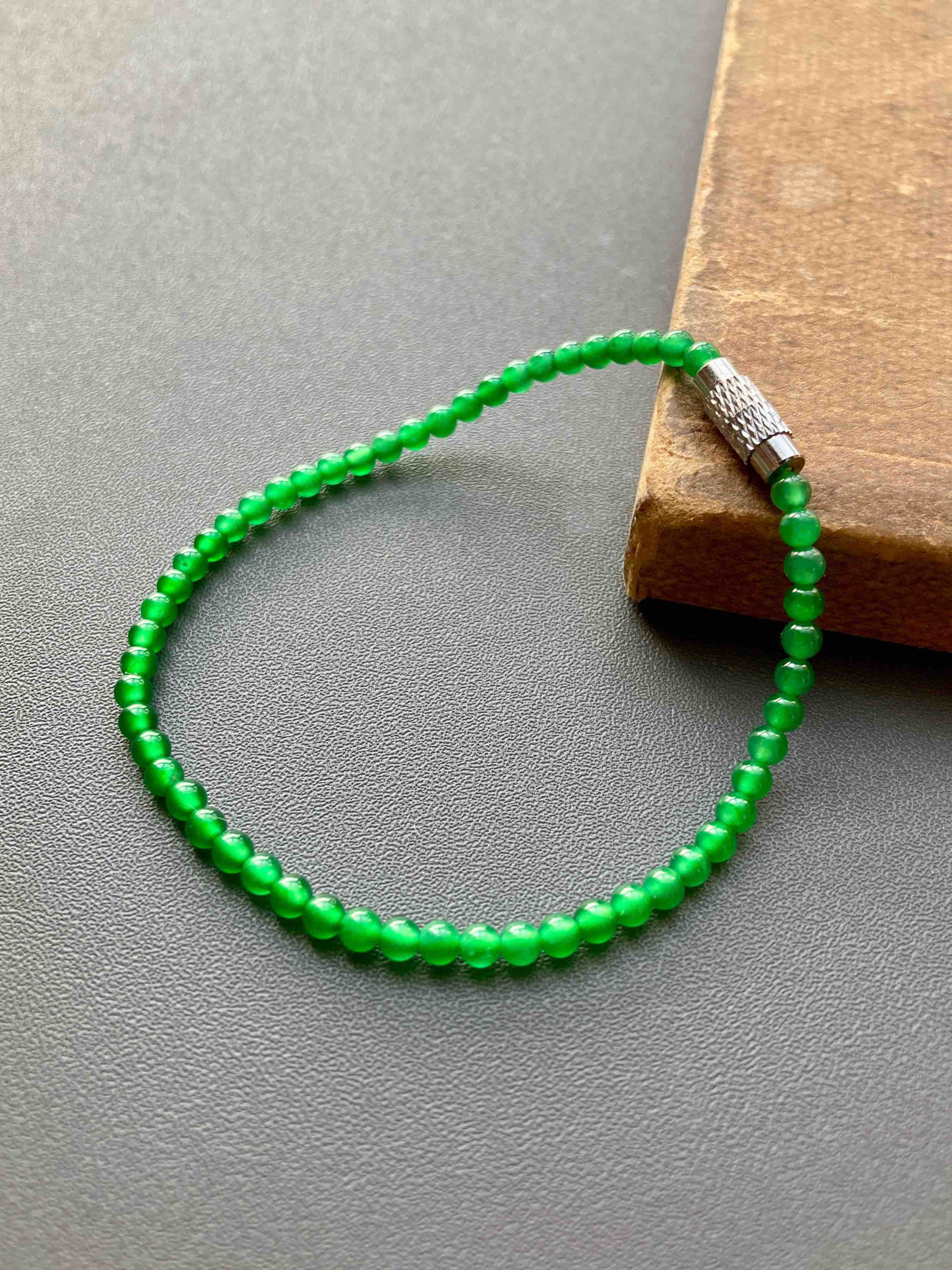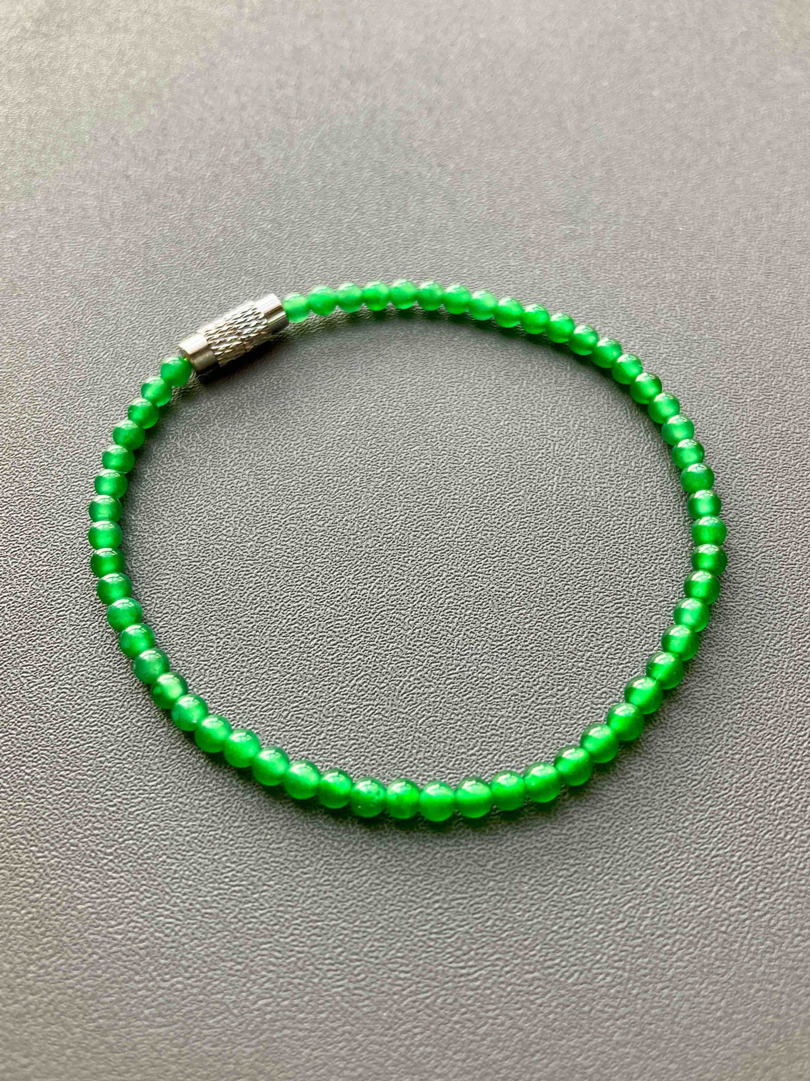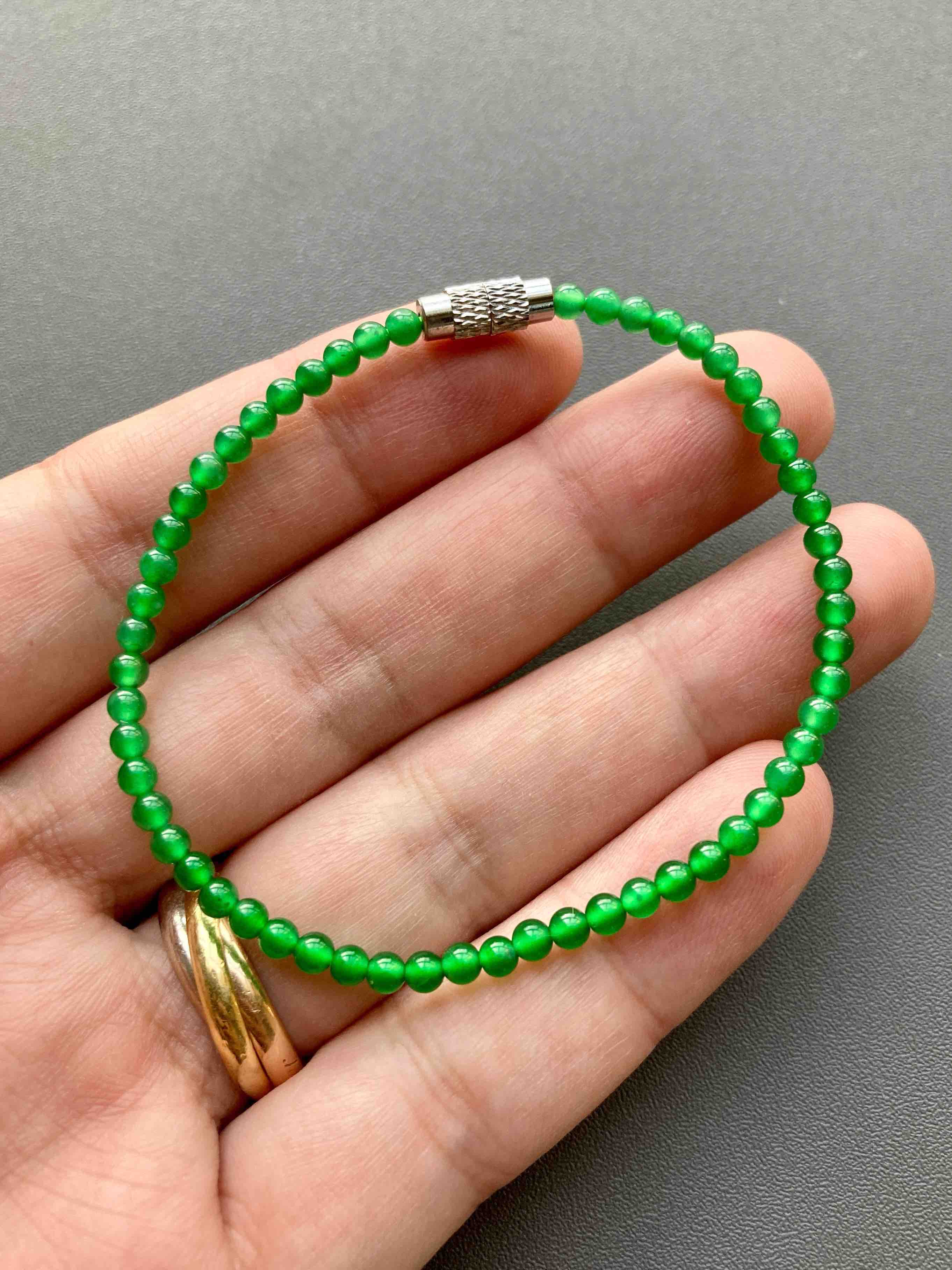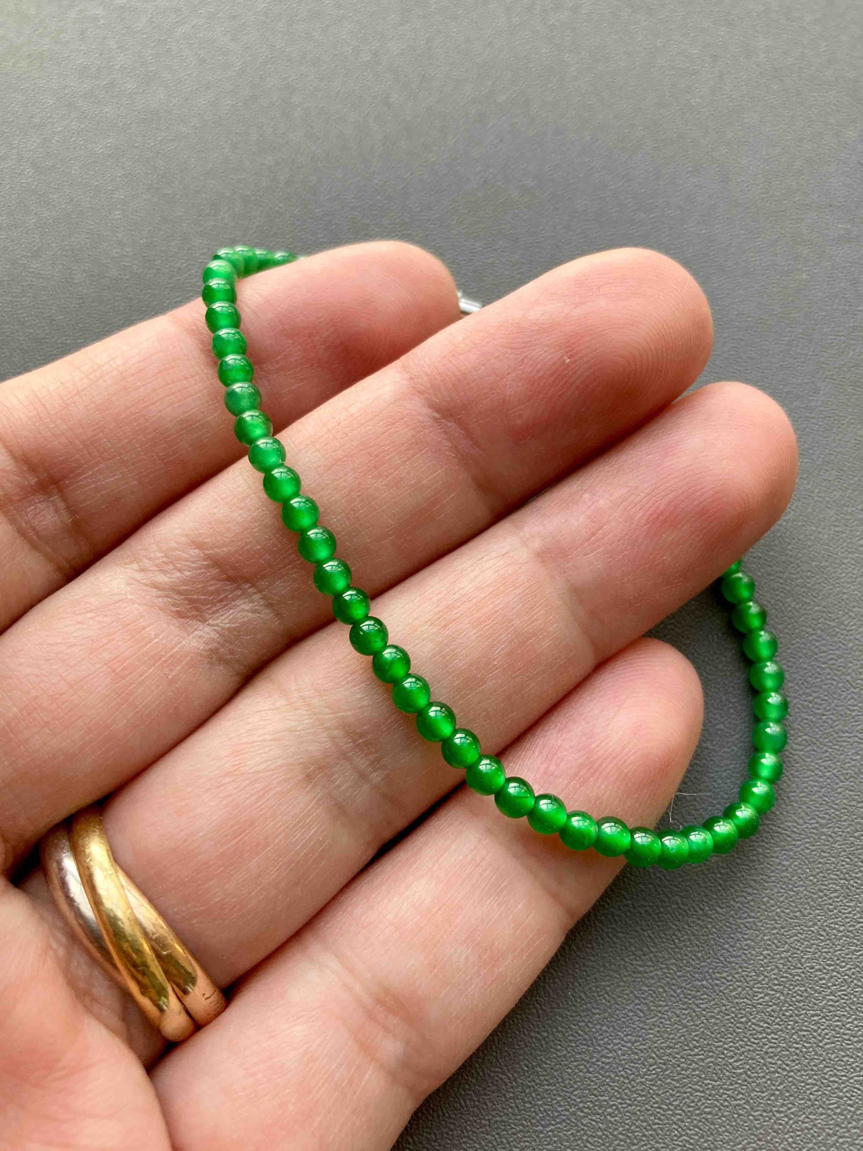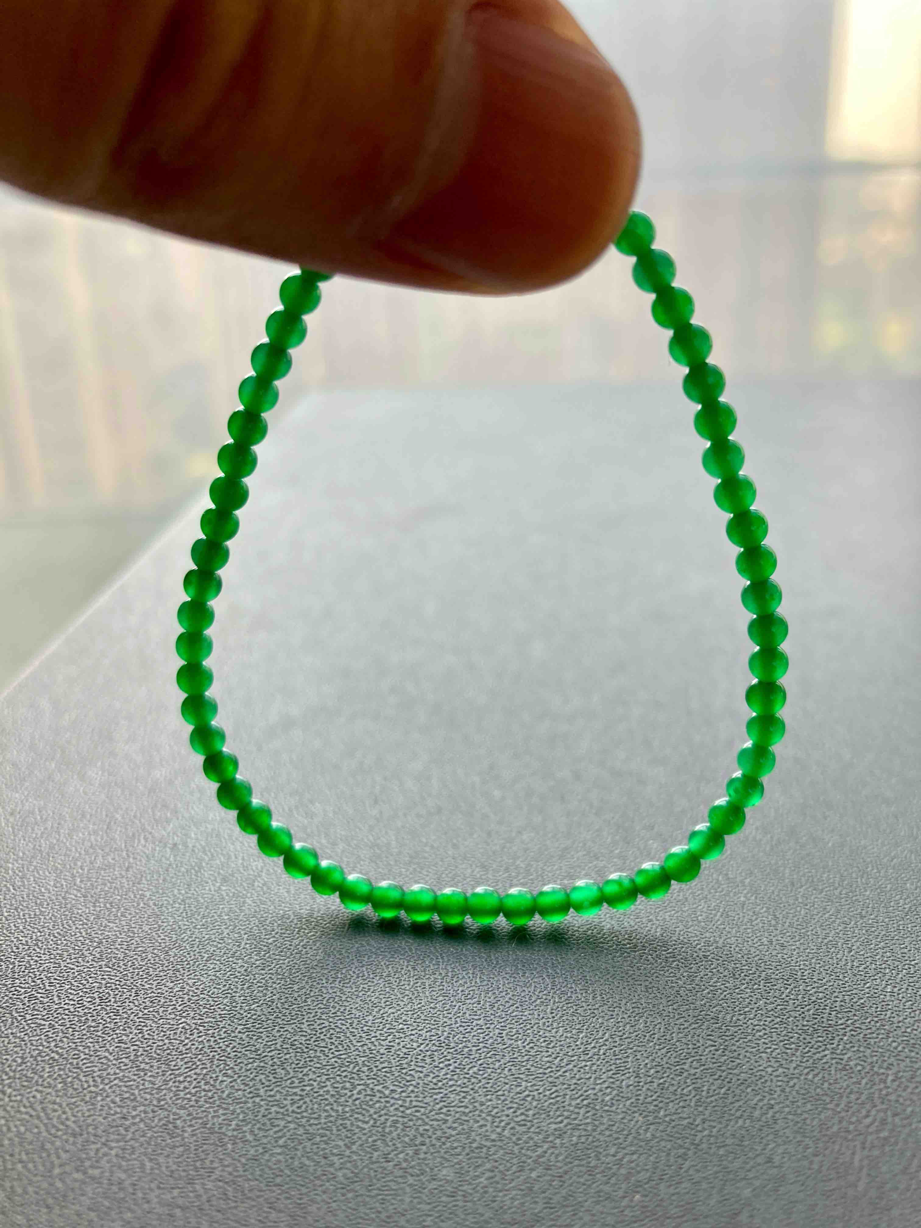 这颜色绝了,你见过这么艳丽的阳绿翡翠珠串吗,高冰种荧光四射,绿色鲜辣无比,教科书一样的正气阳,危地马拉翡翠里的稀有成色,品质连缅甸料一起吊打,想想如果存在这种种色的缅甸料,他要卖你多少个W?而我们这条四位数,无敌性价比,属于你有钱也不一定能遇上的品质,能买到要讲缘分,珠子3mm,长17mm