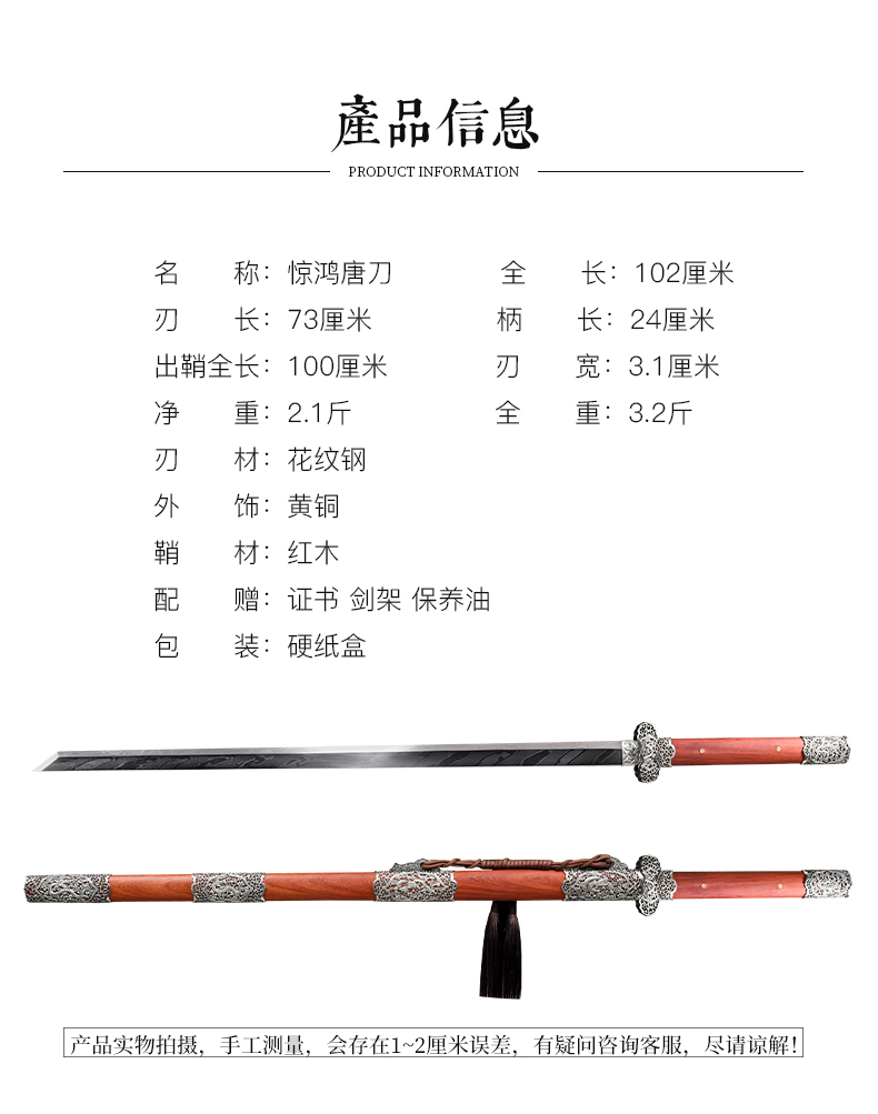 惊鸿唐刀 花纹钢 唐横刀剑 龙泉沈广隆一体刀剑传统刀剑 未开刃
