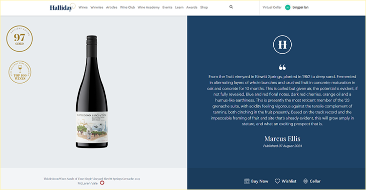 Robert Parker&James Halliday双97高分年份,入选Halliday Wine Companion 2024年度百大酒款(Top 100 Wines)和“特别超值”(Special Value)。来自全澳大利亚蕞优秀歌海娜产区Blewitt Springs,富含沙质土壤之上的75年老藤,部分去梗、大多整串温柔压榨萃取,在混酿土罐中发酵,之后转入成熟橡木桶和混酿土罐中陈酿10个月,未过滤装瓶,散发着柔美檀香、干橘子、紫罗兰玫瑰、野生草莓和肉桂木质香料,美妙可口。