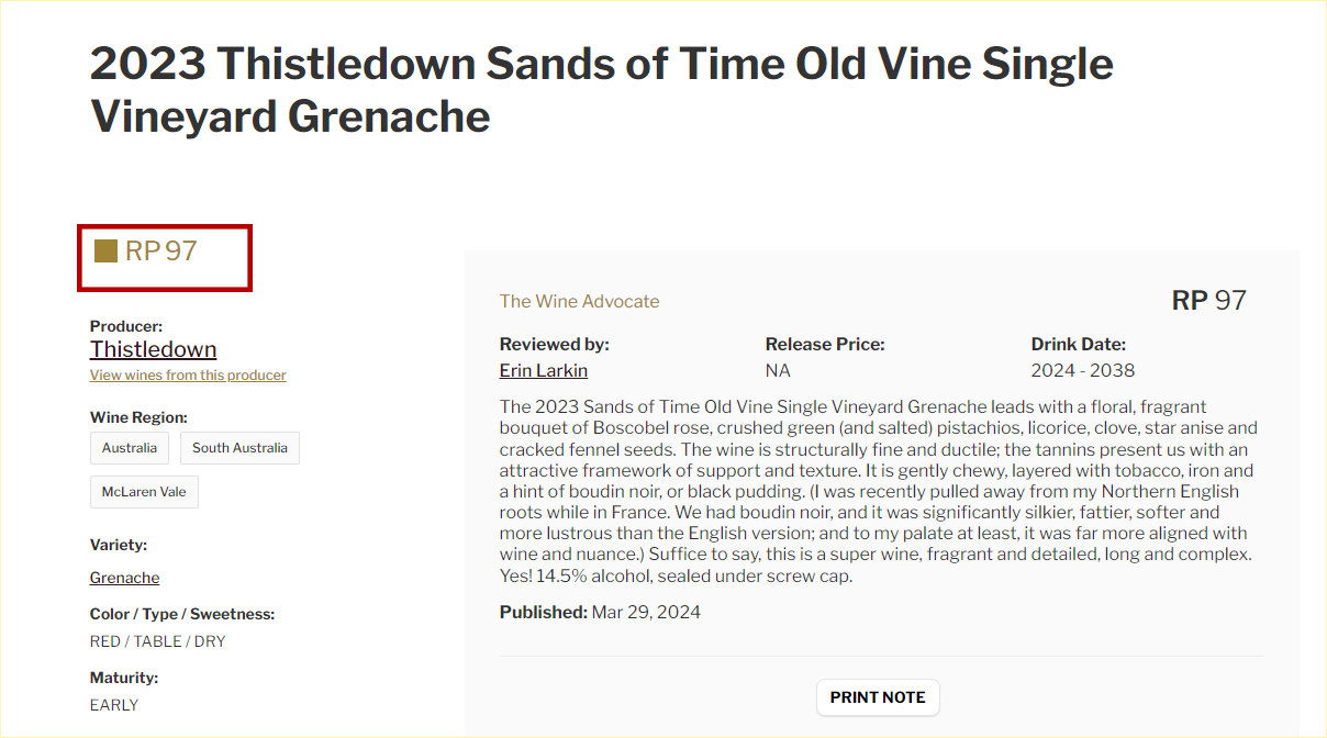 2024年度百大&特别超值!75年老藤!紫绒时间之沙歌海娜 Thistledown Sands of Time Grenache 2023