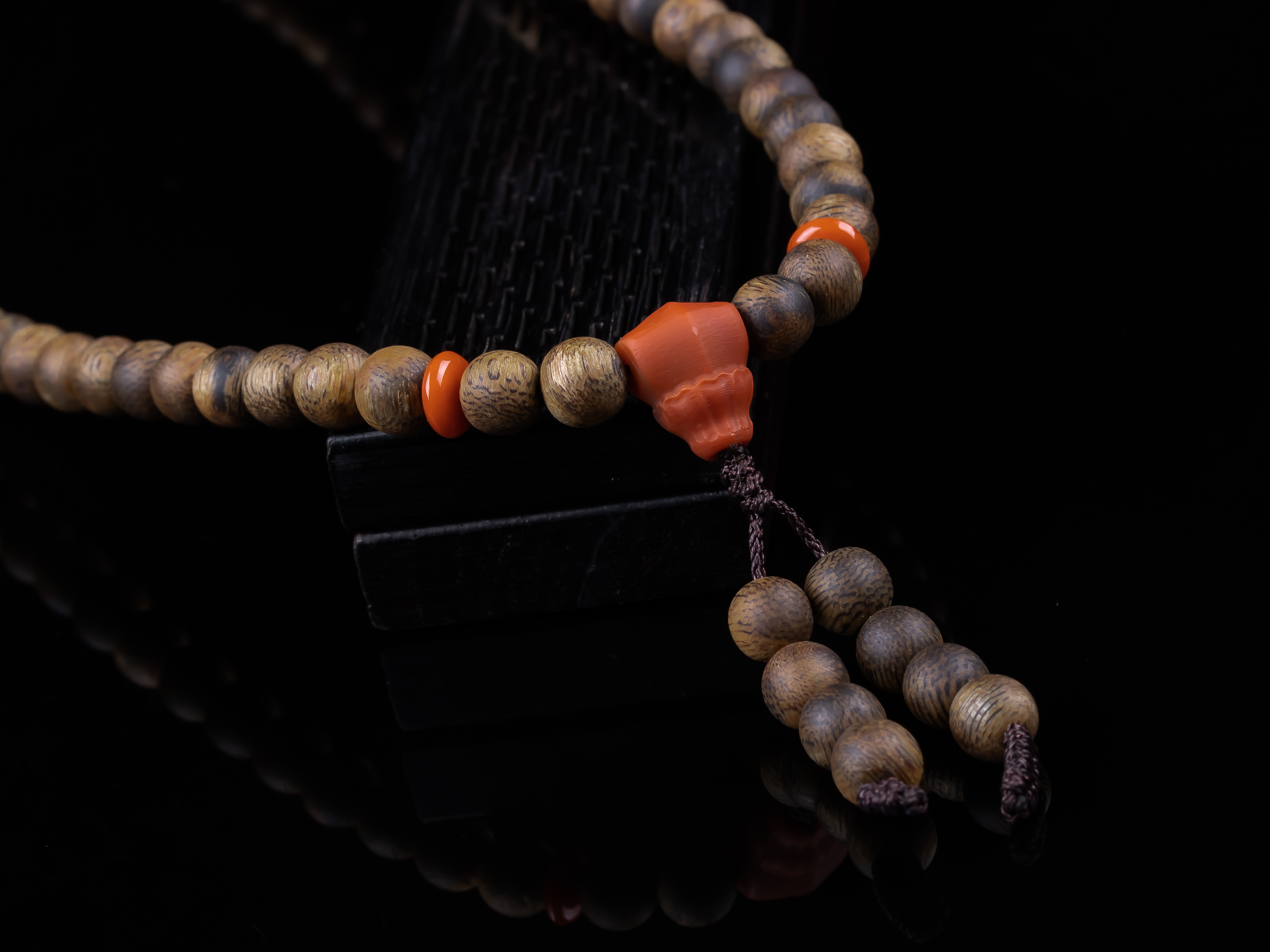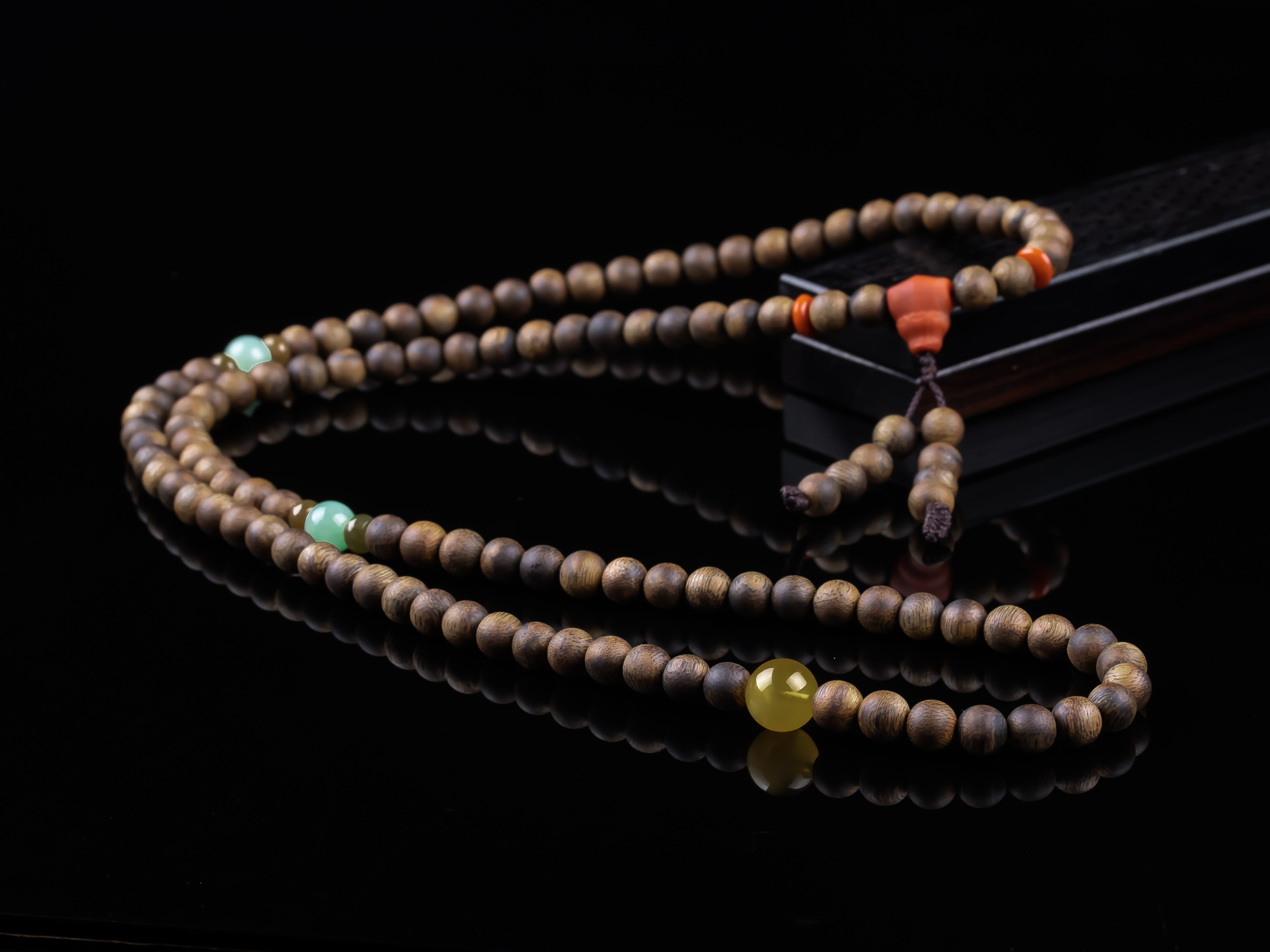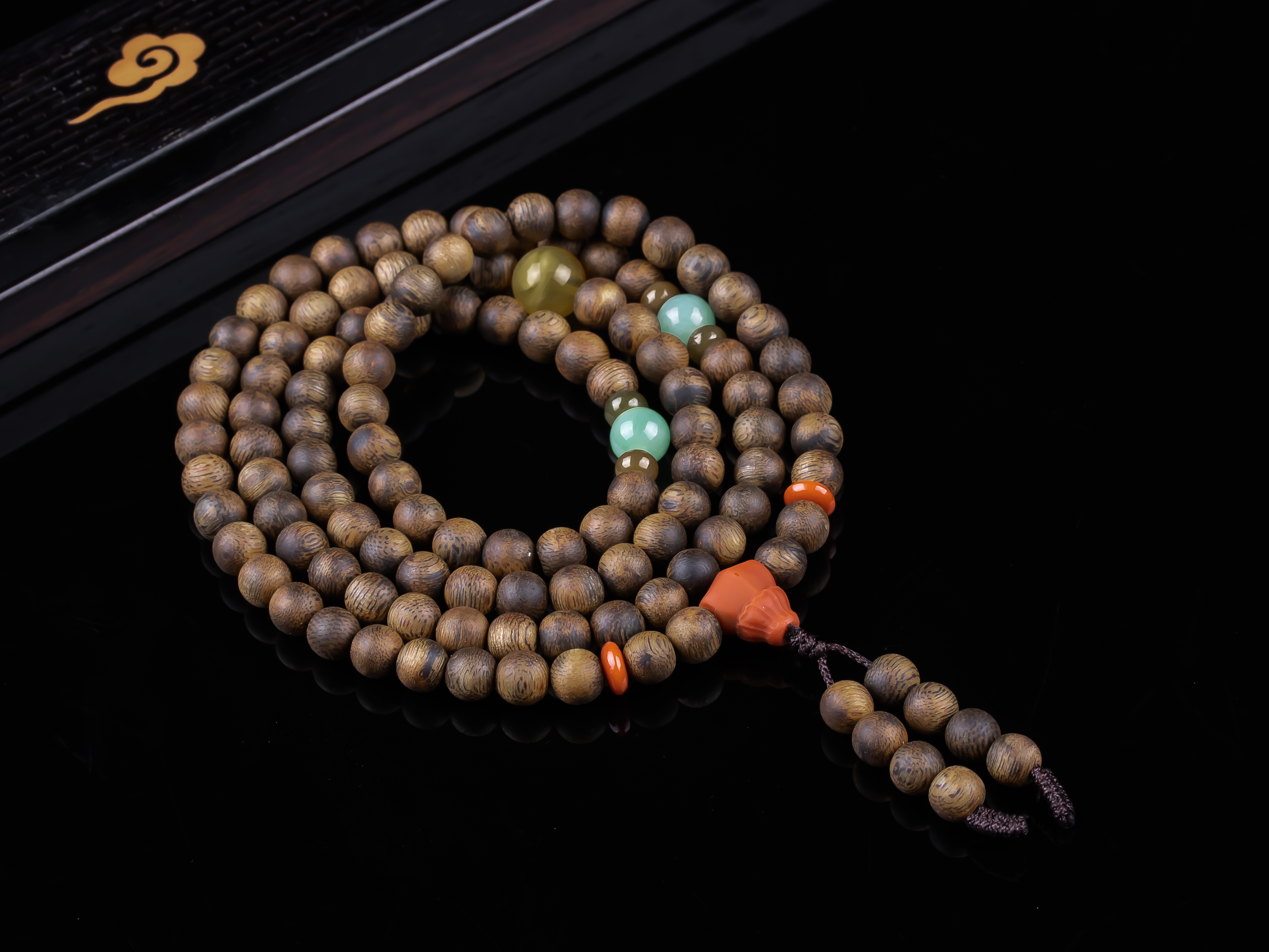 XY0300沉香+翡翠南红蜜蜡双圈,天然沉香约7.3mm。原色原味,香味自然清甜,搭翡翠、蜜蜡、南红三通,款式素雅大方,简约有韵味。
