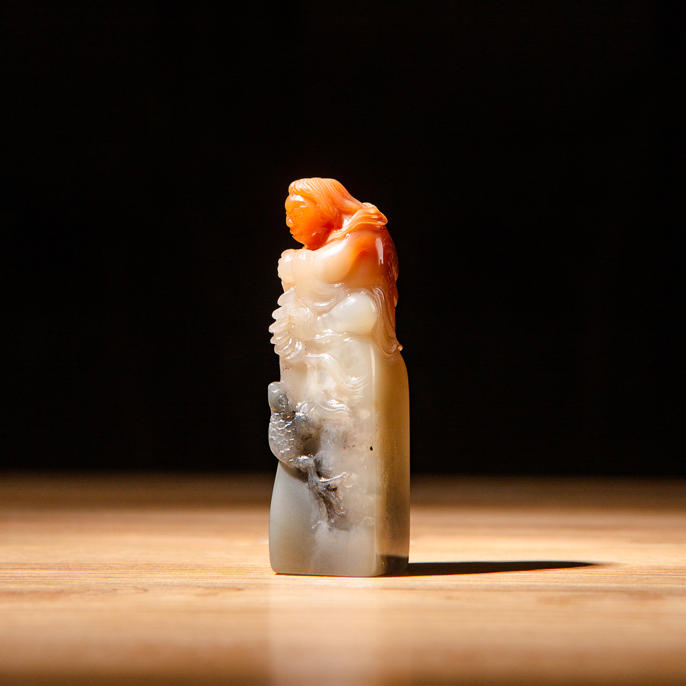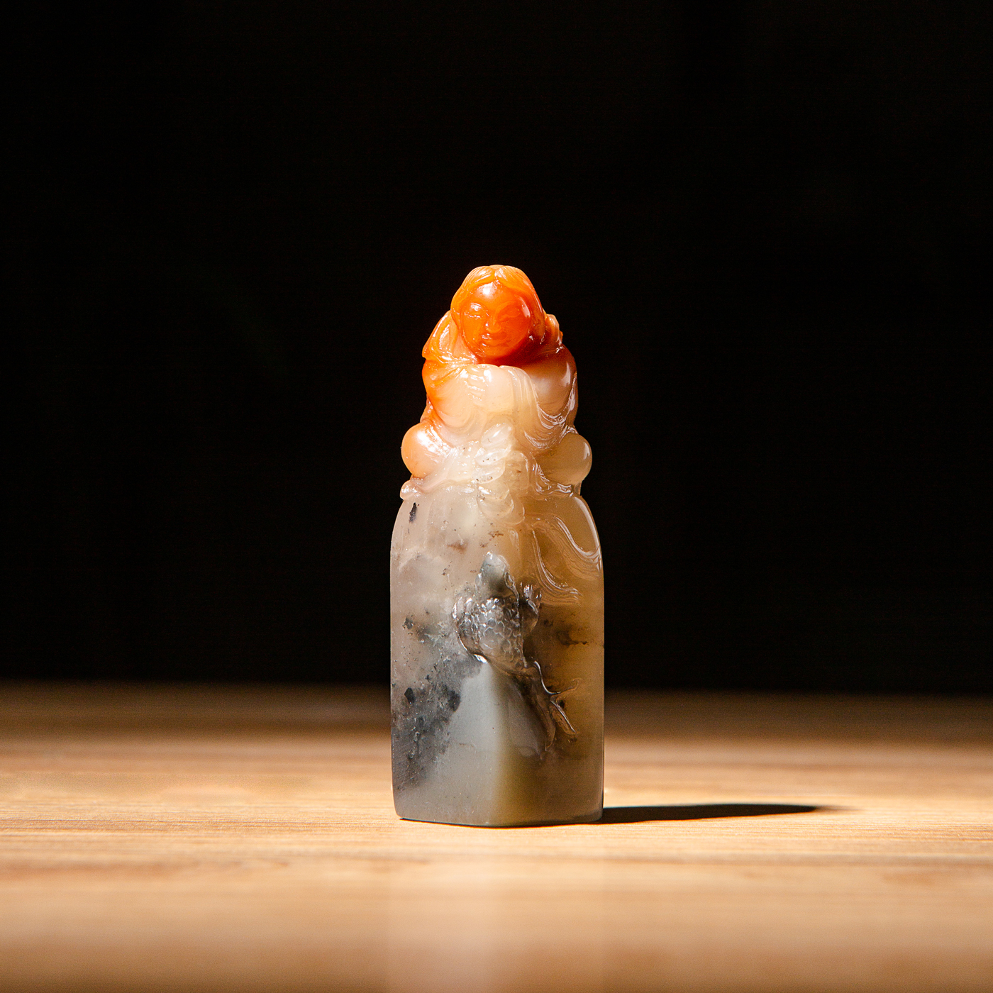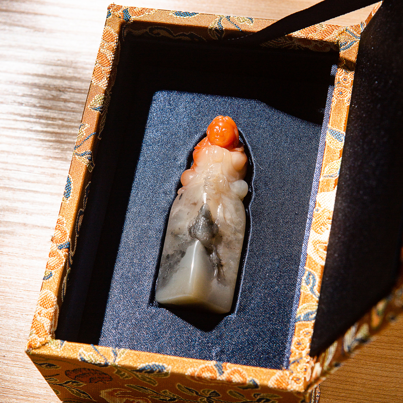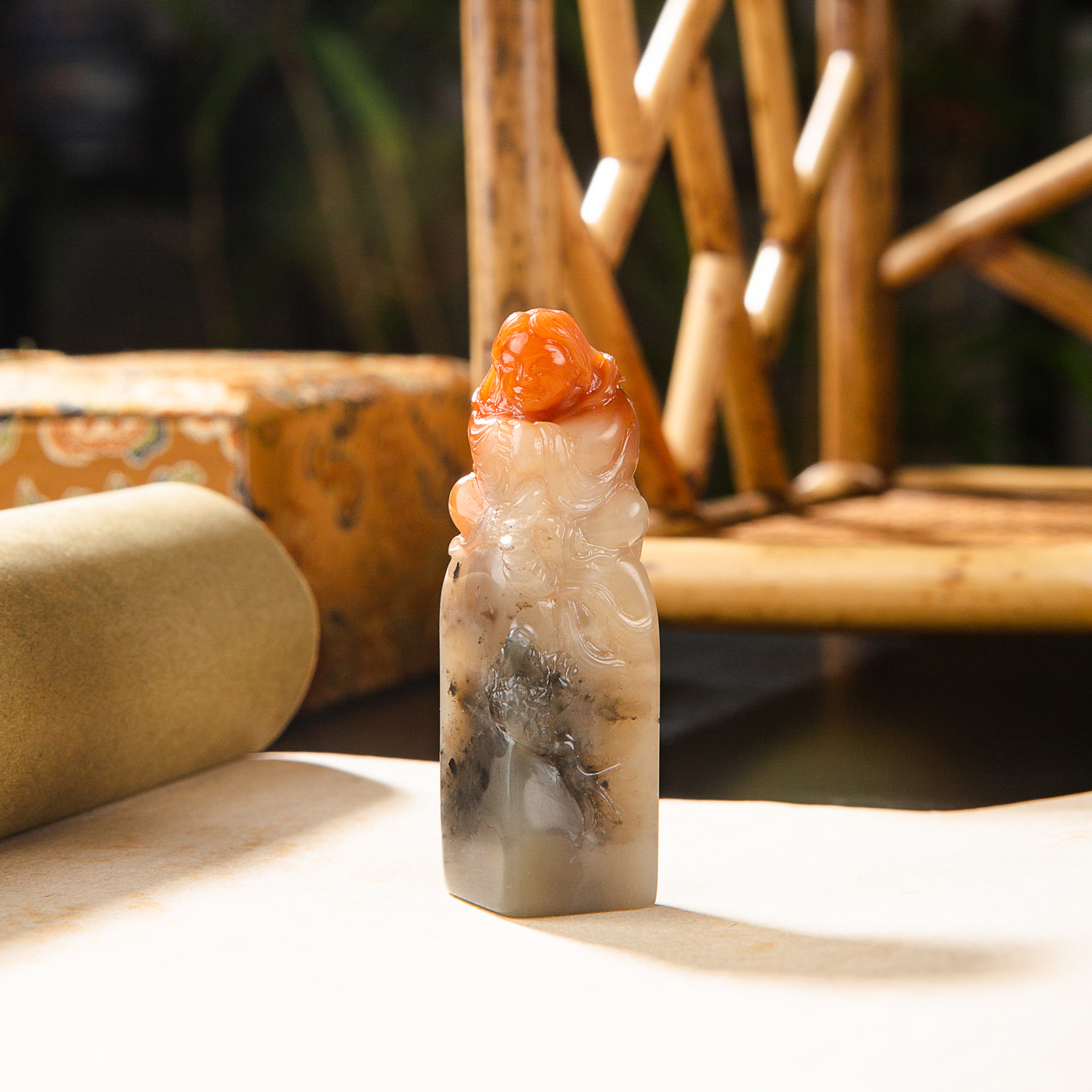 寿山石鸡母窝老料雕“刘海戏金蟾”方章,用料为存放几十年的老料,其雕工精美,质地温润,石性稳定,极为难得。