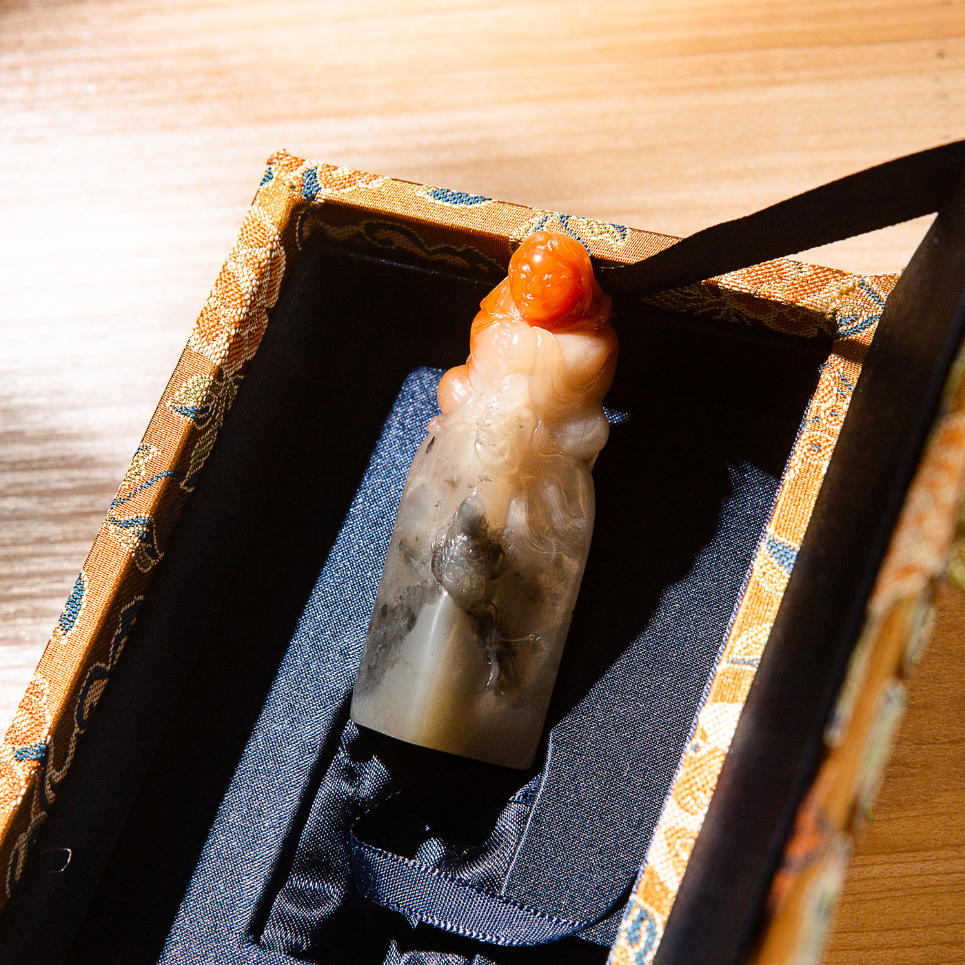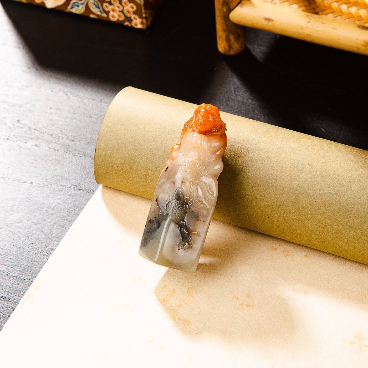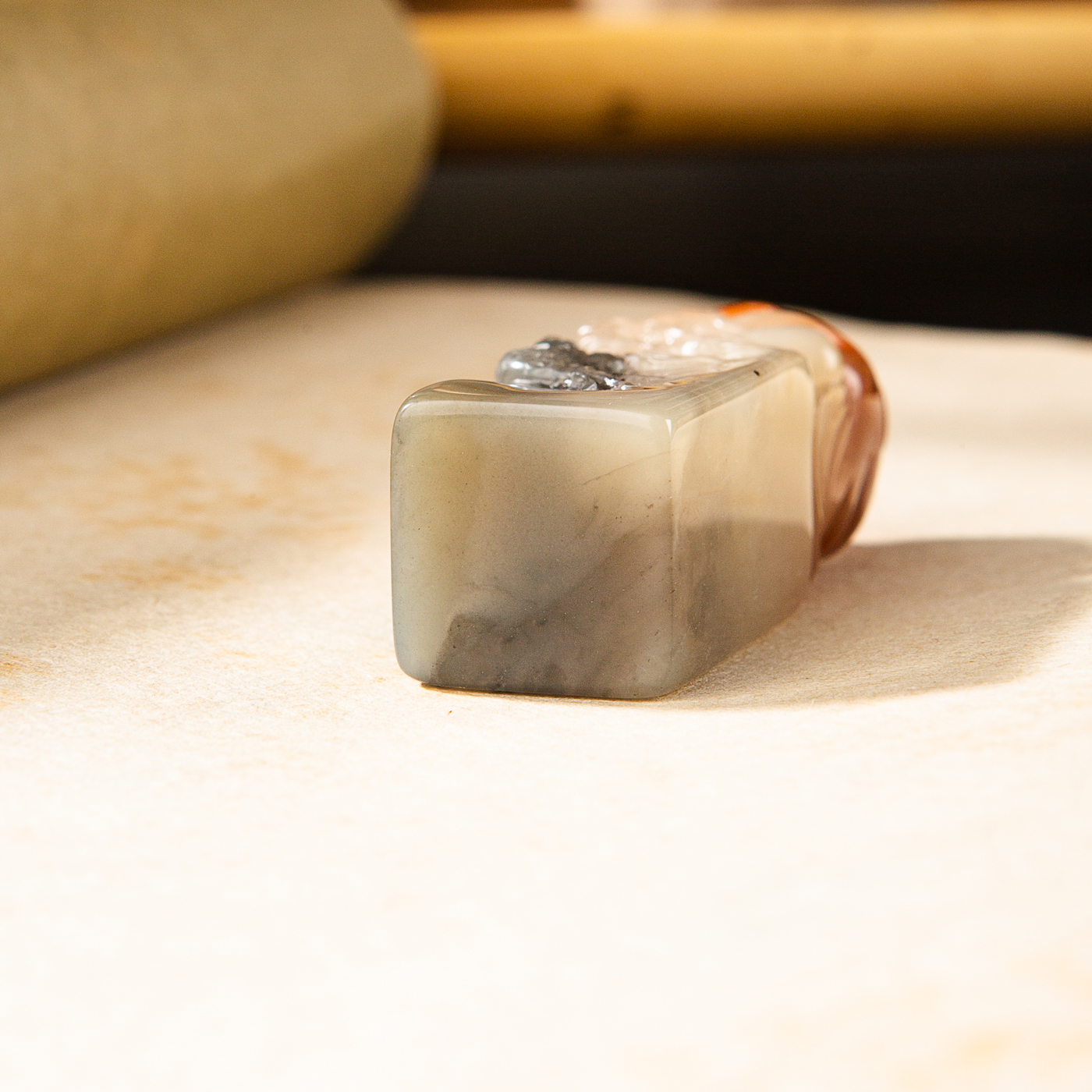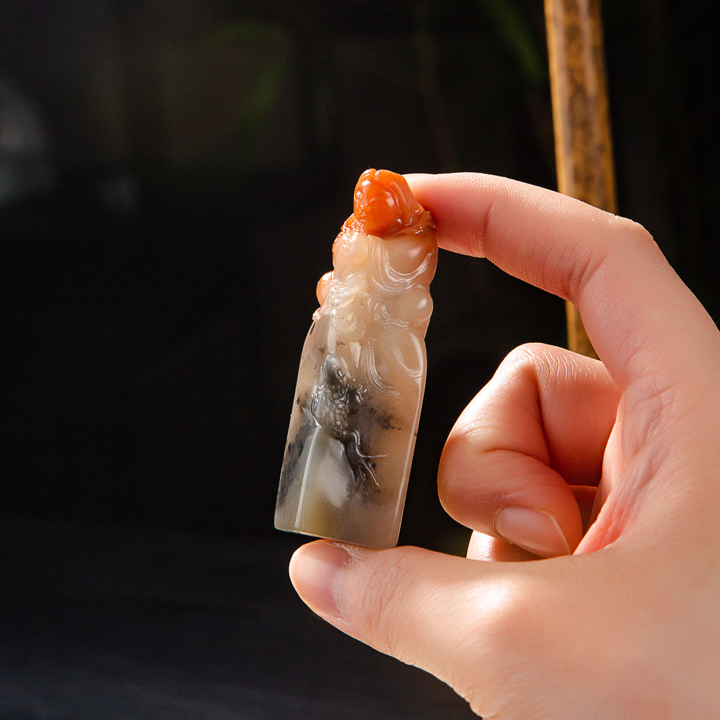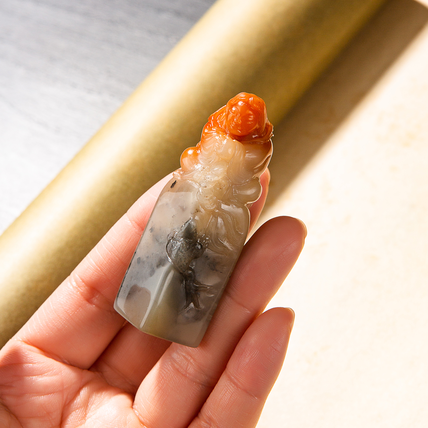 寿山石鸡母窝老料雕“刘海戏金蟾”方章,用料为存放几十年的老料,其雕工精美,质地温润,石性稳定,极为难得。