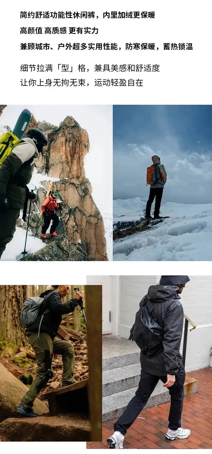 3D立体剪裁,裤型设计理念舒适便捷,适合休闲运动,休闲,徒步,攀爬,登山,训练等多种穿着场景。品牌订织加密防水户外面料,篙透气,生活防水性能,四面弹力,穿着时活动自然无任何拘束感。