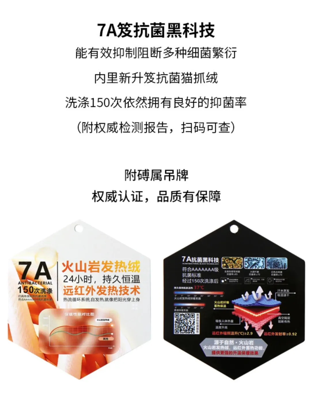 面料功能:三秒即热|恒温保暖黑科技,洗不掉的7A抗菌,能有效抑制阻断细菌繁衍,新升级抗菌猫抓绒,洗涤150次依然拥有良好的抑菌率(检测报告可查)