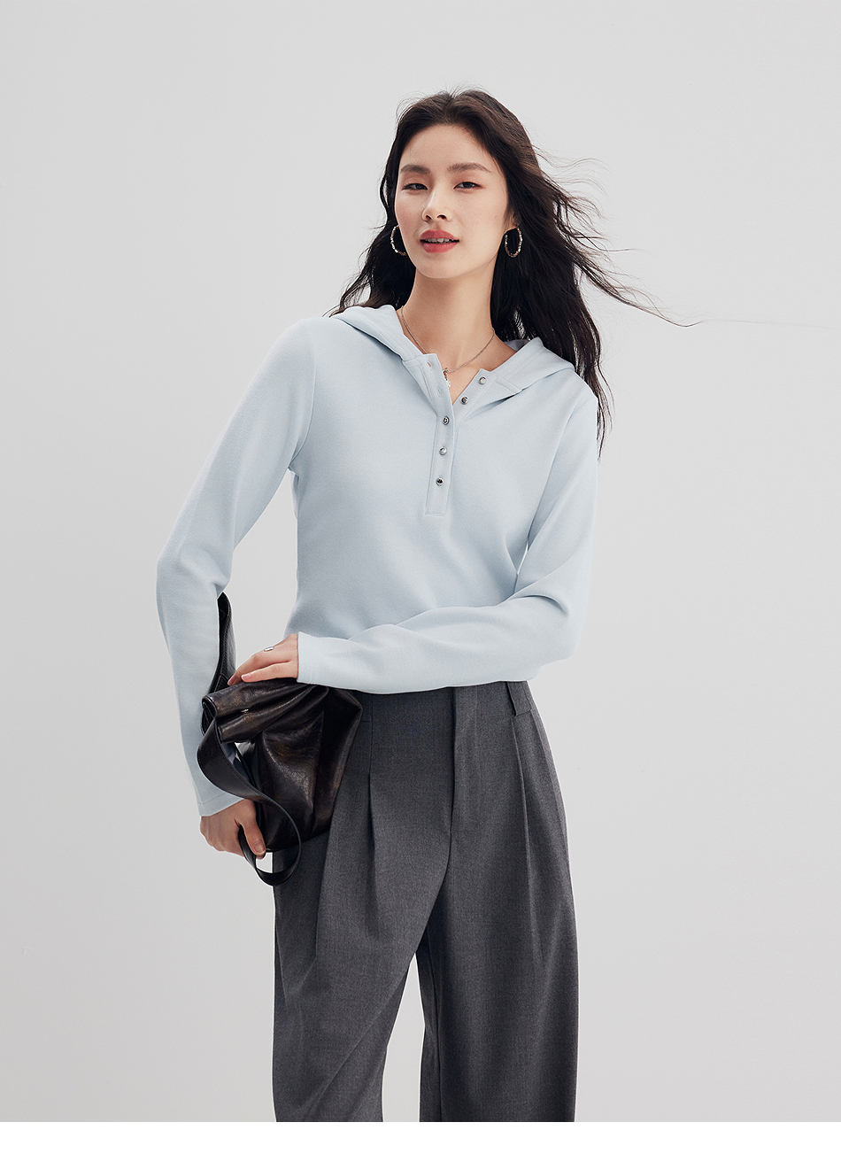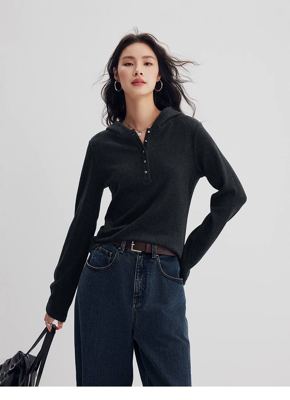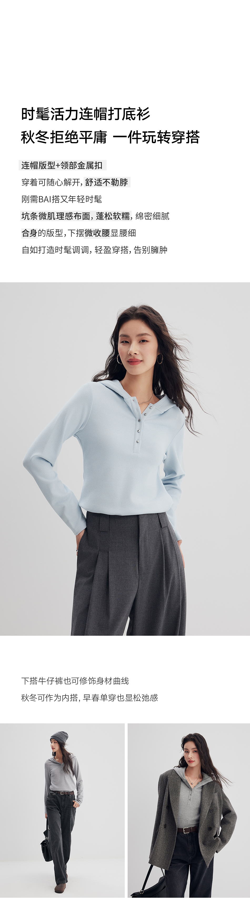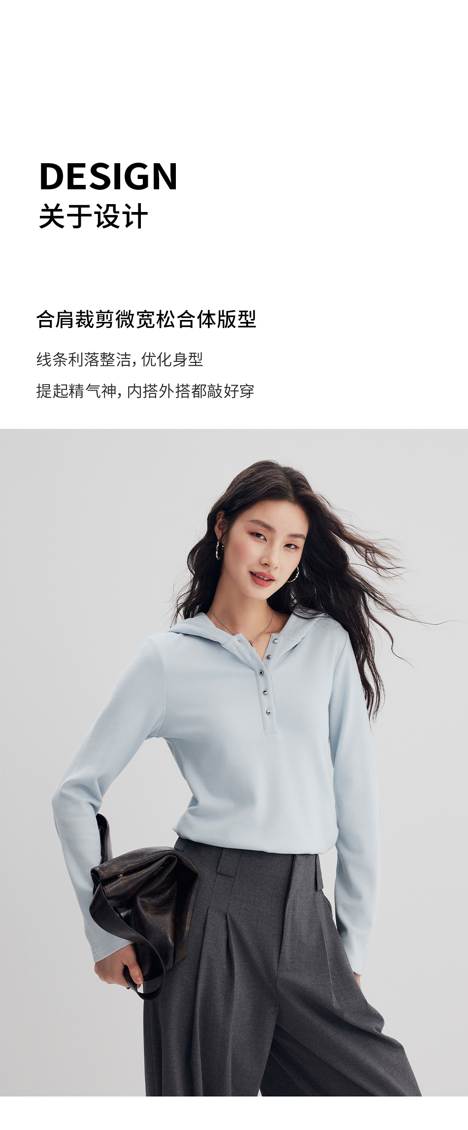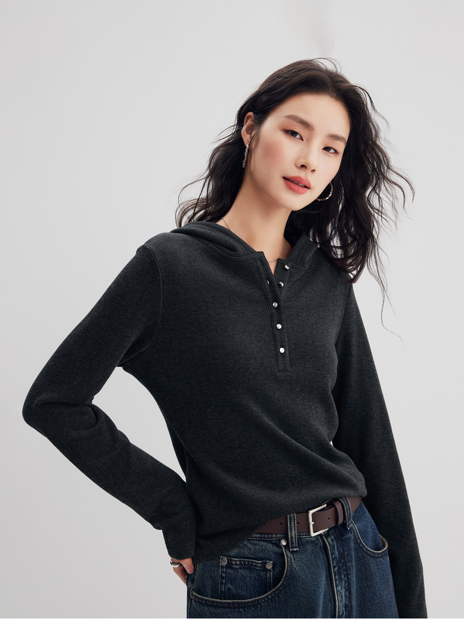 棉仓357601001-小银豆牙签纹肌理感暖感绒兜帽合体微修身长袖T