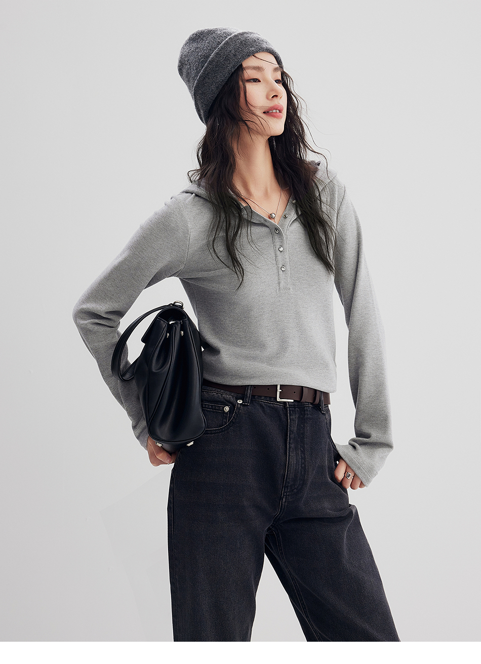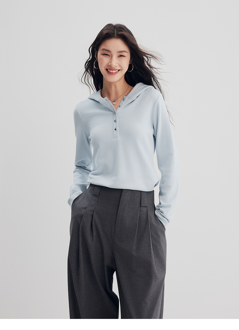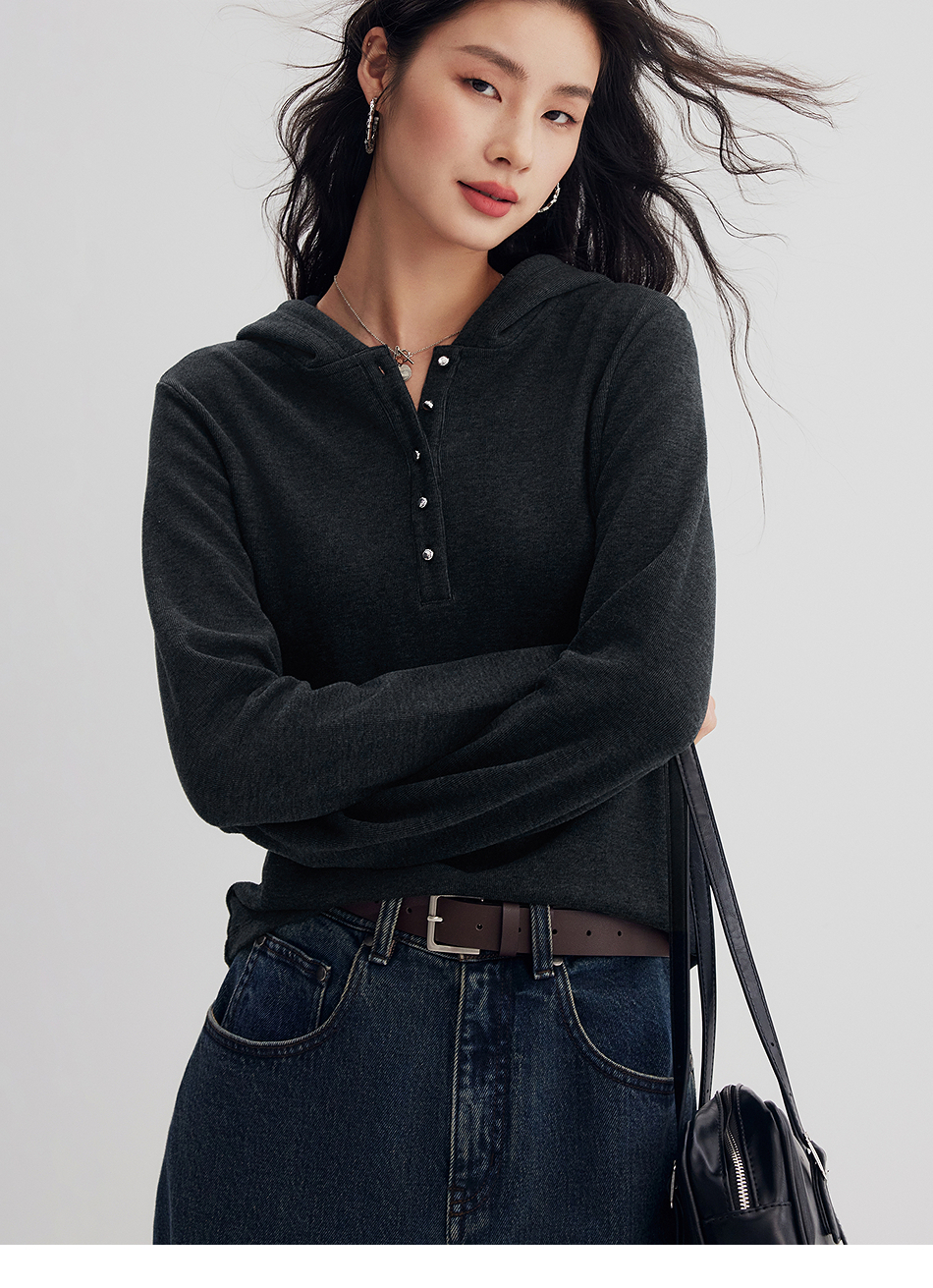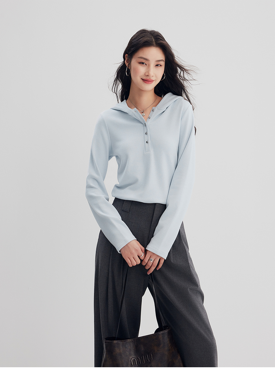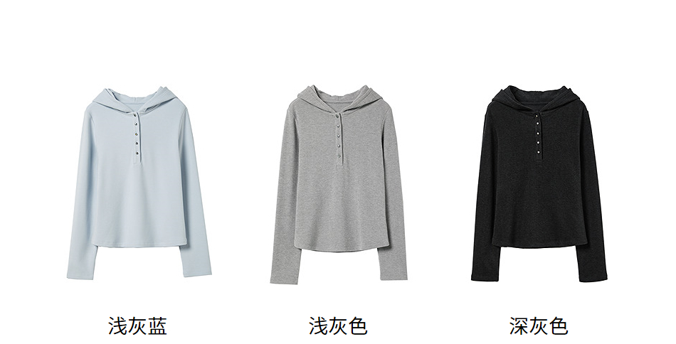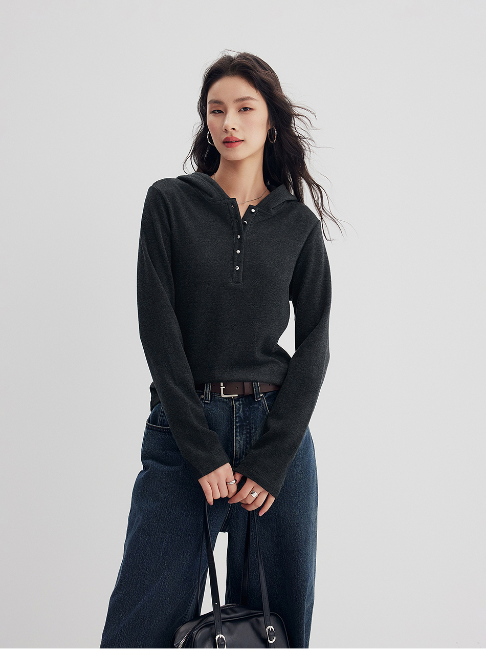 棉仓357601001-小银豆牙签纹肌理感暖感绒兜帽合体微修身长袖T
