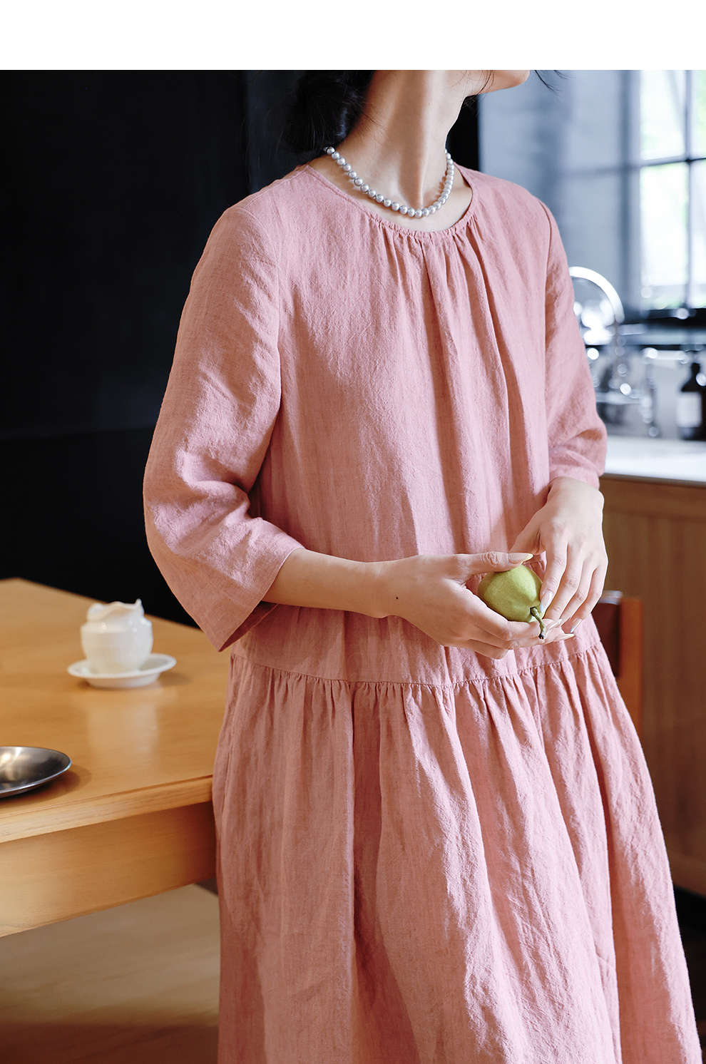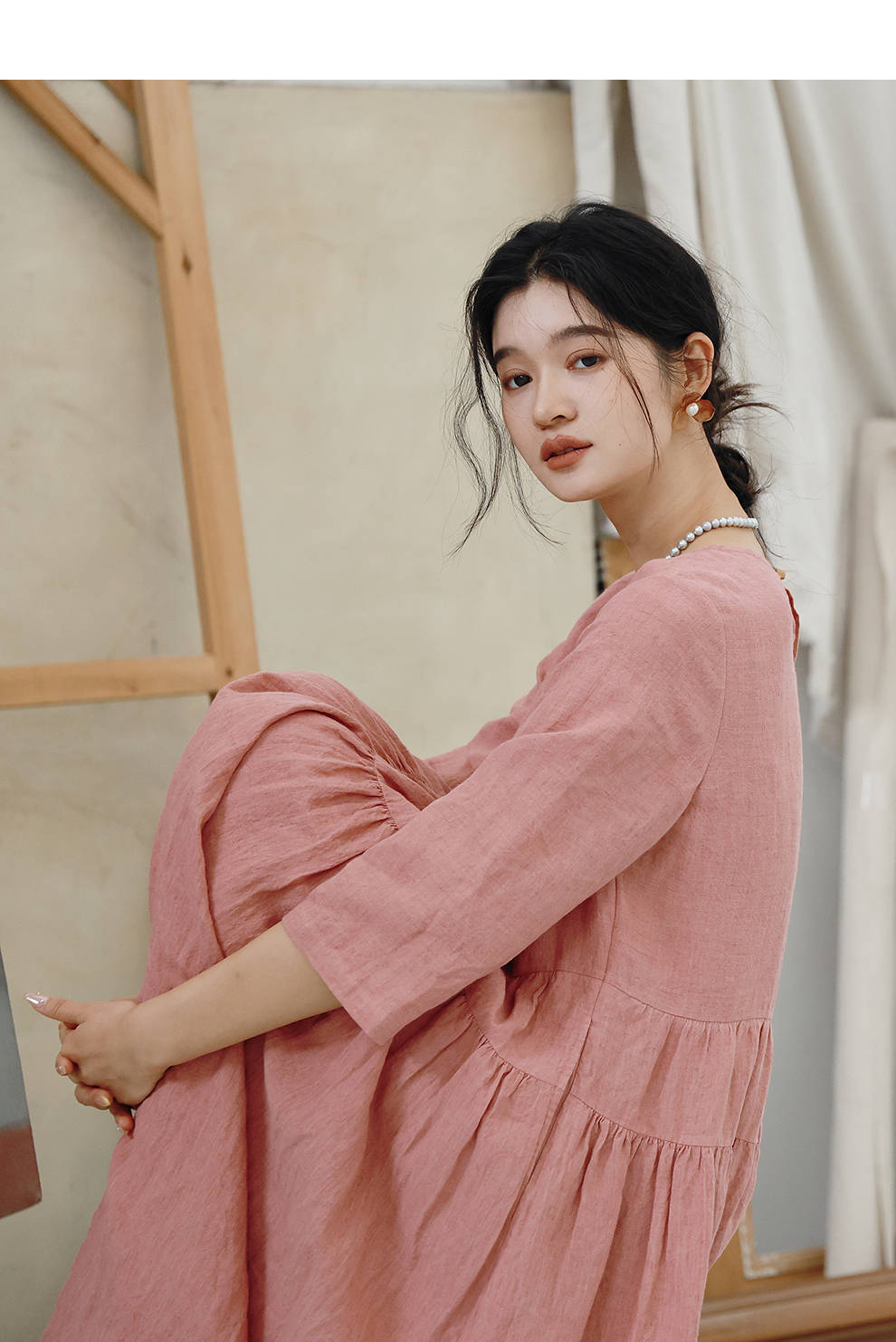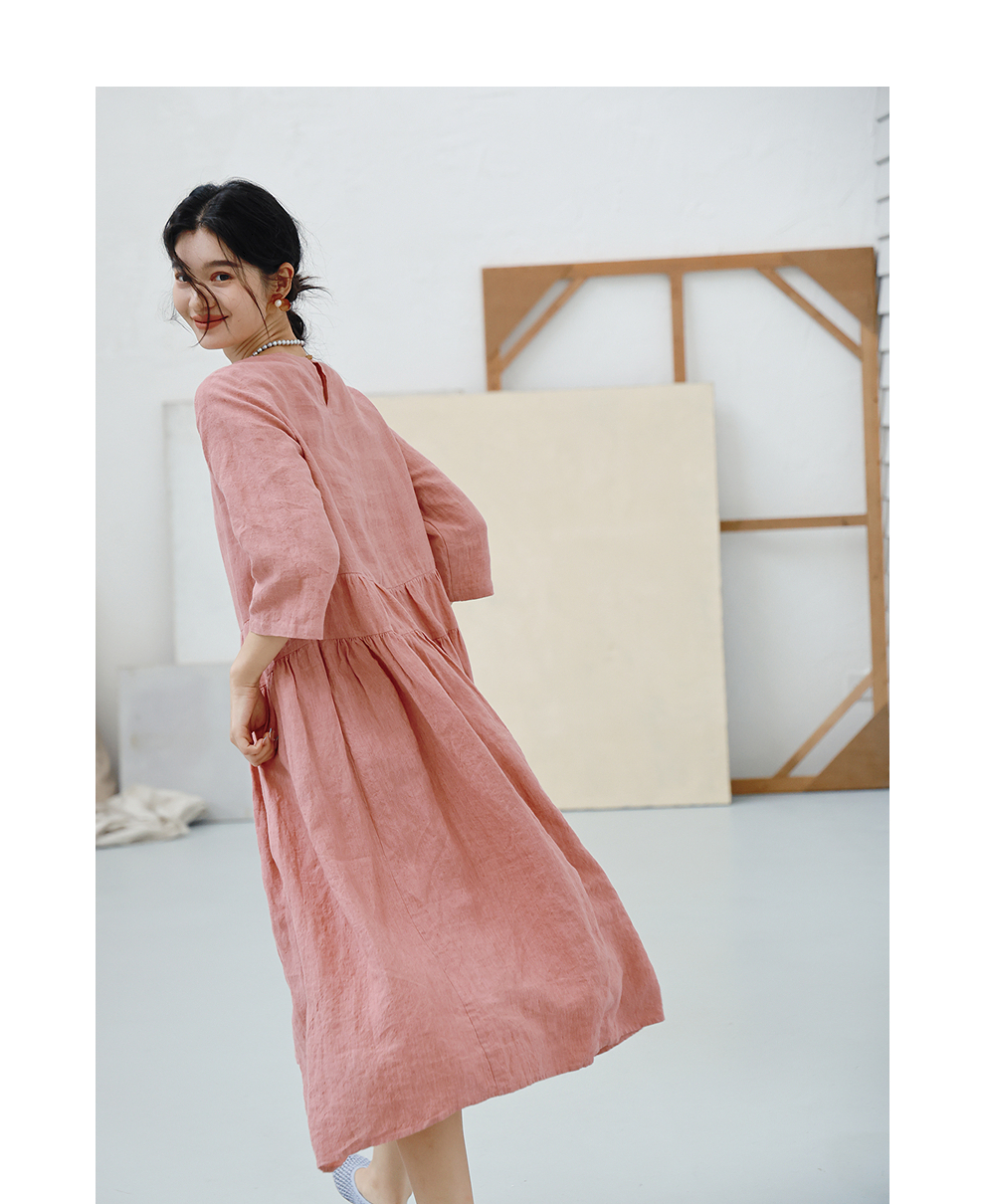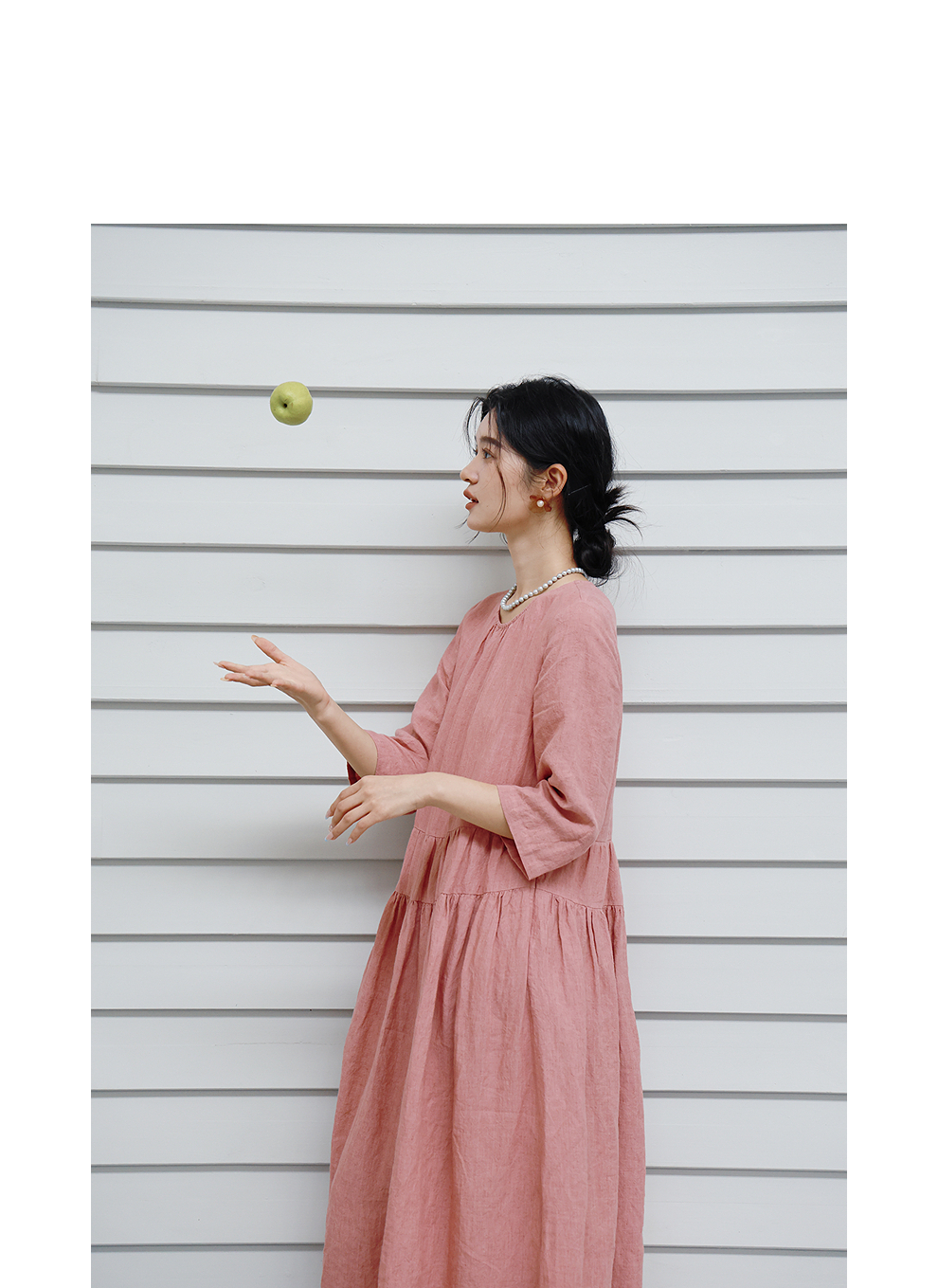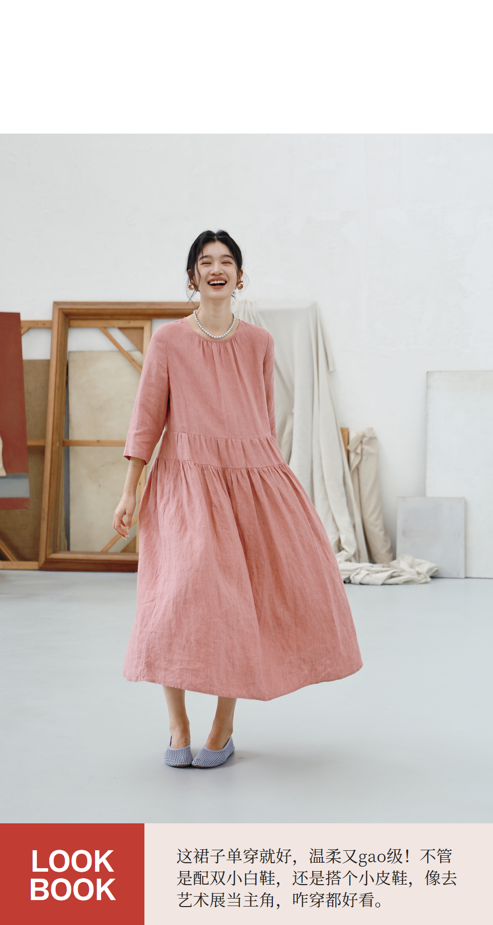 绽放417朵/【莫兰迪系列】高端酵素洗重磅色织亚麻七分袖连衣裙女