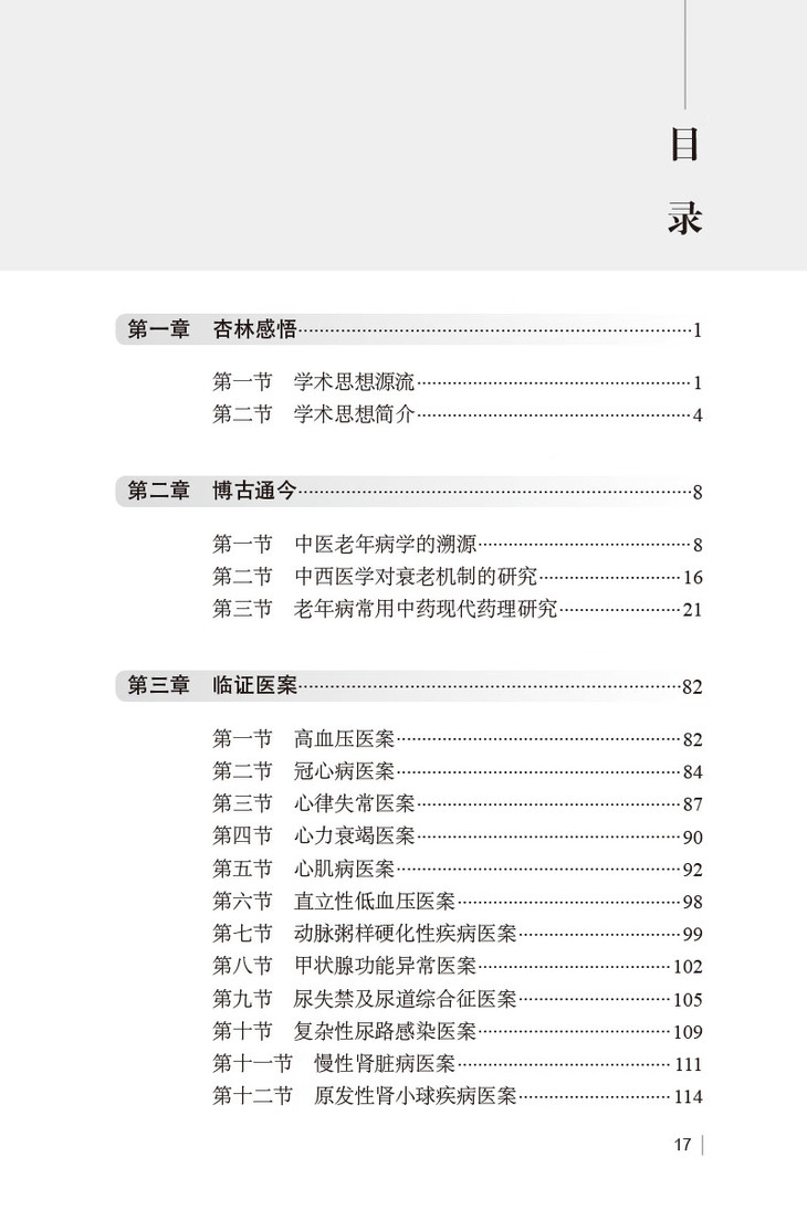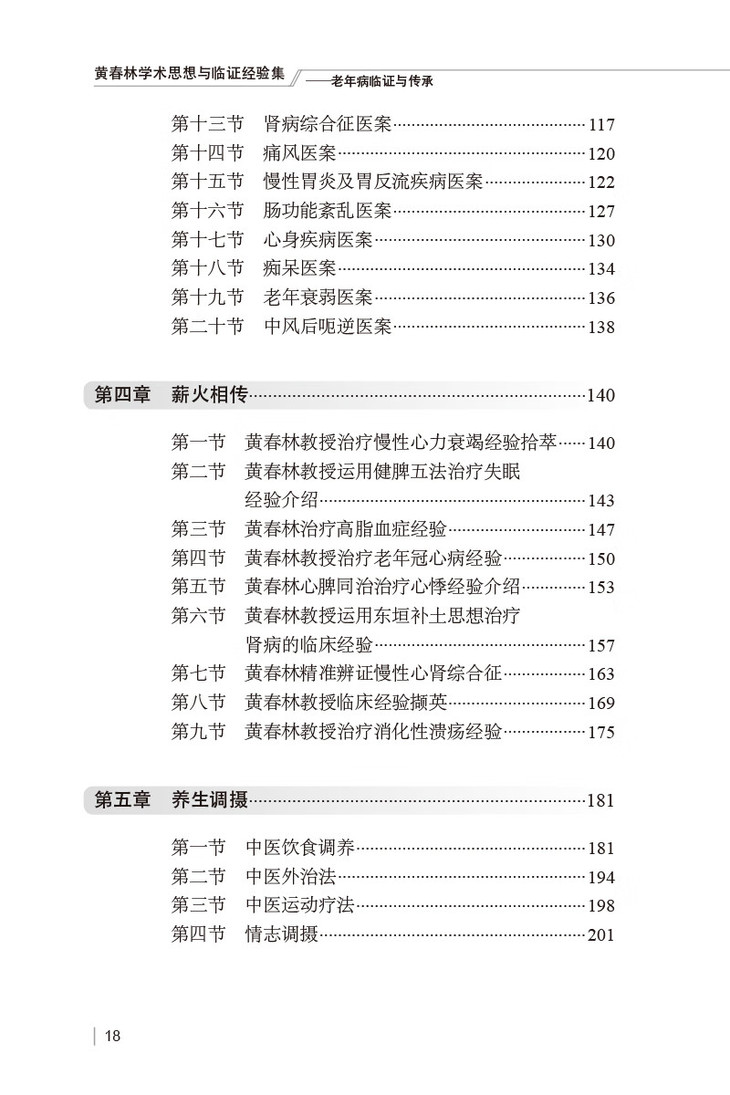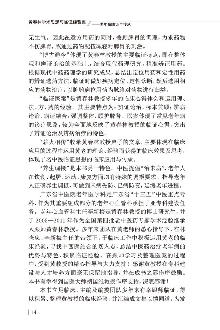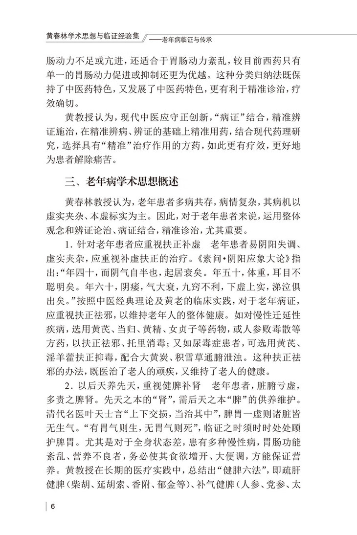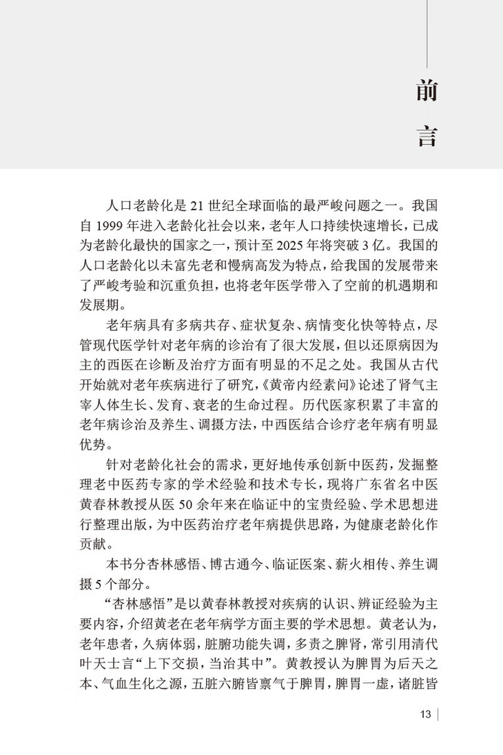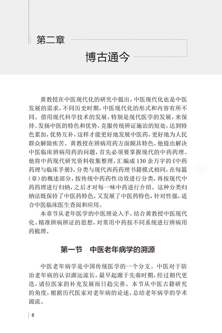 本书分杏林感悟、博古通今、临证医案、薪火传承、养生调摄5个部分。 杏林感悟是以黄春林教授对疾病的认识,辨证经验为主要内容,介绍黄老在老年病学方面主要的学术思想;如黄老认为,老年病人,久病体弱,脏腑功能失调,多责之脾肾,因常引用清代叶天士言:“上下交损,当治其中”。黄教授认为脾胃为后天之本,气血生化之源,五 脏六腑皆禀气于脾胃。脾胃一虚,诸脏皆无生气。因此在遣方用药的同时兼顾脾胃的调理,力求药 物不伤脾胃,或通过药物的配伍减轻对脾胃的刺激。 博古通今部分,黄春林教授的主要临证特点,是根据现代中药药理学的研究成果,总结出定位用药和定性用药的辨证选药方法,先做好疾病定位、定性诊断,然后选用相应的药物治疗,以脏腑病位用药为脉络,对药物进行归类,涉及九大病类,21章节,在整体观和辨证论治的基础上,结合现代药理研究,精准辨证和用药。