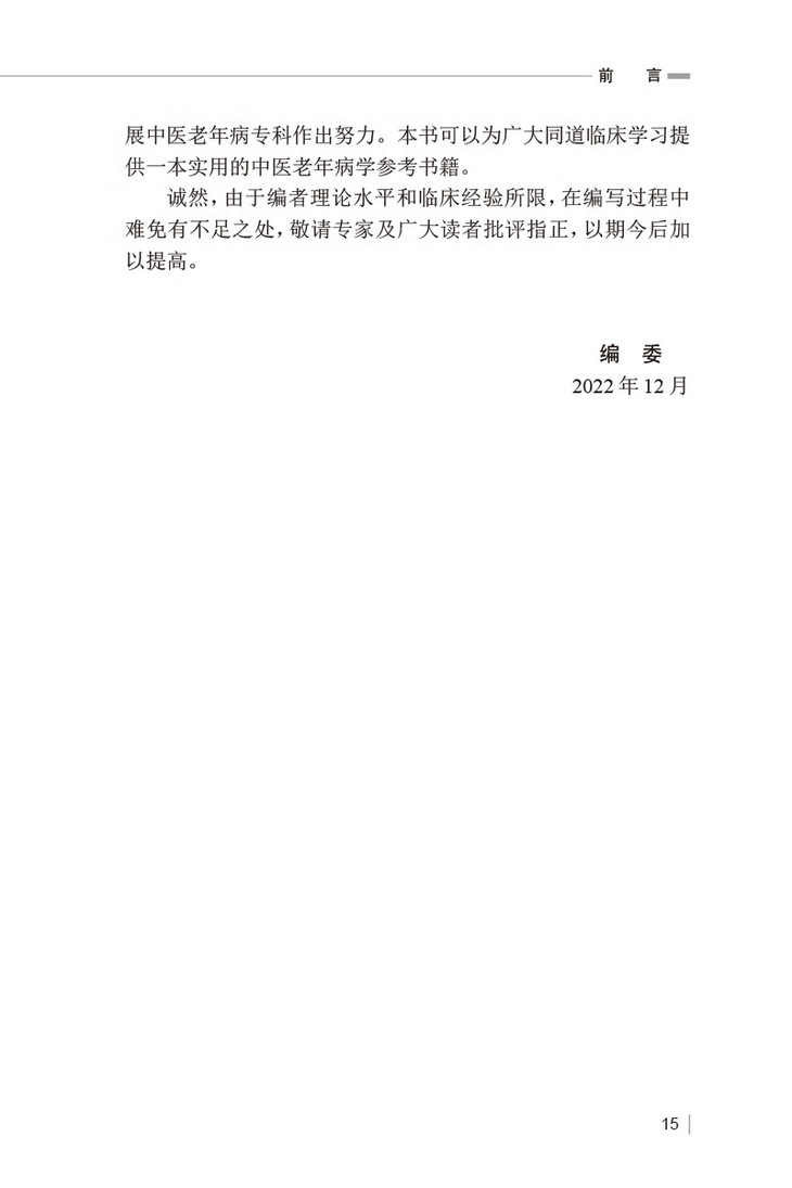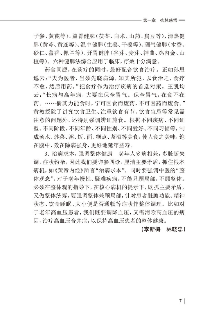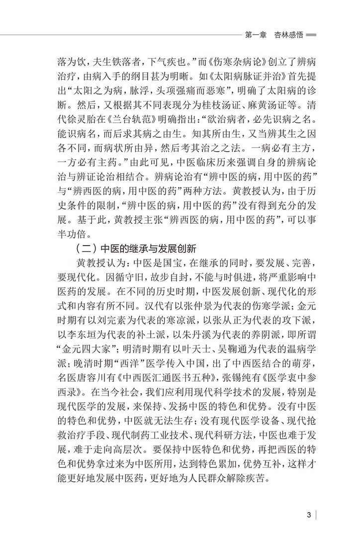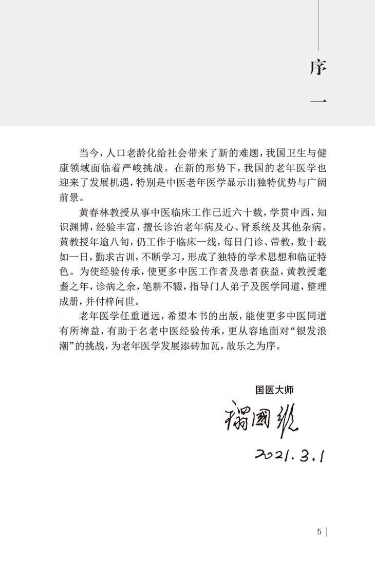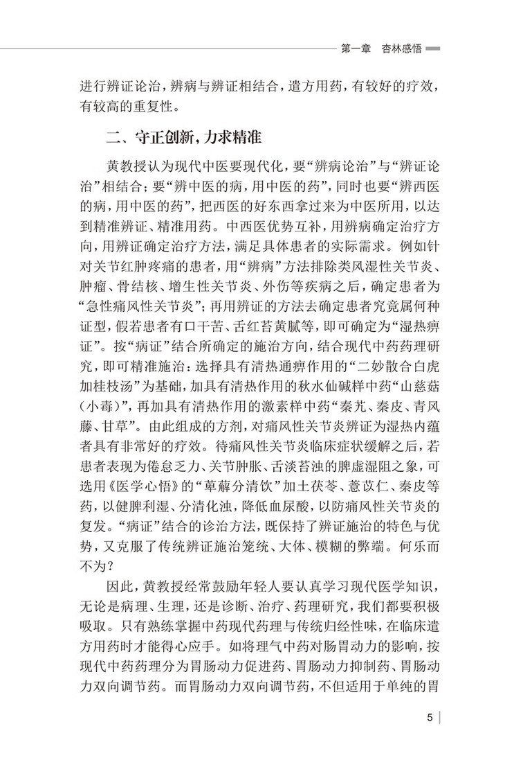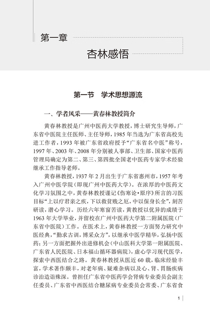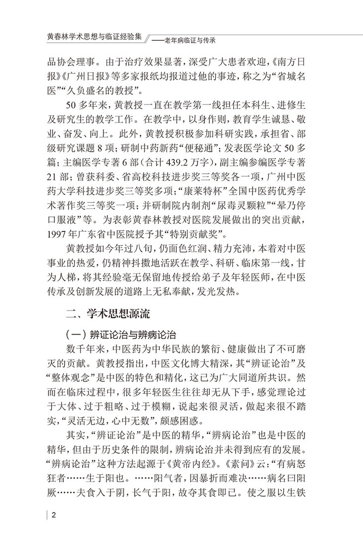本书分杏林感悟、博古通今、临证医案、薪火传承、养生调摄5个部分。 杏林感悟是以黄春林教授对疾病的认识,辨证经验为主要内容,介绍黄老在老年病学方面主要的学术思想;如黄老认为,老年病人,久病体弱,脏腑功能失调,多责之脾肾,因常引用清代叶天士言:“上下交损,当治其中”。黄教授认为脾胃为后天之本,气血生化之源,五 脏六腑皆禀气于脾胃。脾胃一虚,诸脏皆无生气。因此在遣方用药的同时兼顾脾胃的调理,力求药 物不伤脾胃,或通过药物的配伍减轻对脾胃的刺激。 博古通今部分,黄春林教授的主要临证特点,是根据现代中药药理学的研究成果,总结出定位用药和定性用药的辨证选药方法,先做好疾病定位、定性诊断,然后选用相应的药物治疗,以脏腑病位用药为脉络,对药物进行归类,涉及九大病类,21章节,在整体观和辨证论治的基础上,结合现代药理研究,精准辨证和用药。