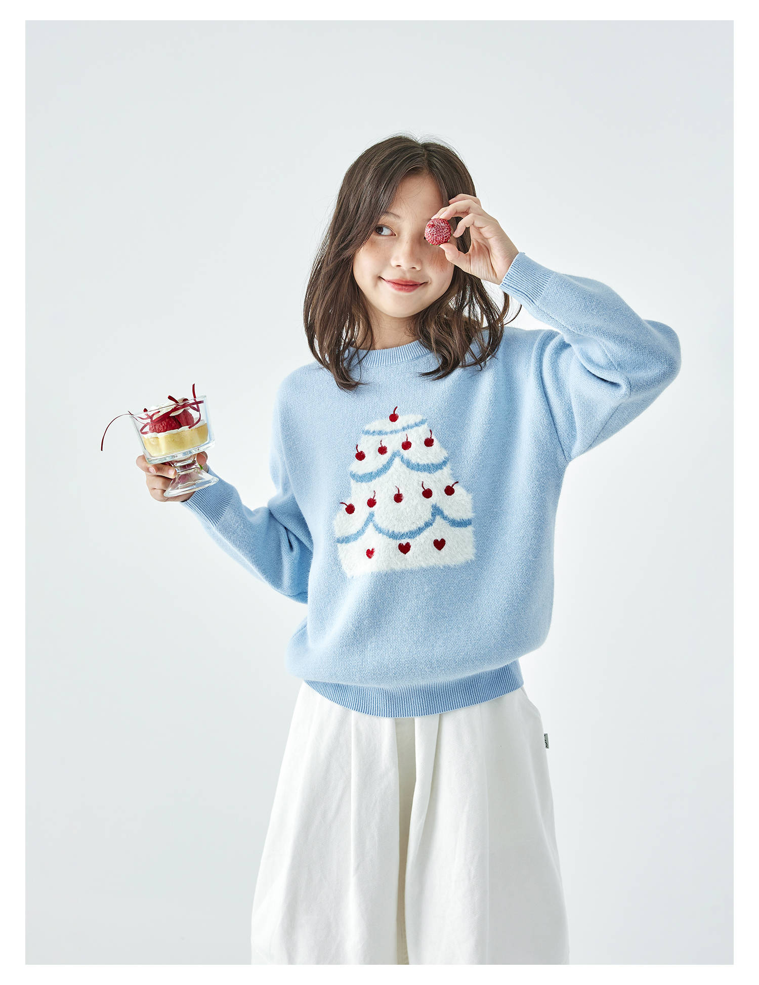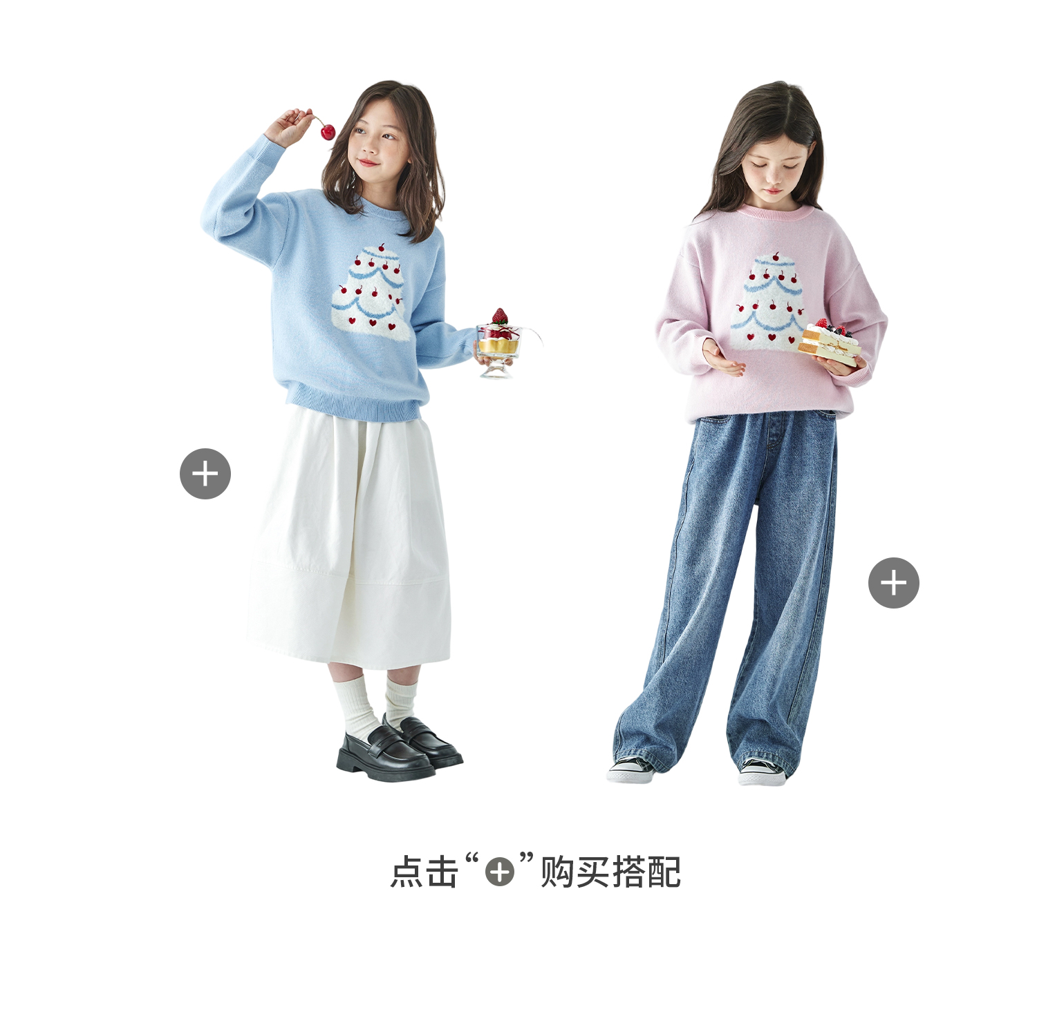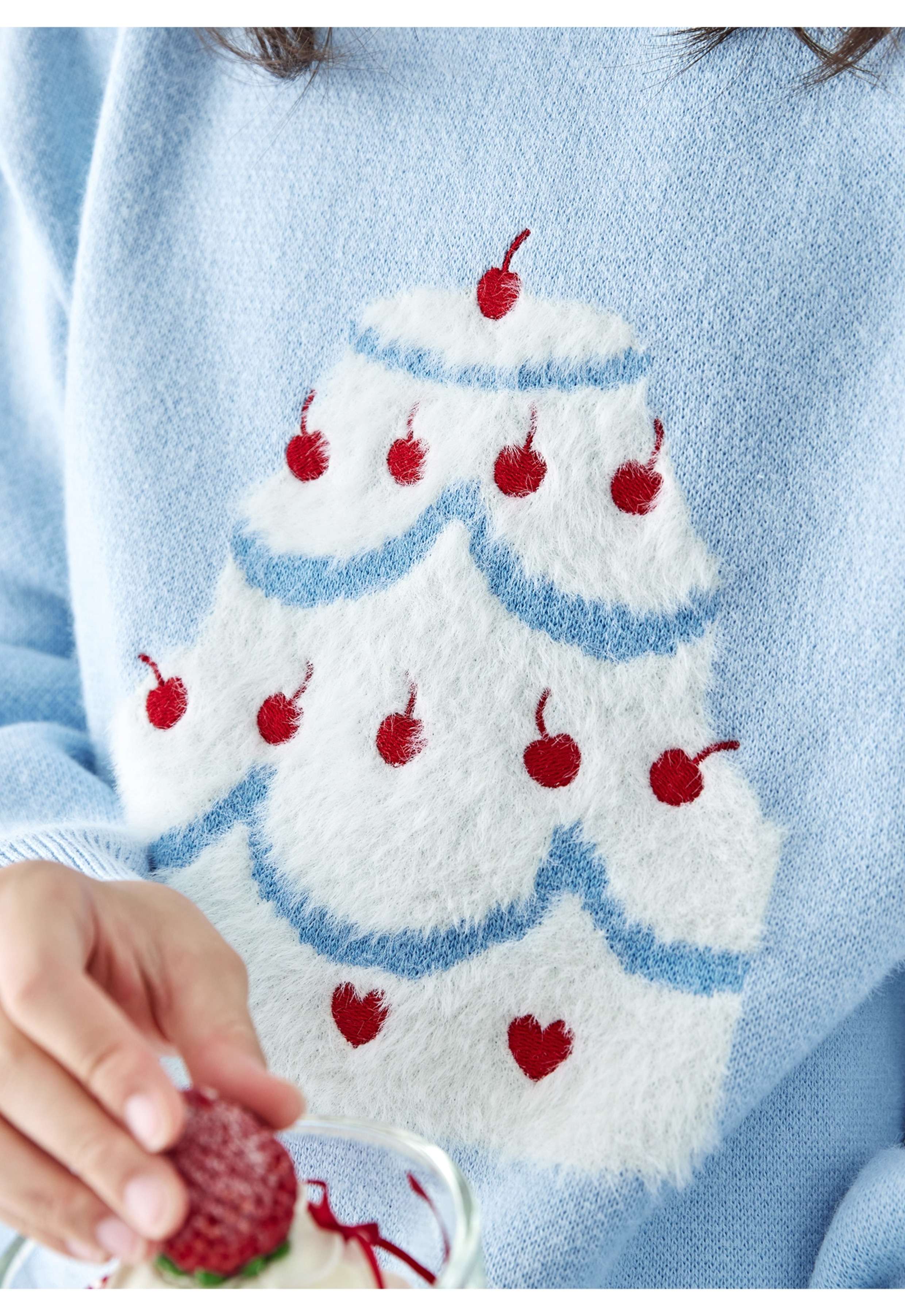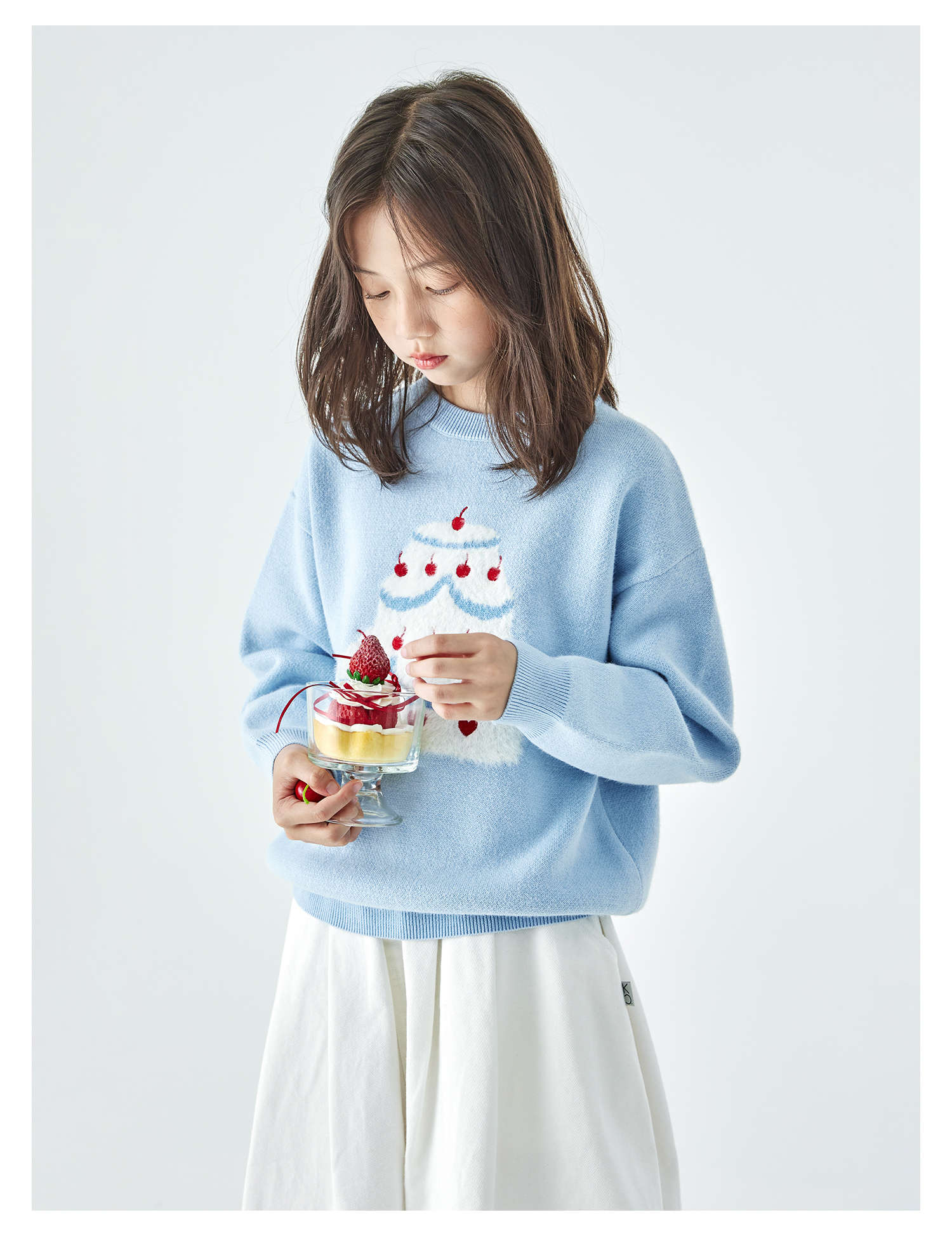 棵初2025年秋季新款亲子中大女童樱桃蛋糕毛衣宽松落肩浅色上衣