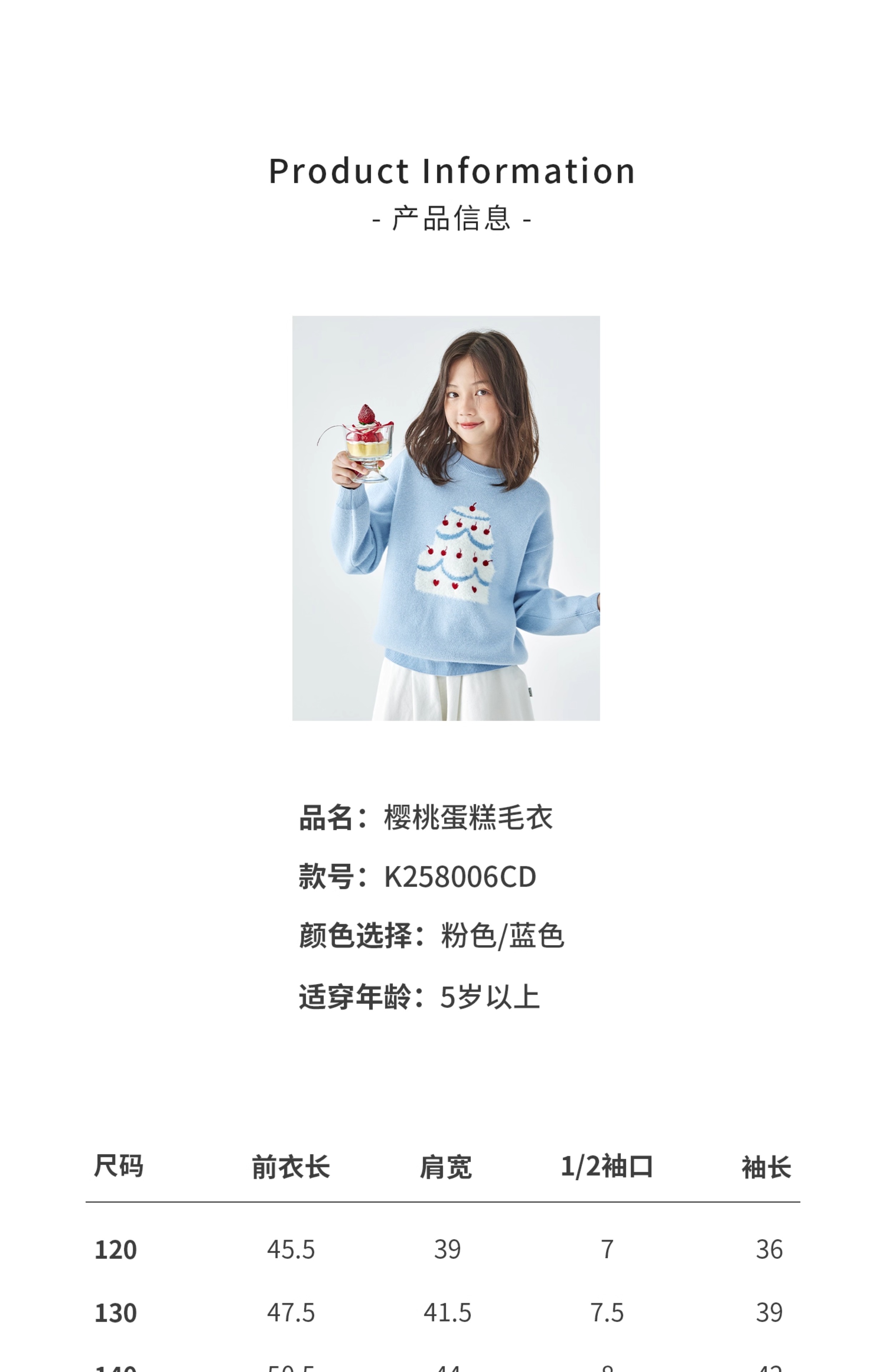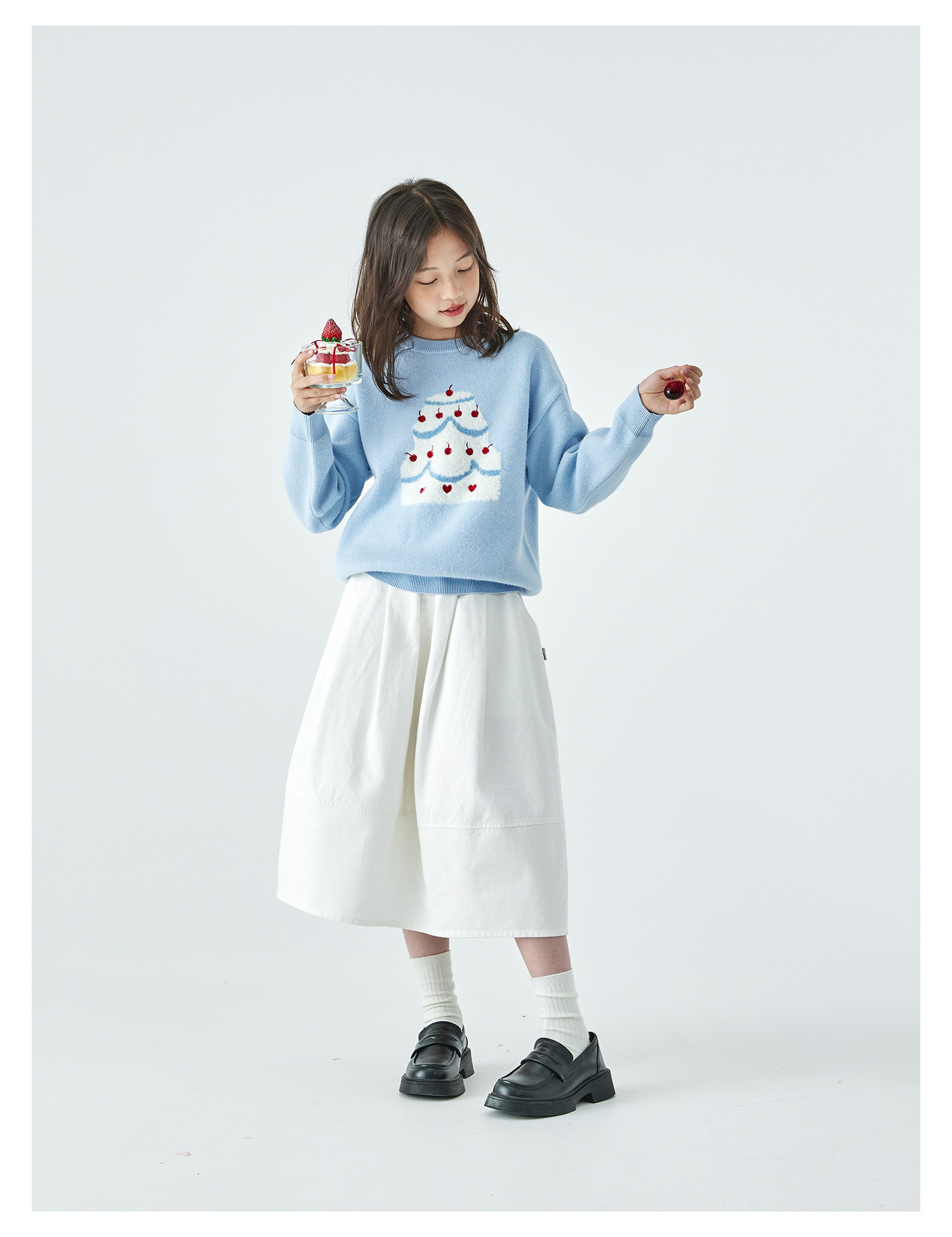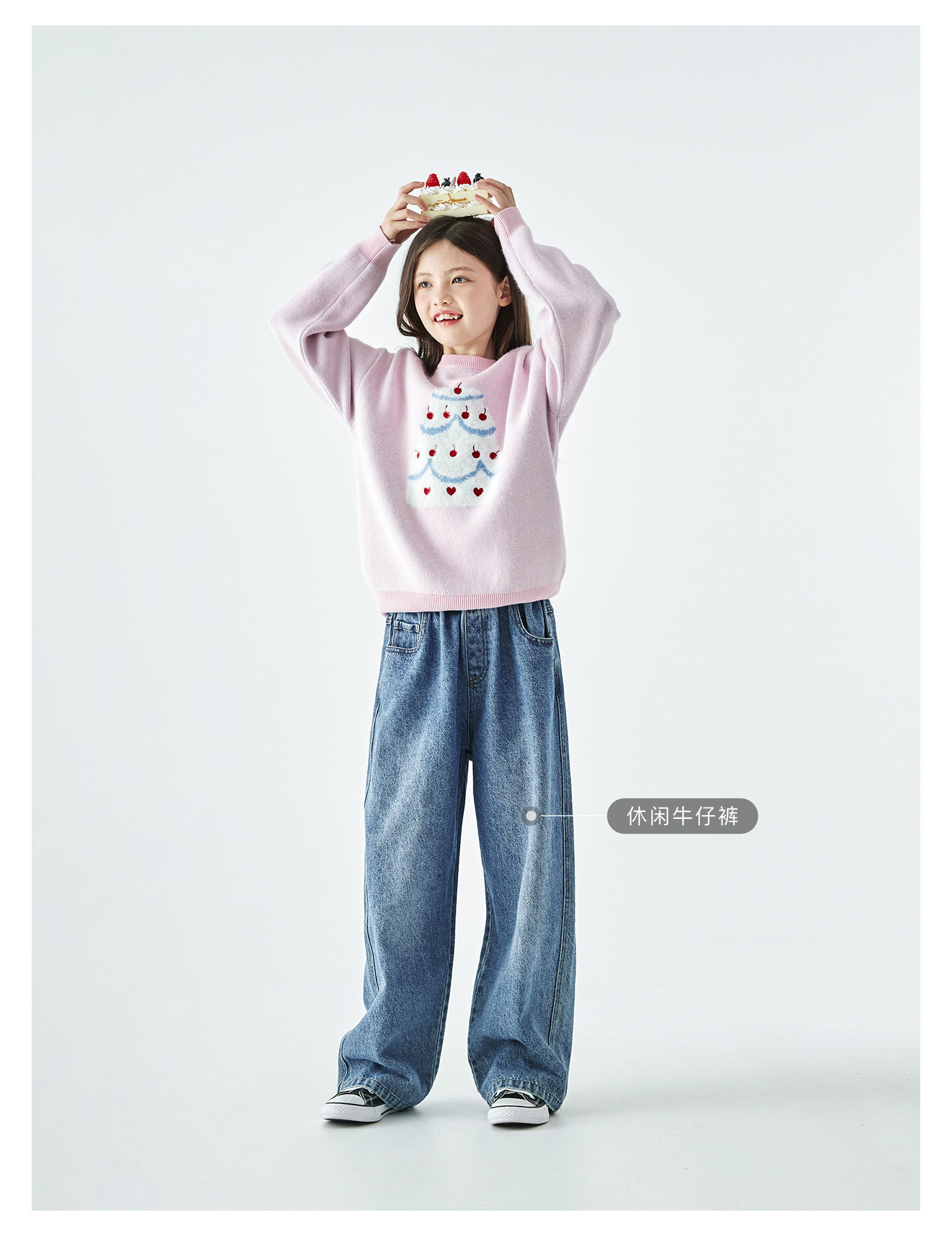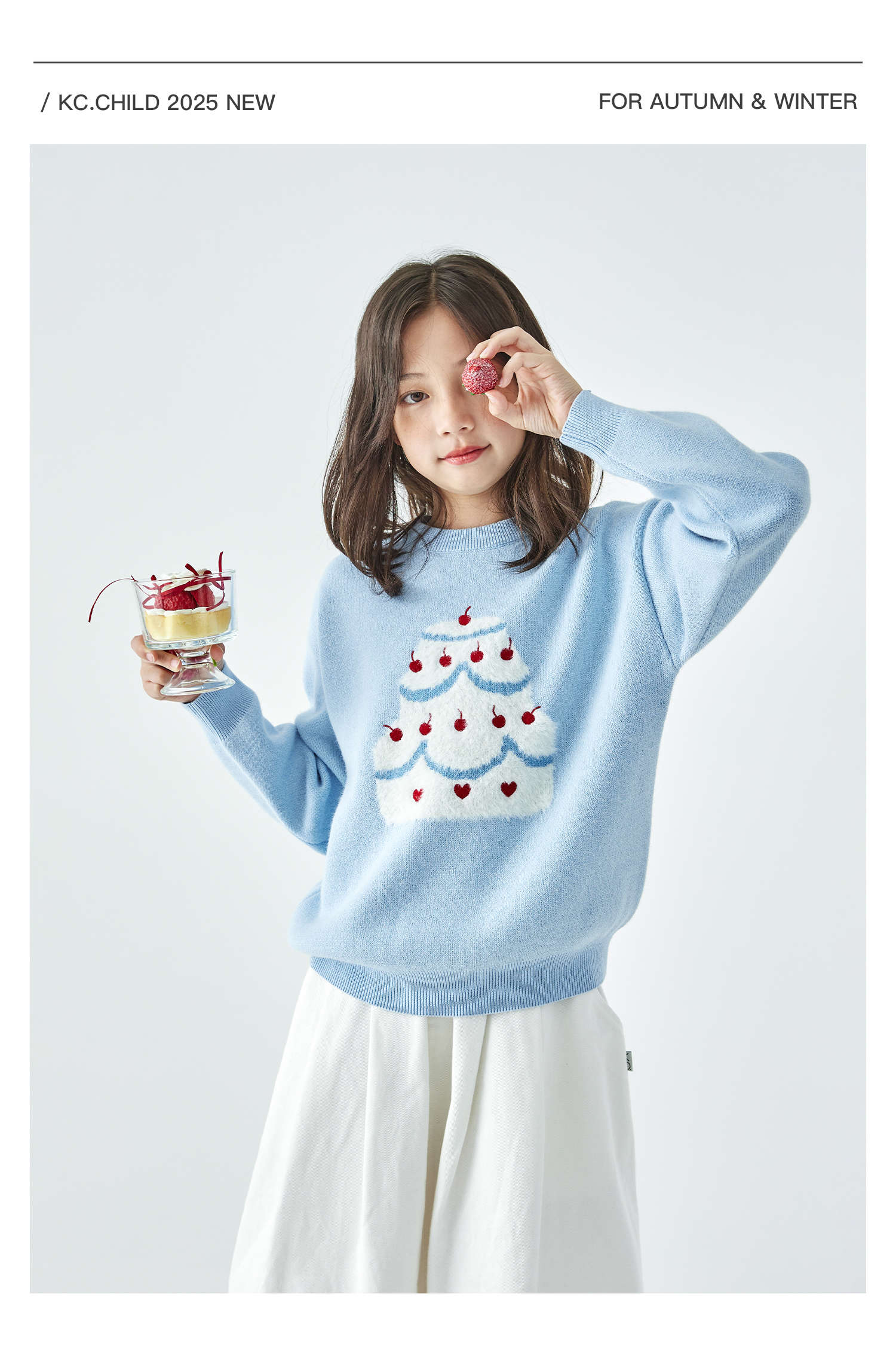 棵初2025年秋季新款亲子中大女童樱桃蛋糕毛衣宽松落肩浅色上衣