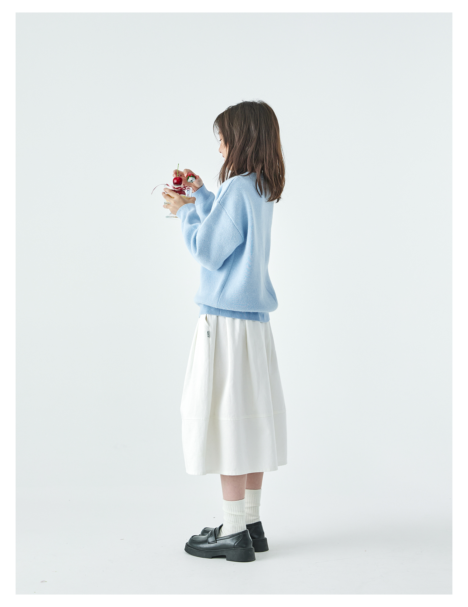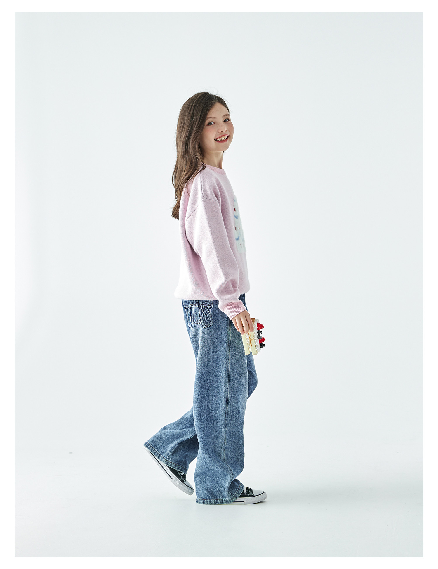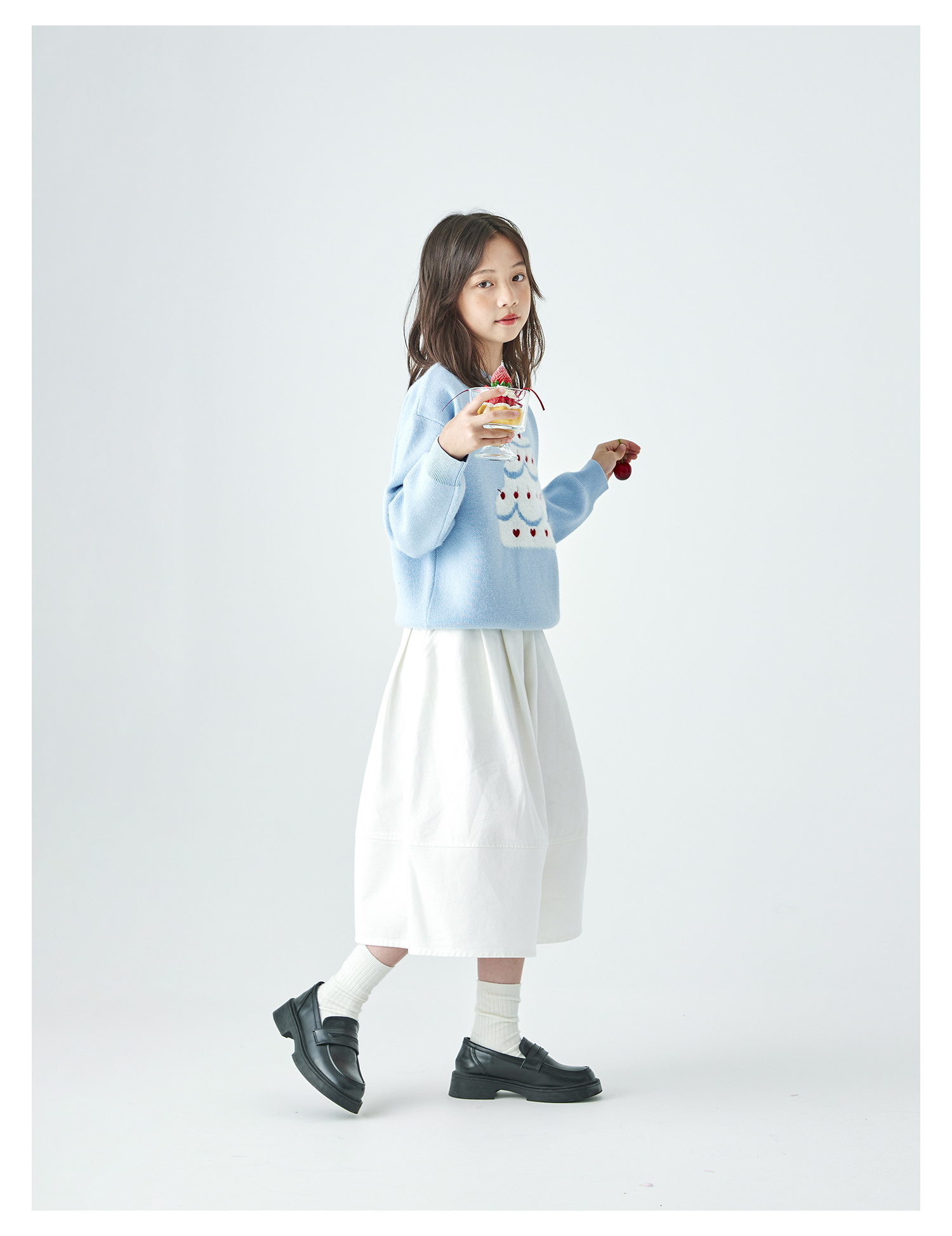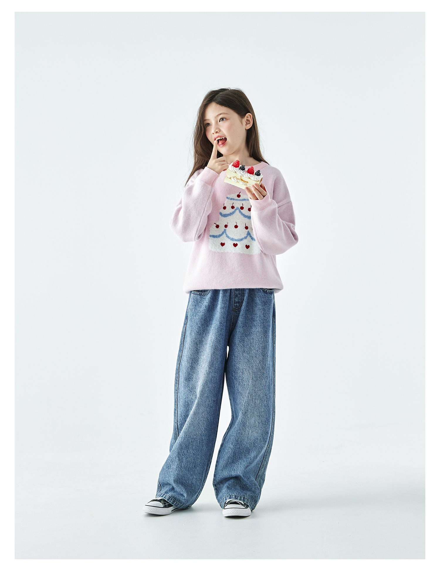 棵初2025年秋季新款亲子中大女童樱桃蛋糕毛衣宽松落肩浅色上衣
