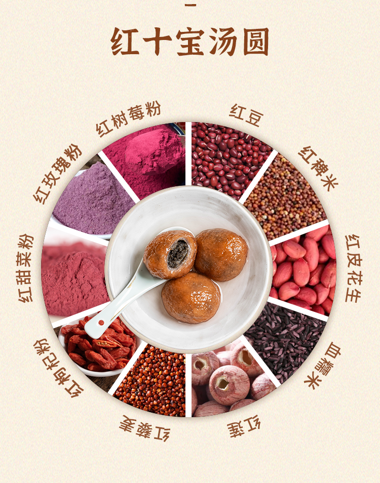 【配料表】藕粉、生活饮用水、红豆、稻米油、罗汉果、猪油、红稗米、红皮花生、血糯米、红莲、红藜麦、红枸杞粉、红甜菜粉、红玫瑰粉、红树莓粉、玉灵膏(西洋参、桂圆肉、红糖)、金桔