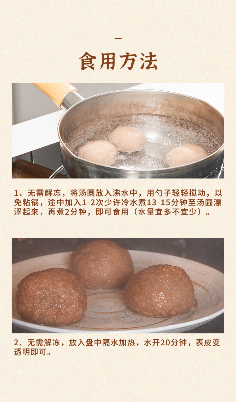 ①无需解冻,将藕粉圆放入沸水中,用勺子轻轻搅动以免粘锅,途中加入1-2次少许冷水煮13-15分钟至汤圆漂浮起来,再煮2分钟,即可食用(水量宜多不宜少)