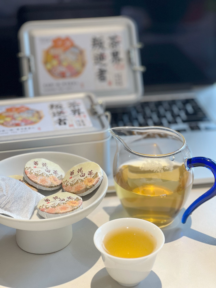 一朵一泡,有白茶茶香蜜韵+菊花清冷药香,入口甘甜柔滑,后调微苦回甘