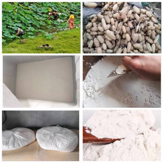 藕粉的制作流程:釆藕、里外洗藕、沉淀藕浆、刮藕浆、烘干、再细研磨。