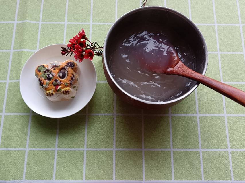 两勺藕粉,加少量凉水调溶,再边搅拌边倒入刚烧开的开水即成。