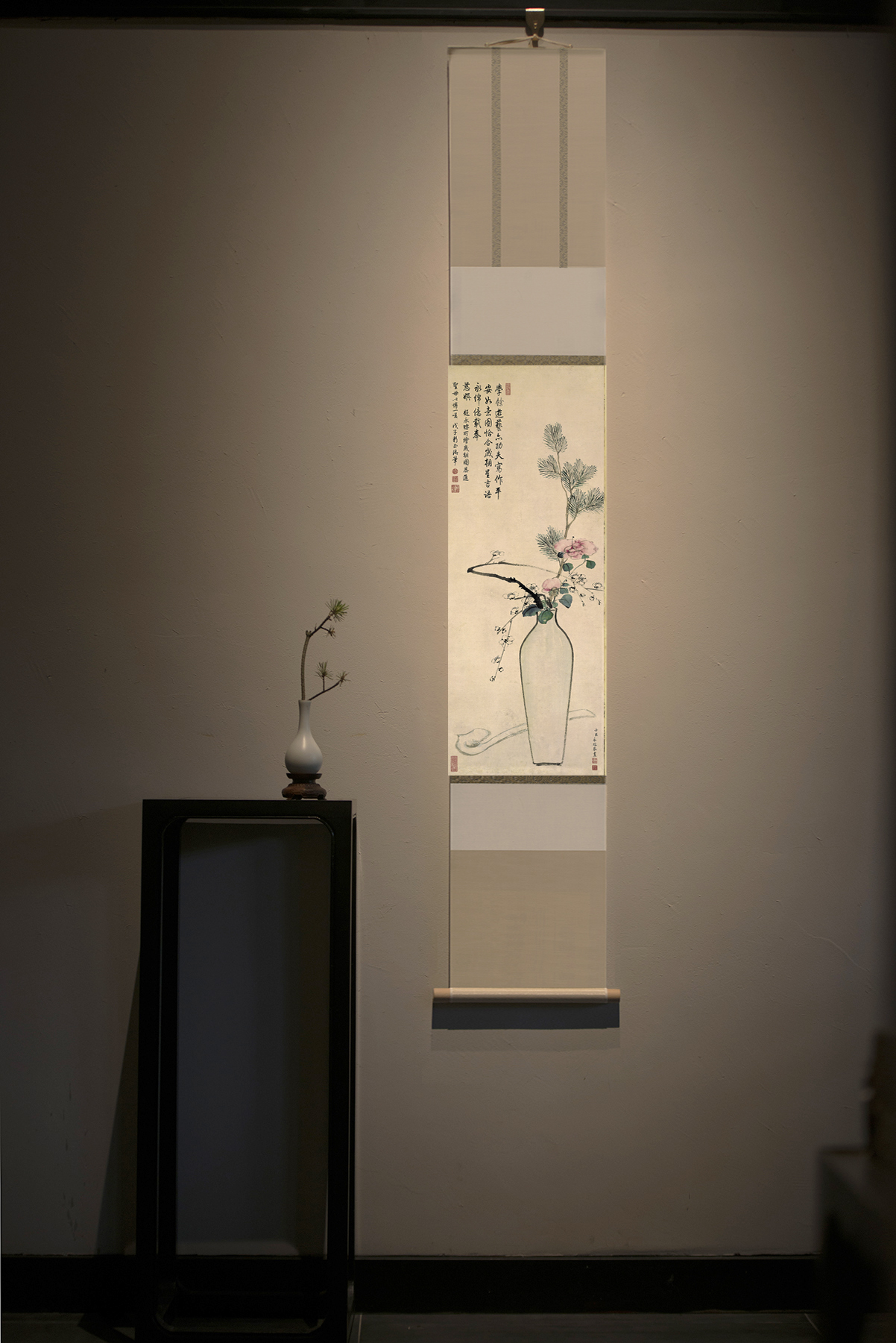 此图绘写松枝、梅花等插于花瓶之内,下陈如意一柄,设色轻淡,布局简洁,颇具文人雅趣。永瑢借花瓶、如意隐喻“平安如意”的吉祥含义,松枝、梅花则表达出长寿的祝福意愿。乾隆皇帝于乾隆三十三年(1768年)正月御书七绝一首,题跋恭呈孝圣太后,设色画松、梅、茶花、瓶、如意等,寓意“平安如意”,表示吉祥和祝福。该画以淡墨干笔勾勒花瓶,设色淡雅,颇具文人雅趣。