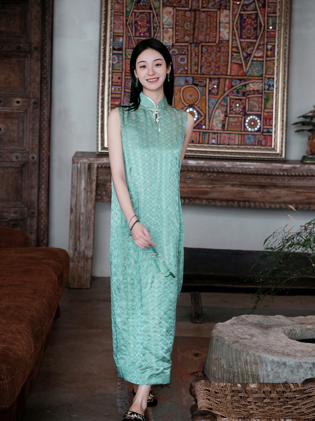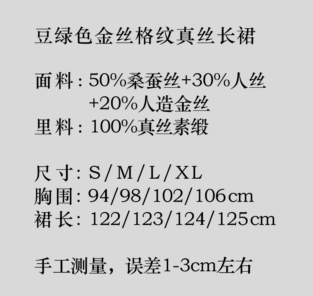 盛唐牡丹 |豆绿色金丝格纹真丝长裙