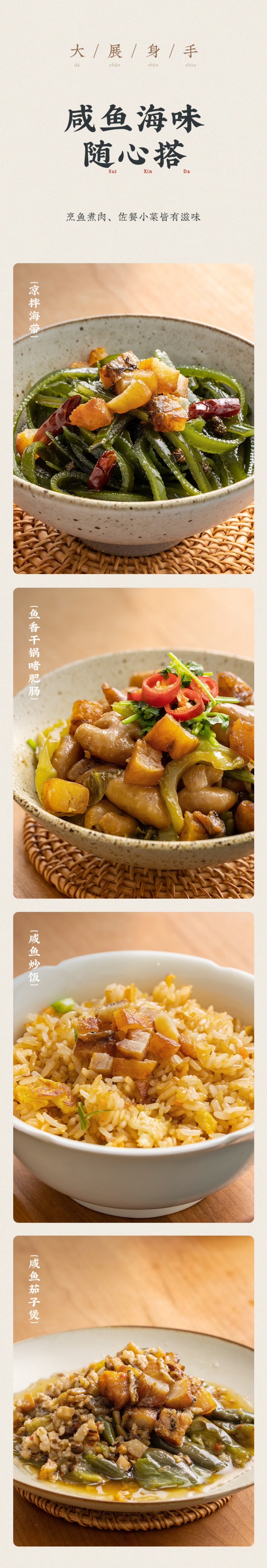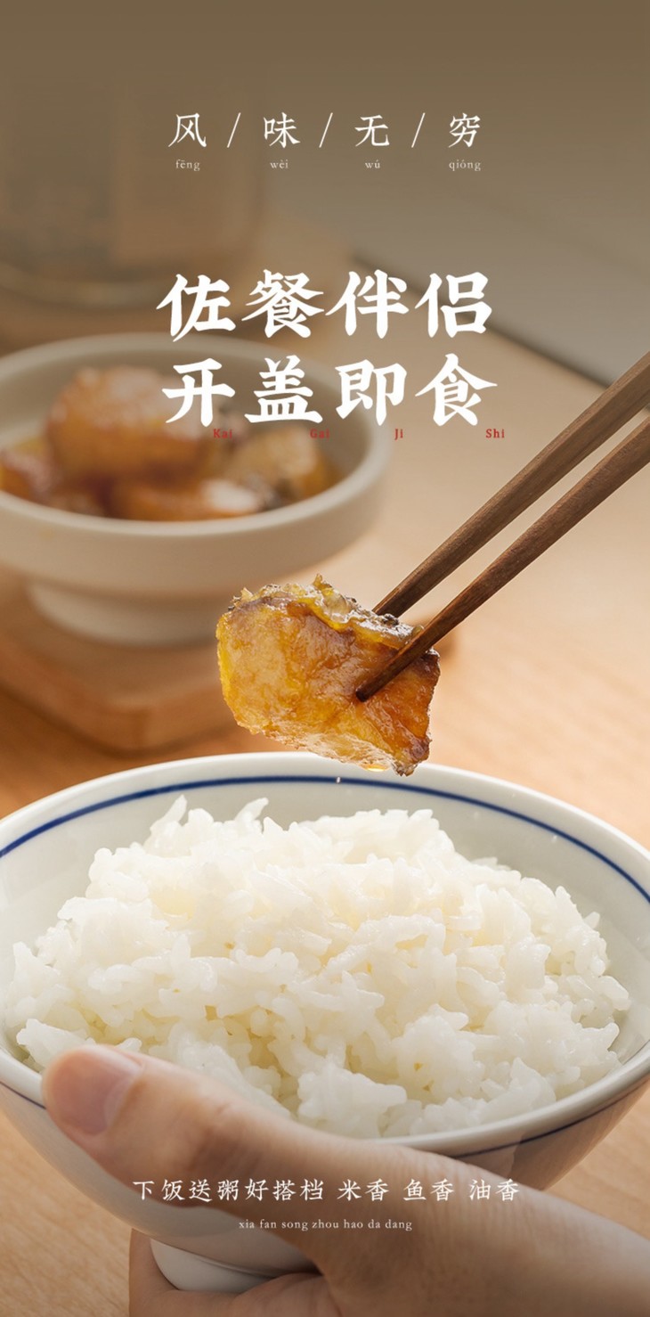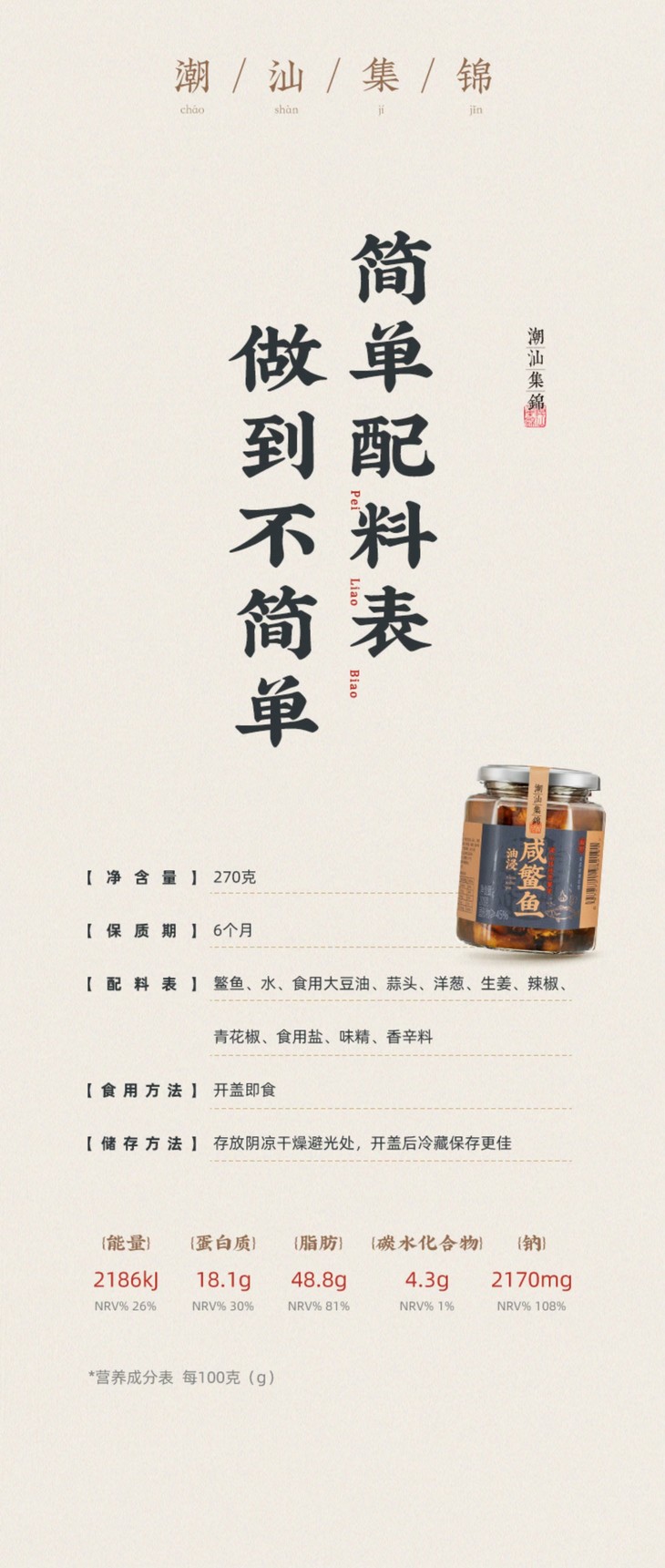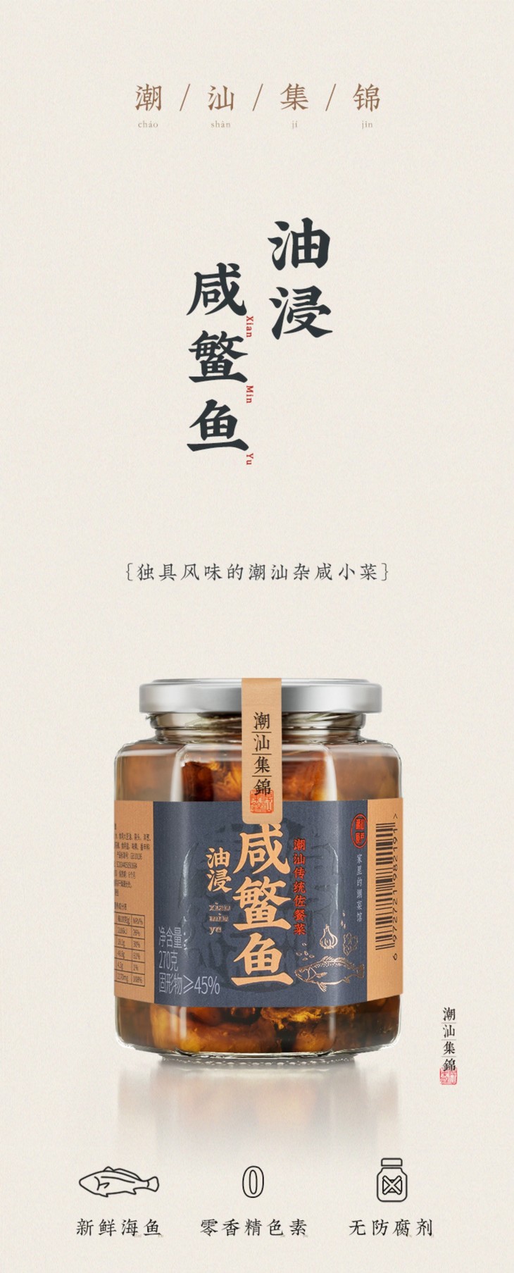油浸咸鳘鱼用的是经典玻璃瓶装,确保鲜香持久不流失,不仅是一道美味的小菜,更是加分小神器!直接开罐食用,咸鲜可口,下饭绝佳,配粥更是无敌了,还可以用来拌蔬菜炒肉菜,给平淡的小菜添上特别的潮汕味道!
