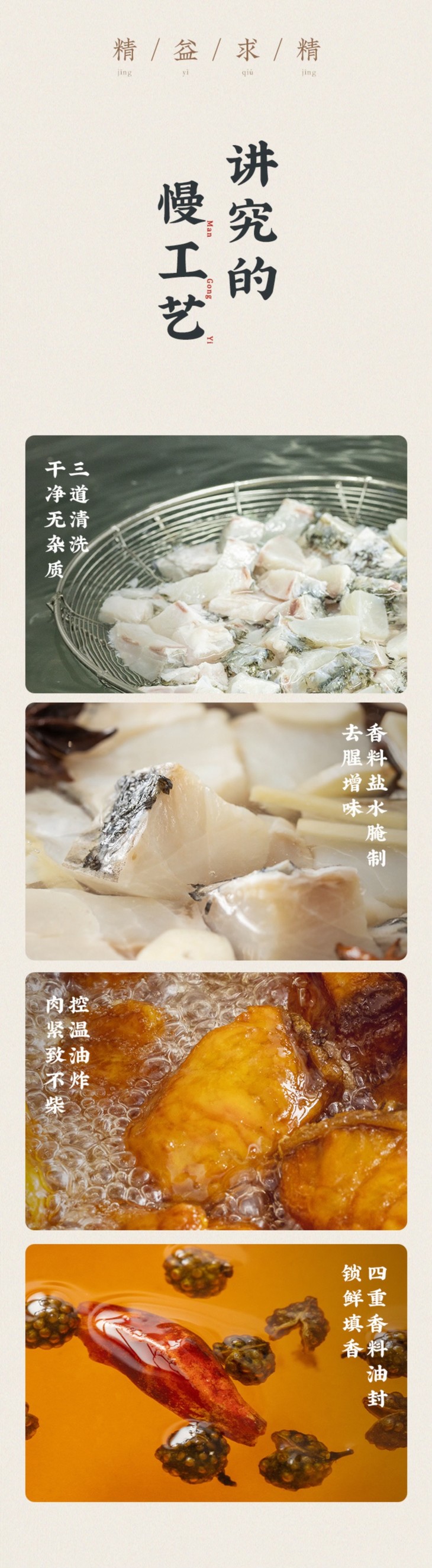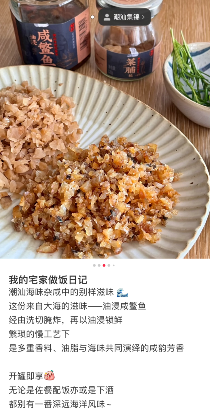 潮汕咸鳘鱼的制作工艺讲究细致与耐心,从选材到成品,每一步都体现了对品质的追求。品牌只选用20斤以上的新鲜大鳘鱼,拒绝冷冻鱼,新鲜鱼肉纤维结构良好,弹性十足,为咸鳘鱼的口感奠定了基础。鱼肉经过严格清洗,去除杂质,再用盐水腌制,去腥增鲜,在传统工艺中焕发新生。油炸鱼肉外酥里嫩,香气四溢,再加上花椒、辣椒、洋葱和大蒜四种香辛料萃取而成的香油,更是注入灵魂,不仅锁住鲜味,还让咸鱼更加香润可口!每一瓶油浸咸鳘鱼都坚持使用天然食材,无香精、无色素、无防腐剂,放心佐餐!