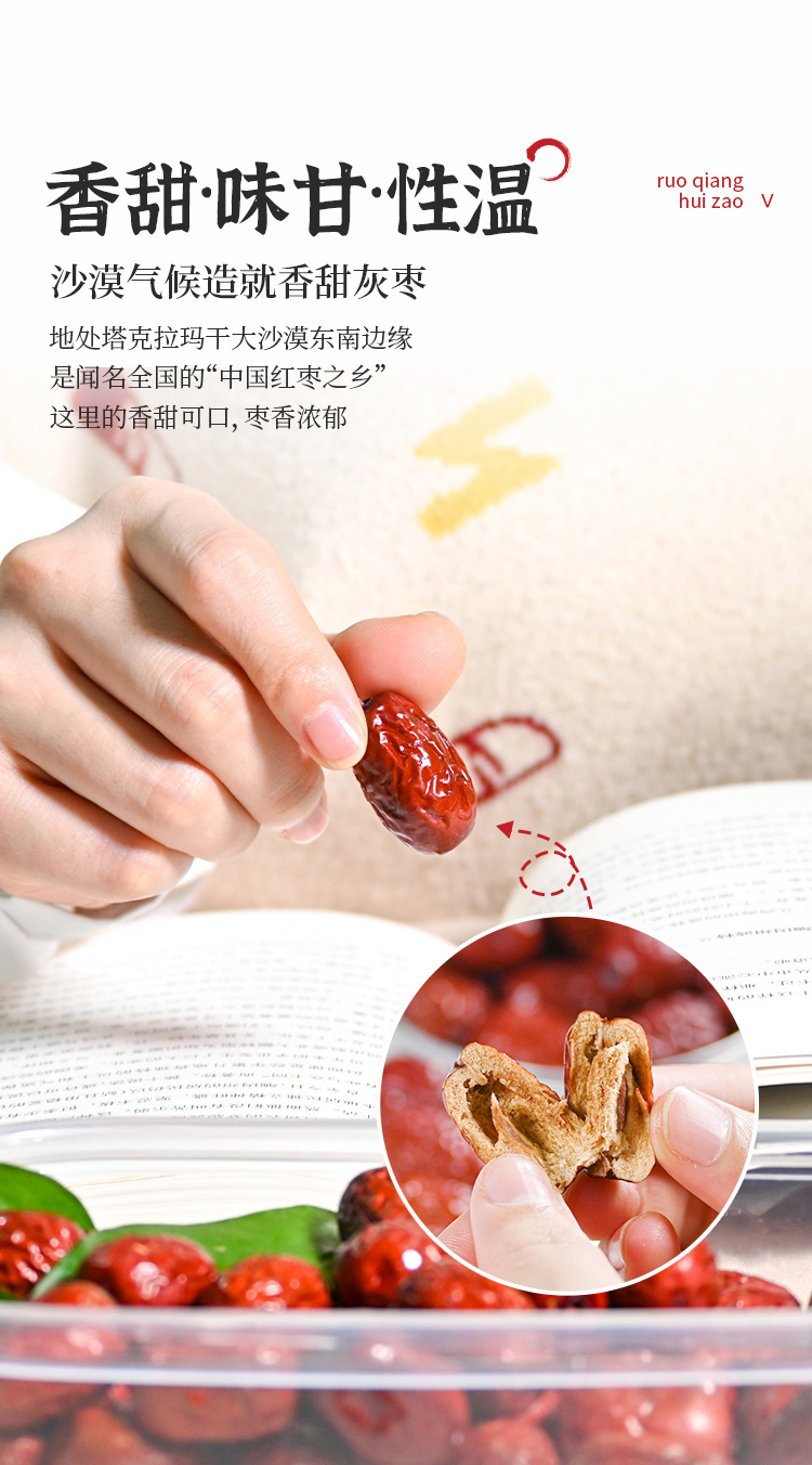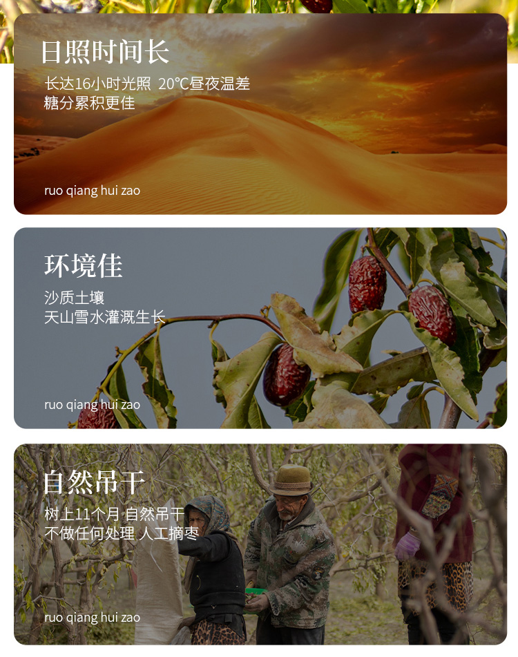 新疆若羌,地处塔克拉玛干大漠东南缘,天山脚下,这里很灰枣有着非常悠久的种植历史,日照充足,昼夜温差大,远离城市污染,极其适合种枣子。喝着天山雪水长大的若羌灰枣,个头小小,但甘甜不腻,口感不是普通枣能相比的。灰枣是在枝头自然风干的,枣瓣发黑,自然成霜,看起来很丑,但糖分封存在红枣里,甜!